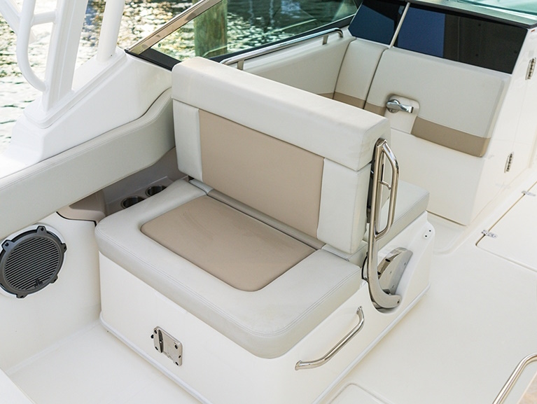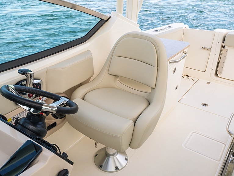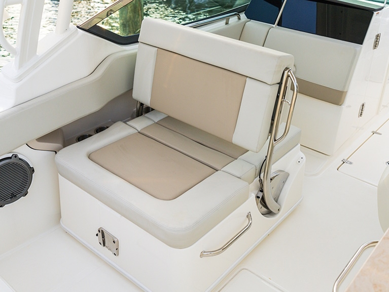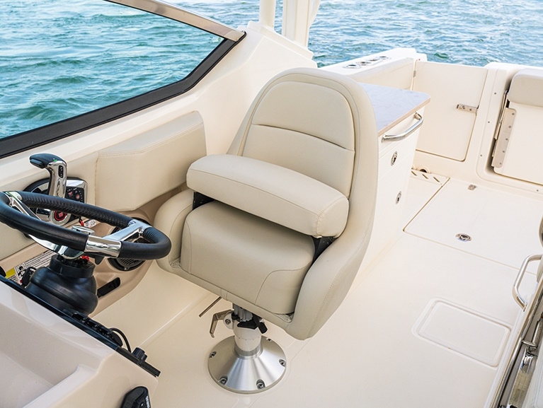 - Deluxe port side helm seat deck seat with armrests, adjustable slide and swivel enabling rotation of the seat inboard