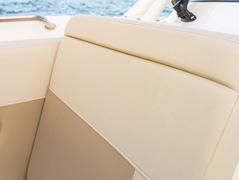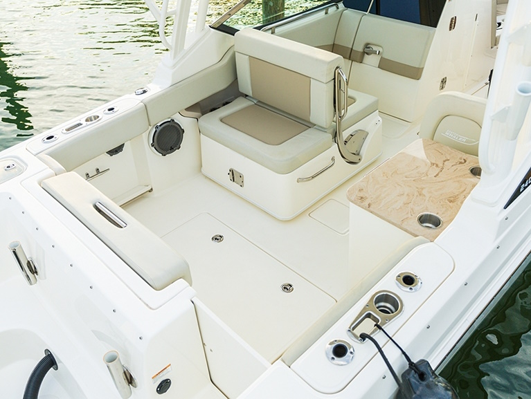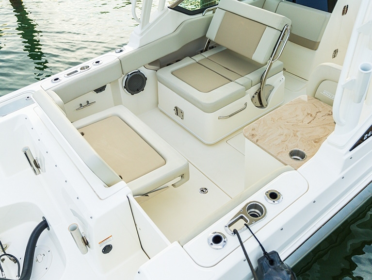 - Deluxe port side helm deck seat with armrests (adjustable slide and swivel enabling rotation of the seat inboard)