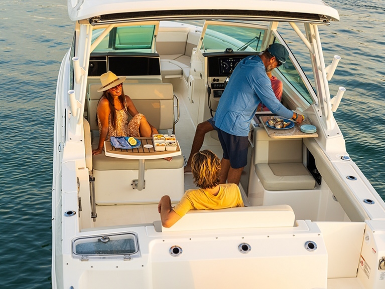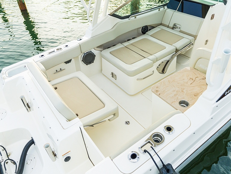 - Versatile cockpit and helm layout, with customizable seating arrangements and grill station placement