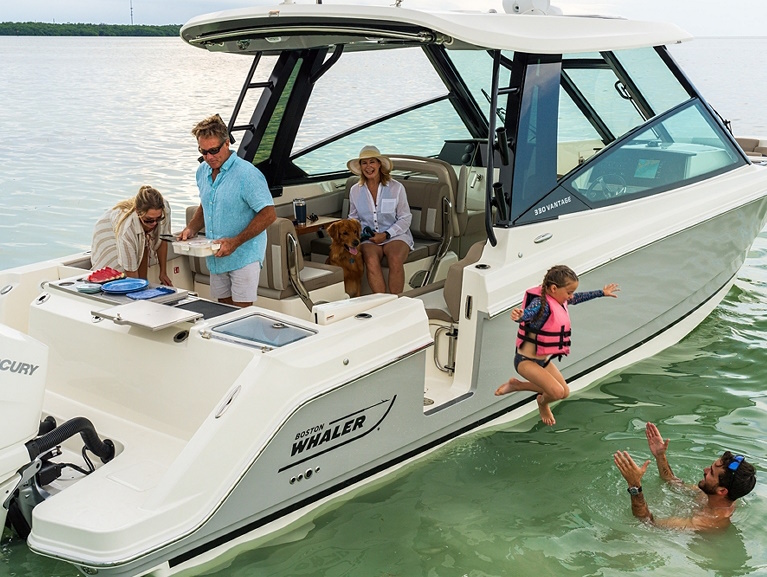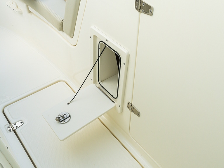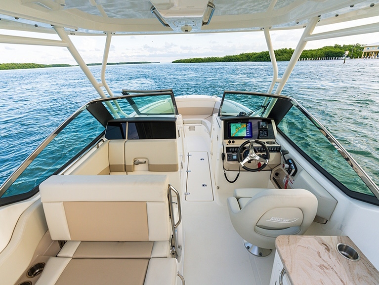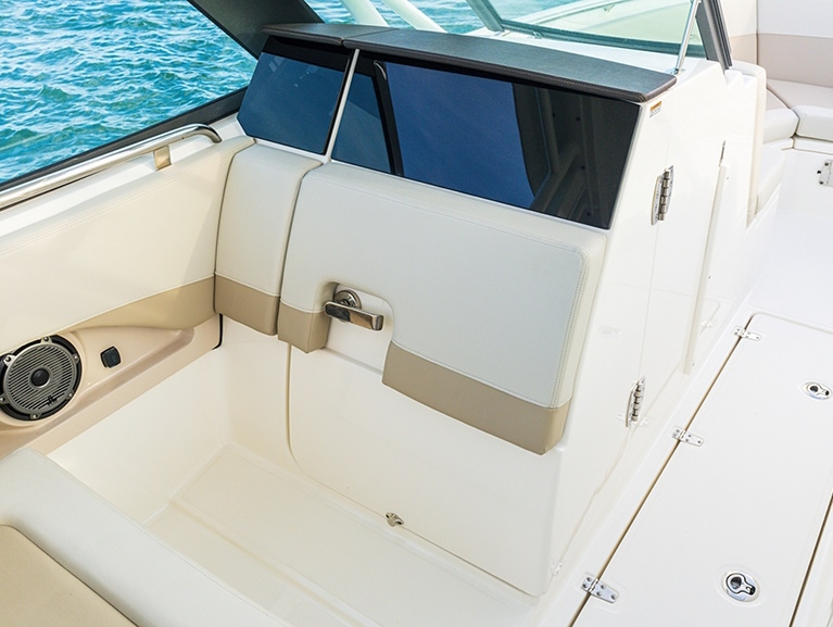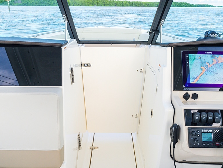 - Nested wind-break door in full windshield provides protection as well as easy bow access.