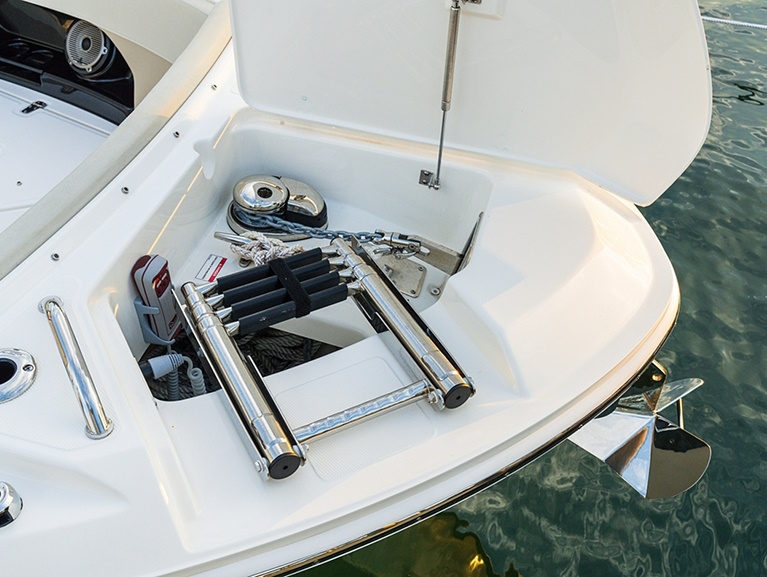 - Windlass - 400’ of rode and chain with handheld remote control, stainless steel swivel, galvanized steel anchor (35 lbs) and polished stainless steel bow roller