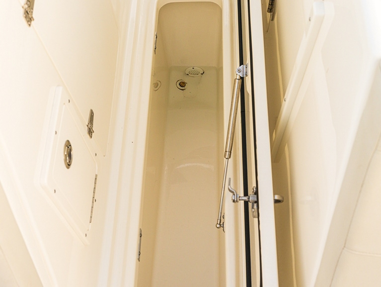 - Molded fiberglass port side dive/boarding door with removable stainless steel dive ladder
