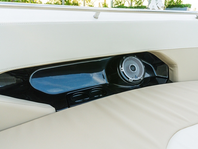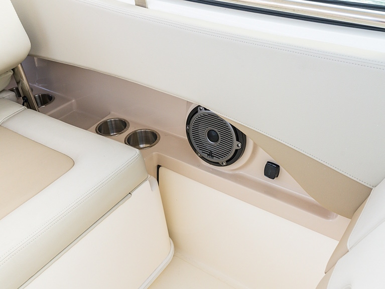- Stereo - System (JL Audio integration into Simrad Navigation Package) HELM - JL Audio MM105-HR stereo with dash mounted remote volume/mute knob, AM/FM/HD Radio, USB audio, and Sirius XMTM ready, Iphone/Android compatible via integrated Bluetooth 5.0, JL Audio waterproof speakers 7.7 (6), 10 Subwoofer, and 700W & 1000W Amplifiers