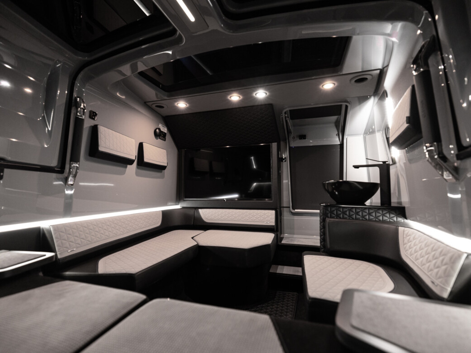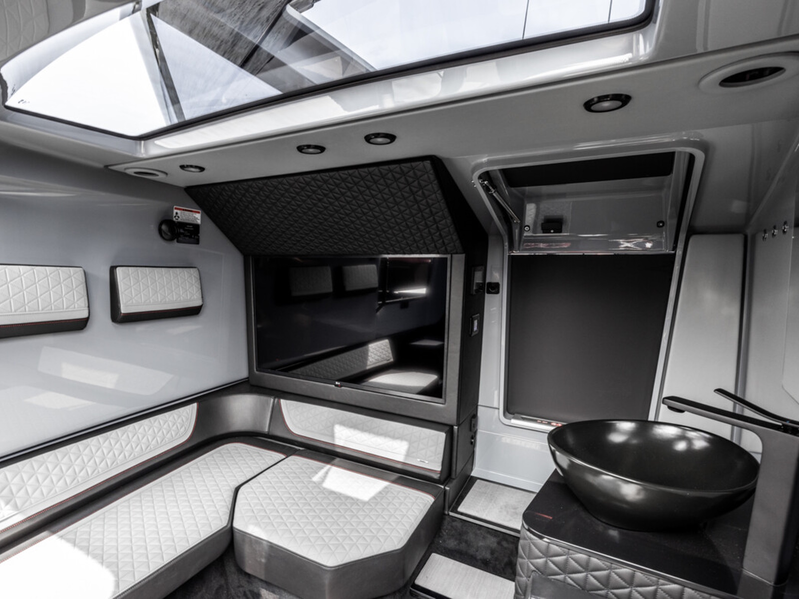Luxurious front lounge - Swathed in ‘sport-pattern’, cool gray and black BRABUS fine leather and Dinamica with contrasting red accents and stitching, the front cabin with a ‘queen size’ sleeping accommodation has a sense of space and luxury more associated with a supremely comfortable lounge. Extend the lounge experience with an optional integrated infotainment unit, comprising a 42-inch flat screen 4K TV and Apple TV connectivity to mention a few of the options available.