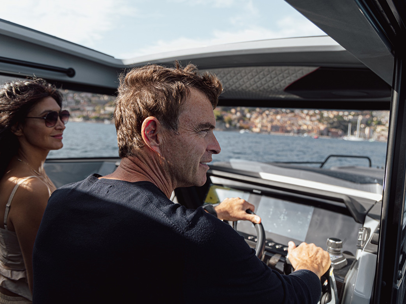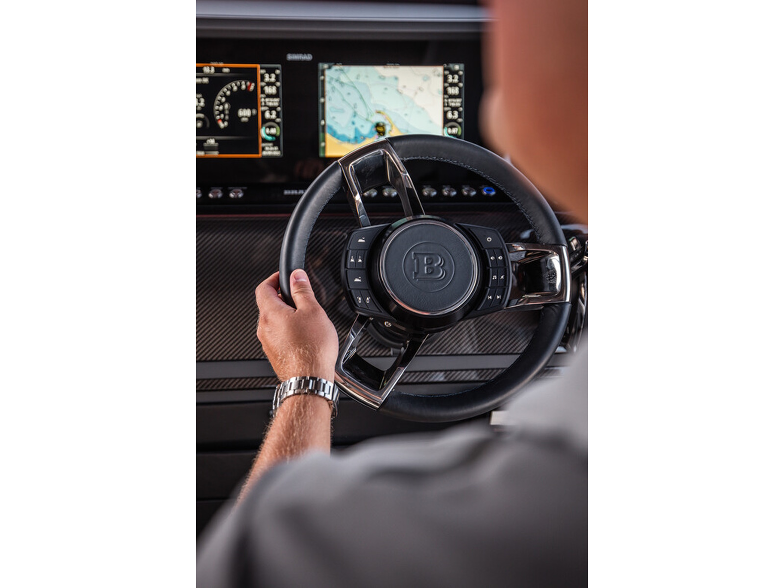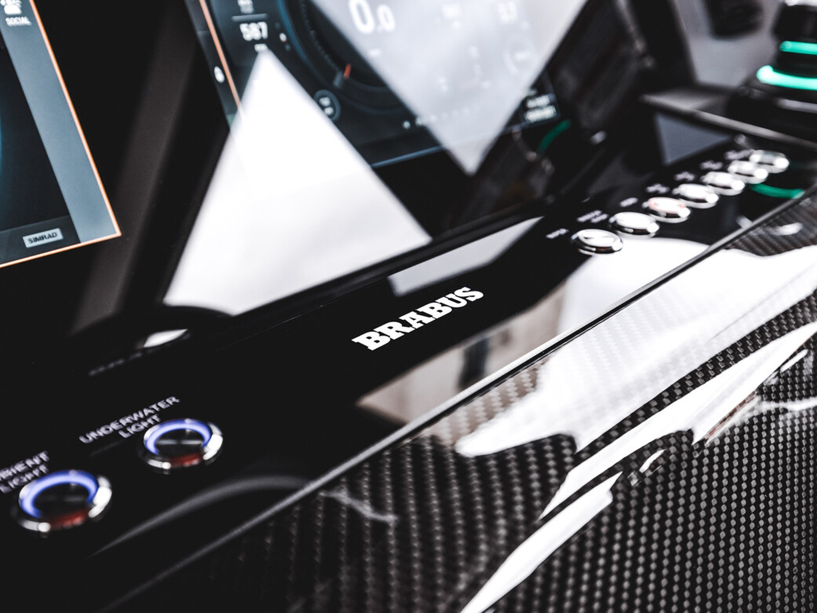 Electronics - The BRABUS Shadow 900 features a Simrad®️ dual touch -screen full width, ‘Glass Helm Information Display' with an updated BRABUS User-Interface, including G-shock monitoring, access to the boat’s main navigation, engine management, on board entertainment and driving-assist features. With the extended Navigation Package the helm is expanded into a four screen “bridge” setup that includes additional functions like displaying the speed for the passengers, audio controls and also a digital Panerai watch.