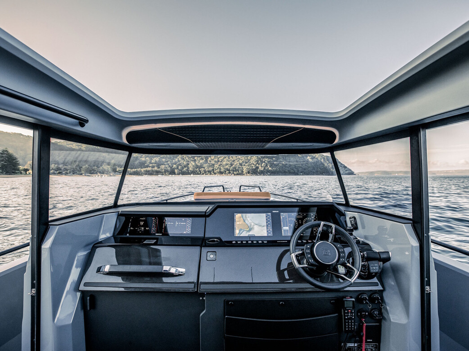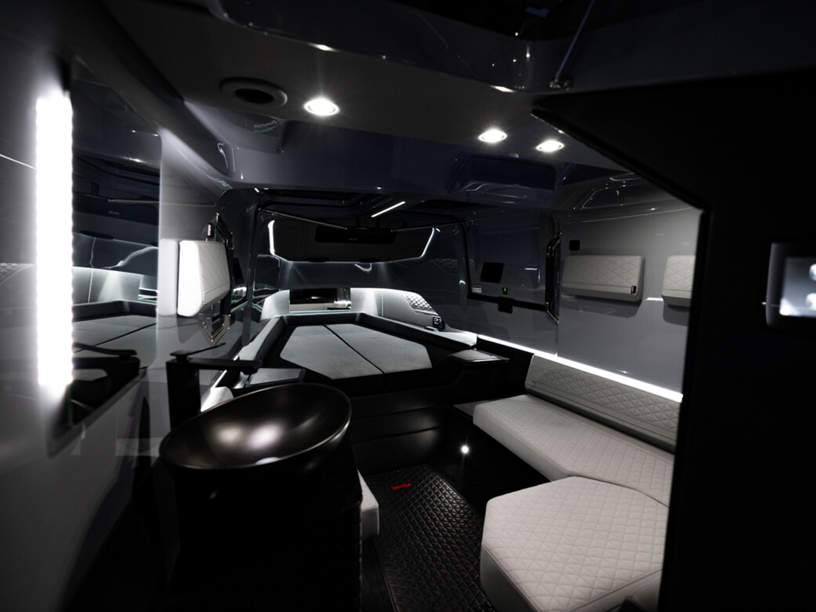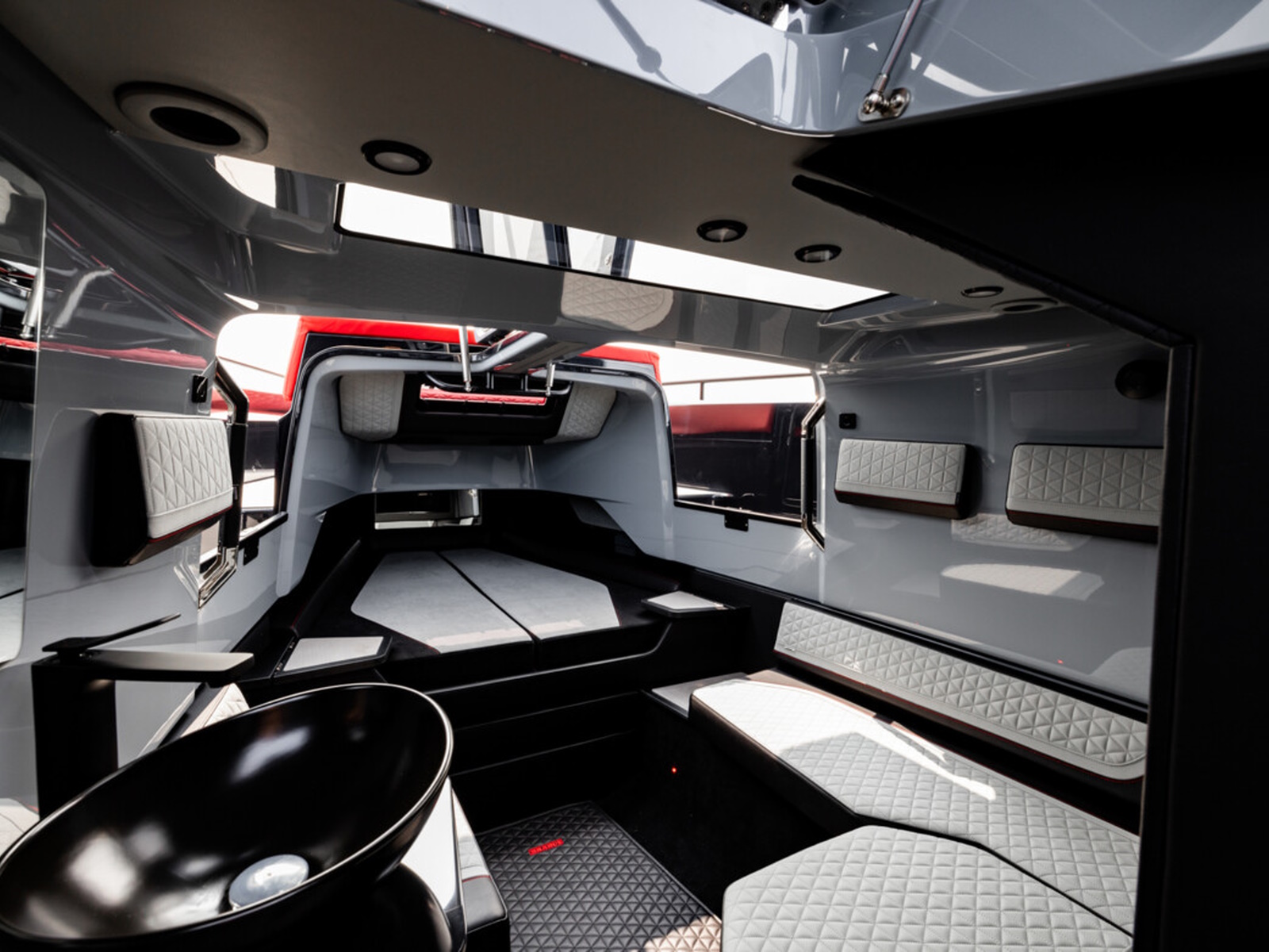 Smart-safety and electronics - The BRABUS Shadow 900 features a wide and expansive Simrad® full width, touch-screen ‘Glass Helm Information Display' with a customizable, state-of-the-art BRABUS User-Interface, offering a selection of driver-orientated sport modes, access to the boat’s main navigation, engine management, on board entertainment and driving-assist features. The Intelligent Steering Module with integrated trim tab, bow thruster and audio controls enables to control the boat even smoother than ever before. In the quest for a more driver-focused, more up to date and seamless looking appearance, the helm area is free of unnecessarily cluttered instrumentarium.