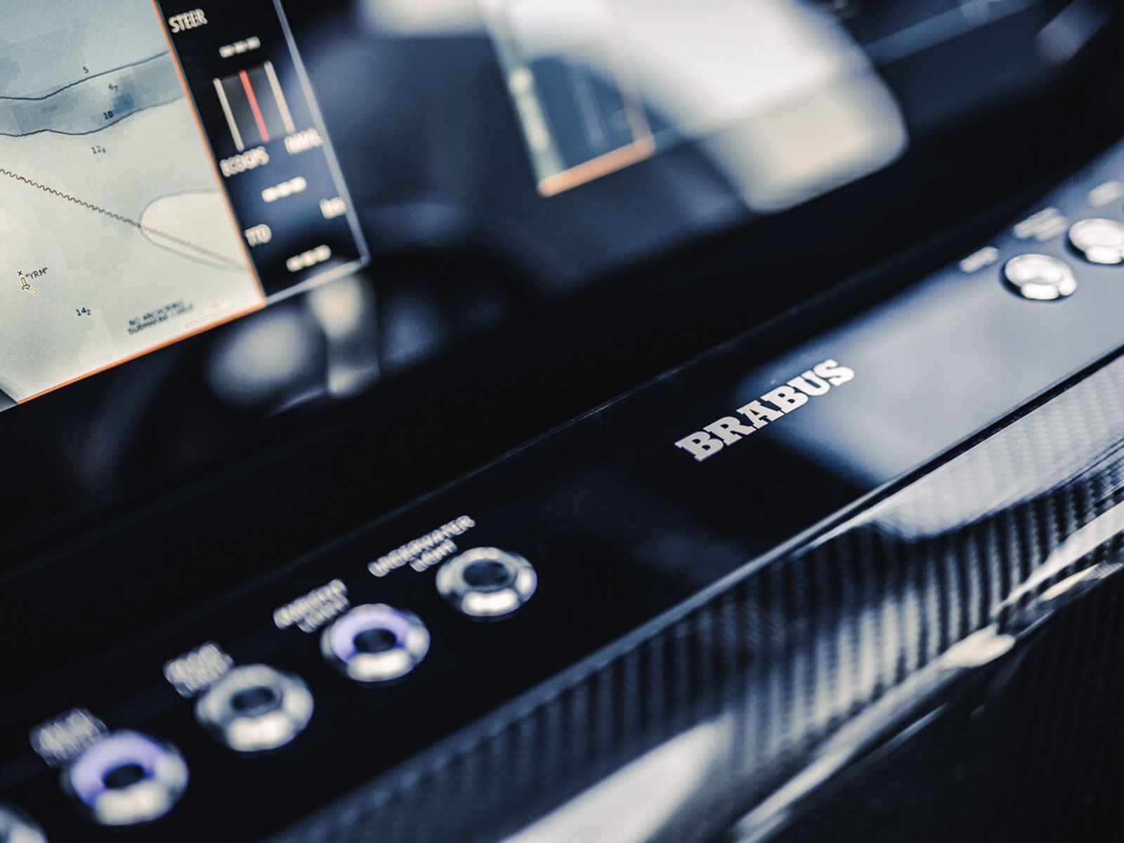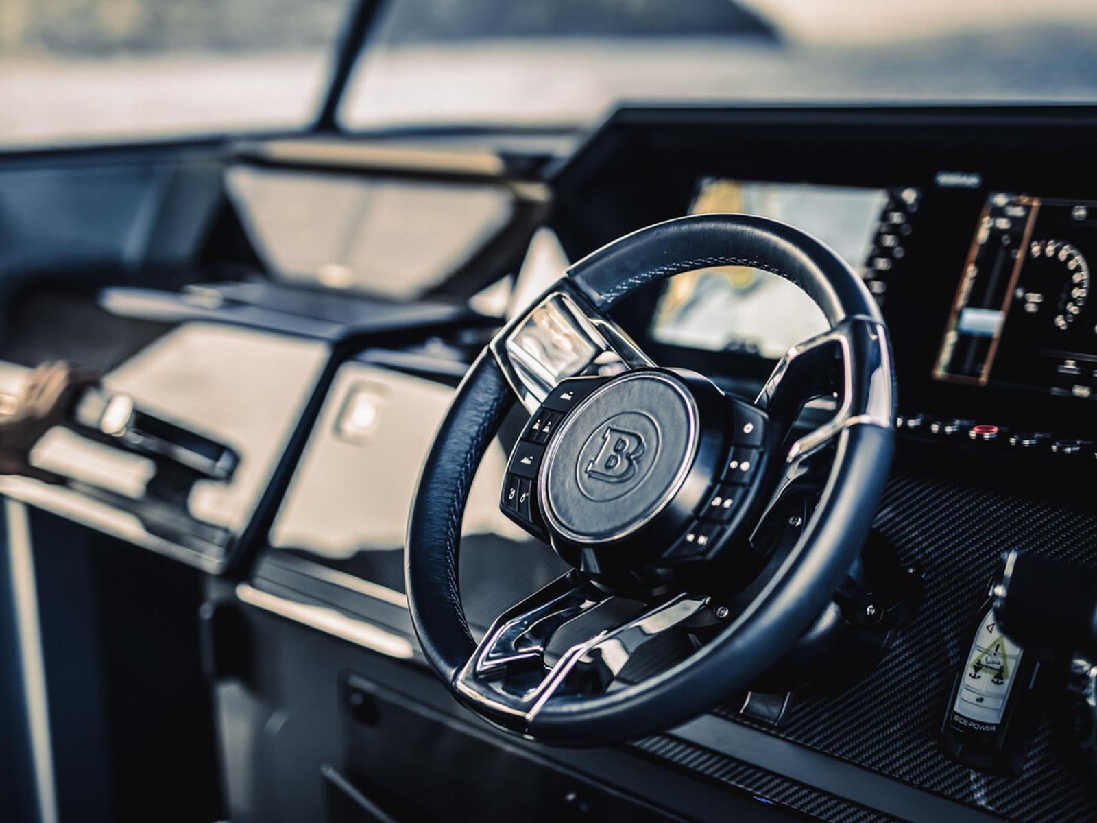 Carbone fiber - Visible carbon-fiber parts complete the ultra-cool looks of the dashboard and seat trims and further emphasizes the clean and high tech look of the boat. All carbon-fiber parts are made in-house and supplied directly to the boat factory from the BRABUS headquarters in Germany.