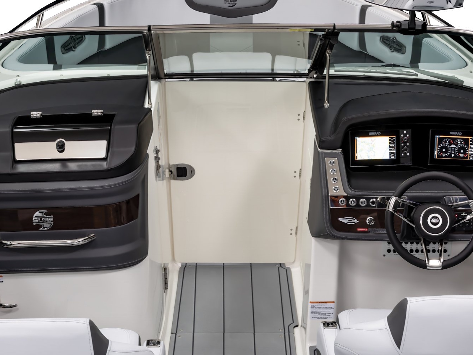 The 30 Surf was designed with the most advanced technology afloat today. Dual touch screen "Glass Dash" helm is NMEA compatible and offers navigation, engine management, and full gauge compliment, and can be customized to your personal preferences. Additionally, to make surfing effortless, the 30 Surf features a Simrad touchscreen interface to control all surf-related functions like ballast and the Malibu Surf Gates (TM).