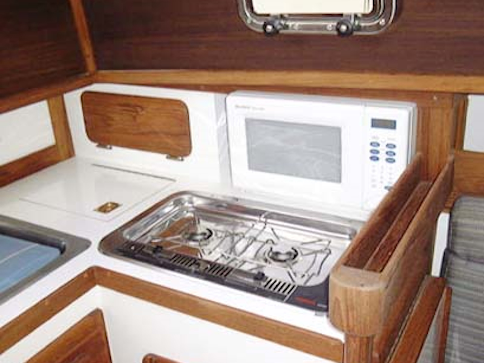 The 6' 10" cockpit with port and starboard seat lockers also has wet storage under a contoured helmsman’s seat. Wide decks and cabin top provide plenty of room for sail handling or just lounging in the sun.