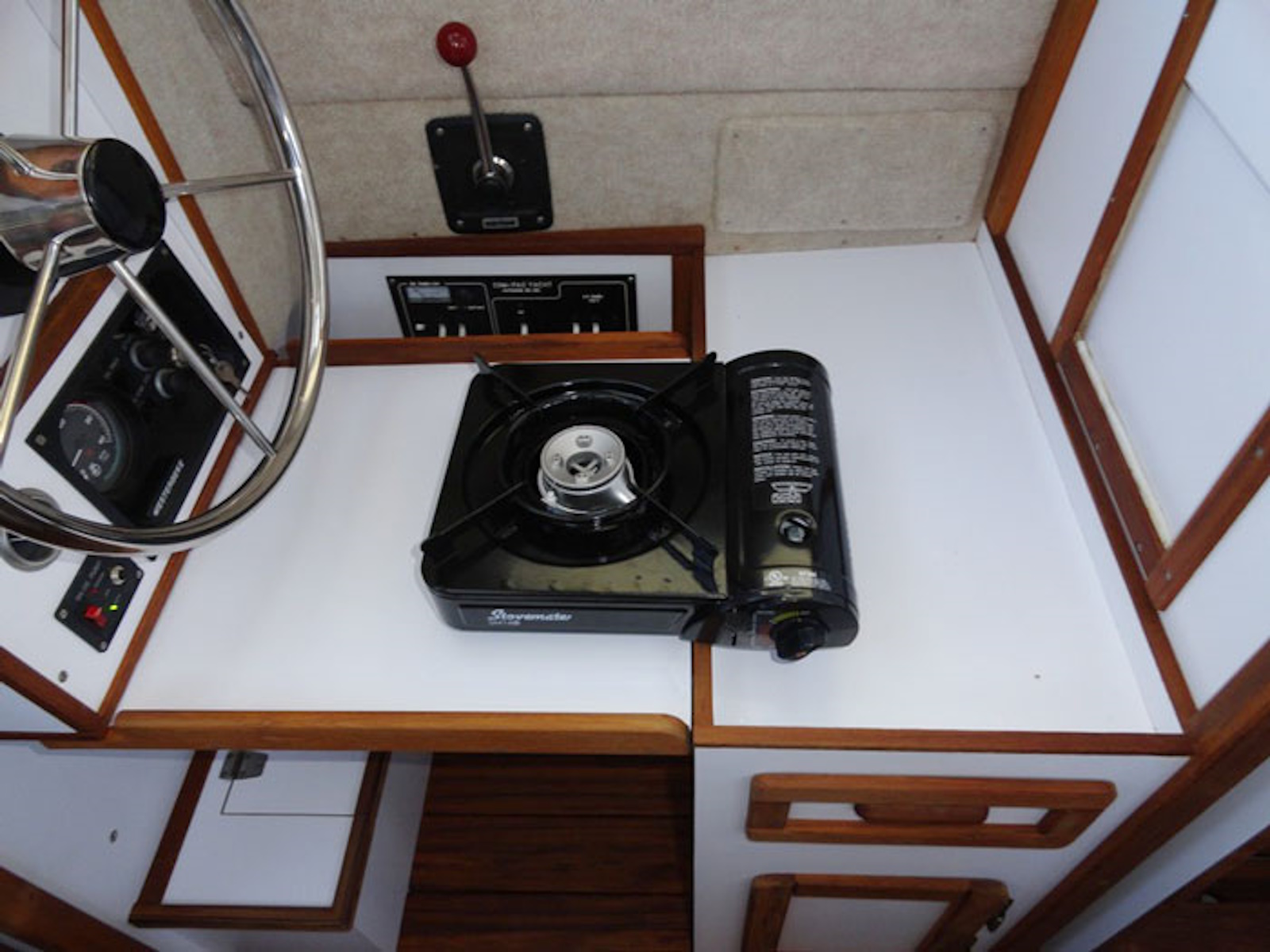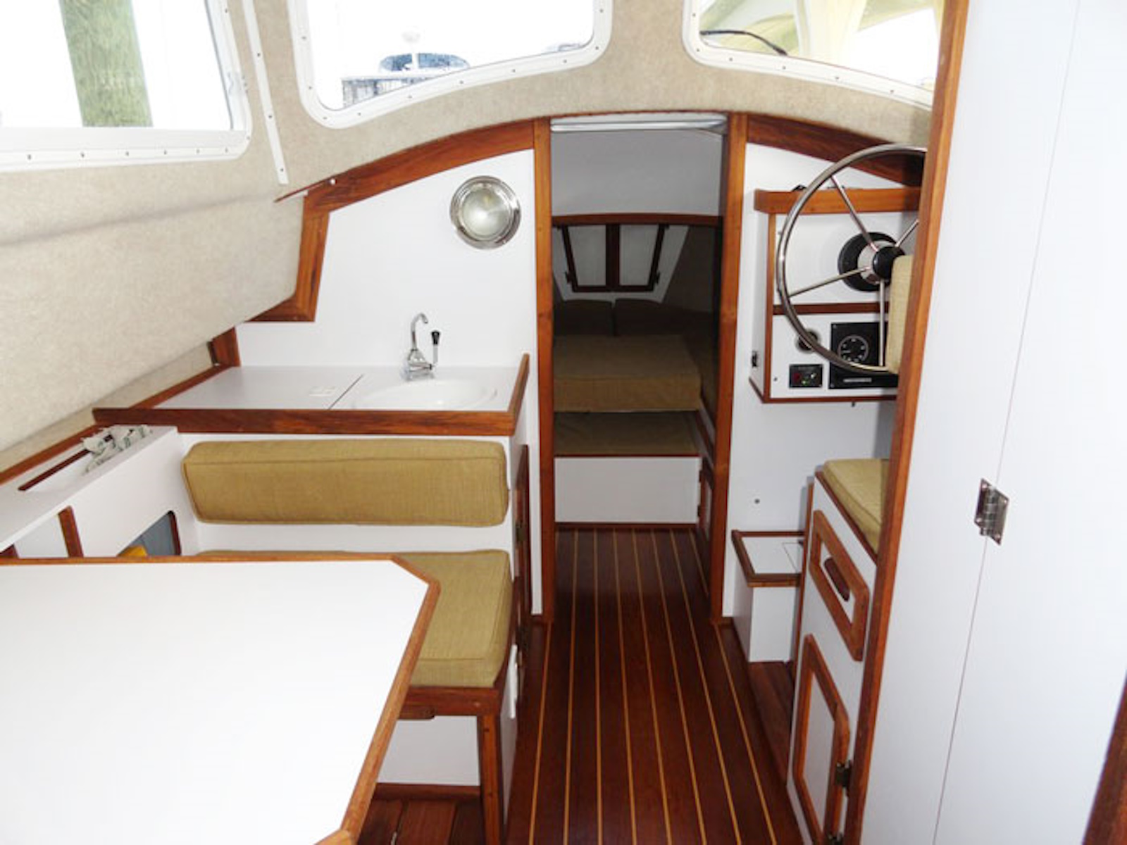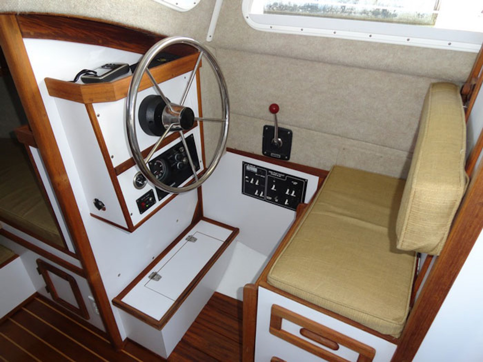 - Steering from inside the pilothouse during inclement weather, in addition to tiller steering in the aft cockpit