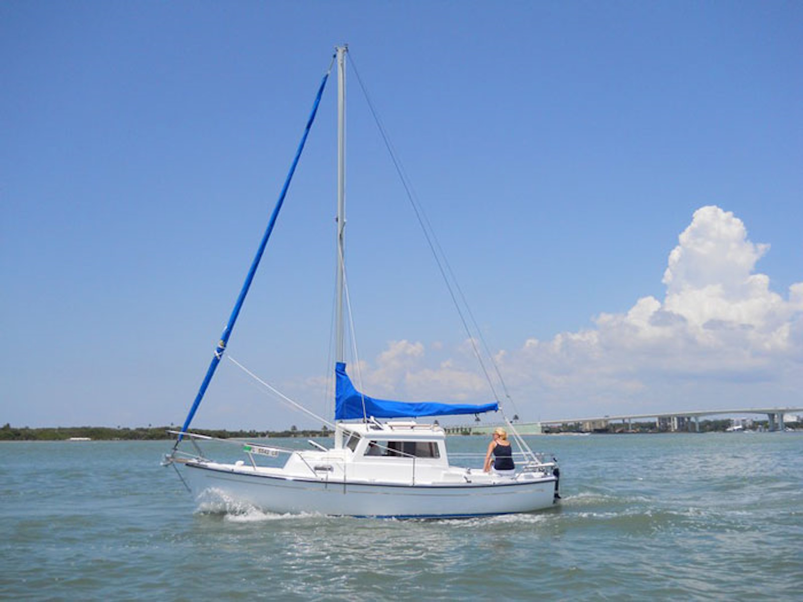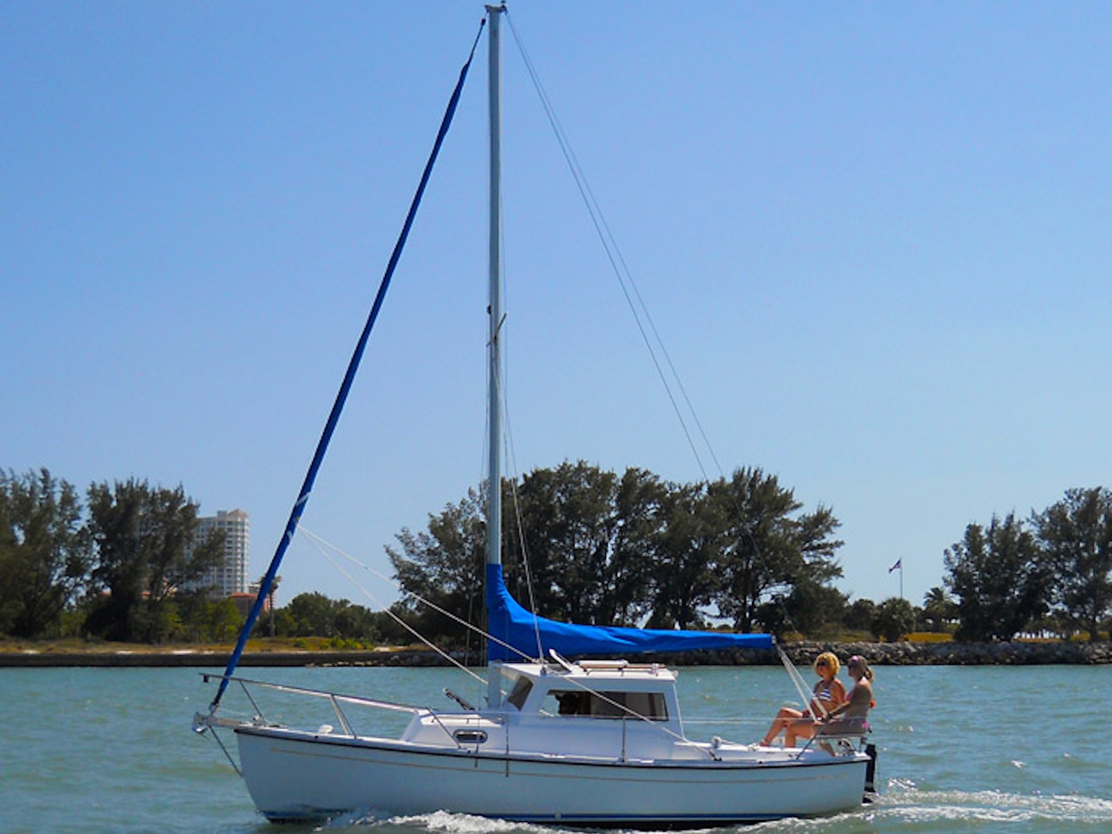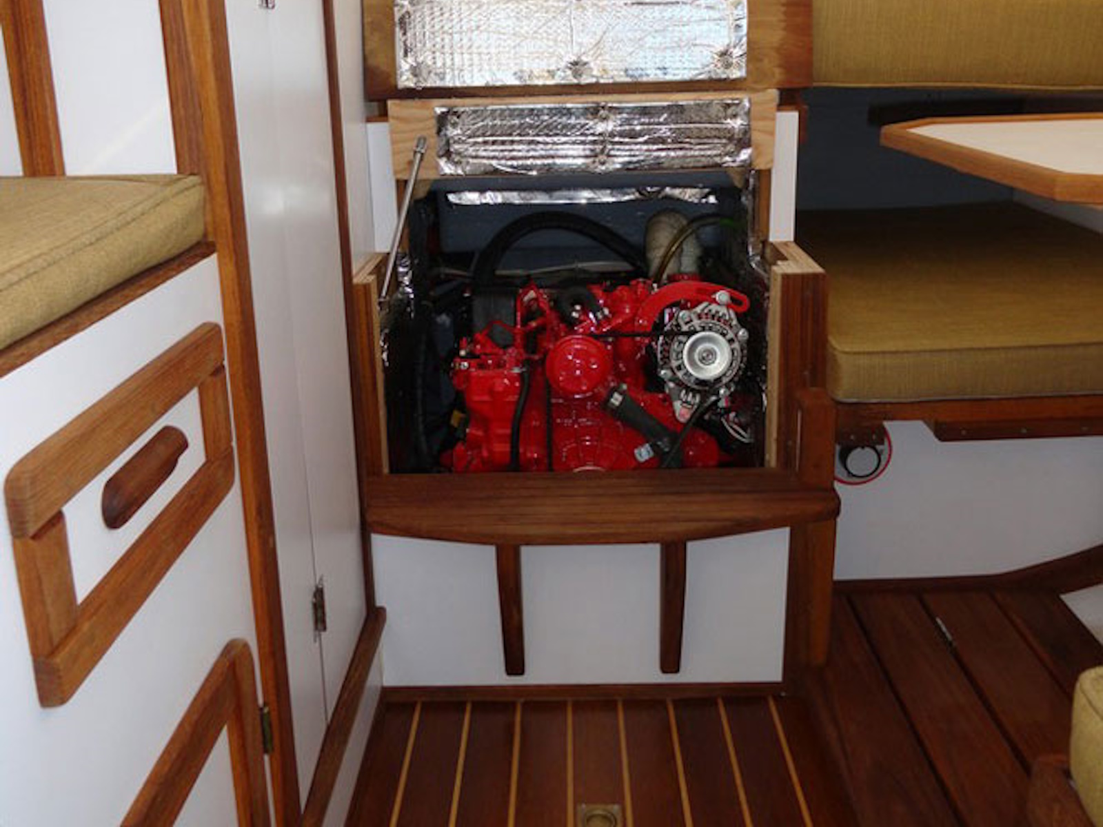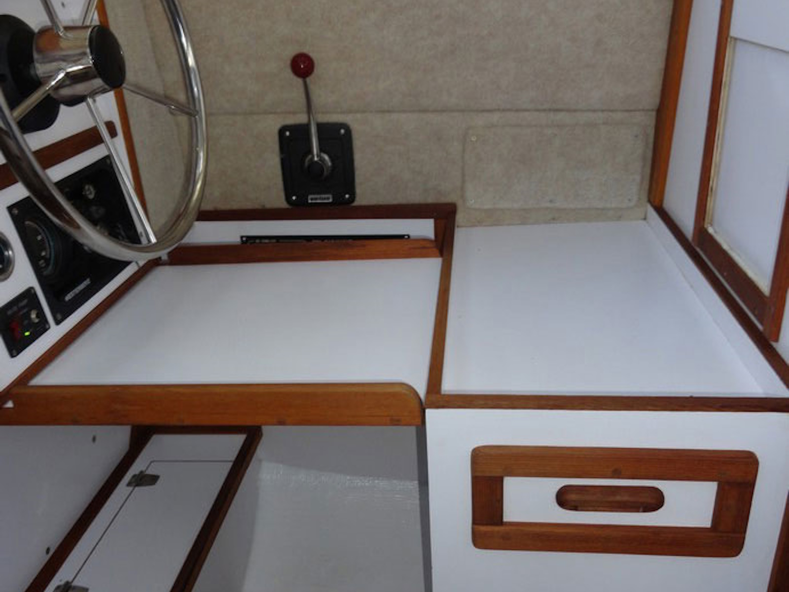 - Steering from inside the pilothouse during inclement weather, in addition to tiller steering in the aft cockpit