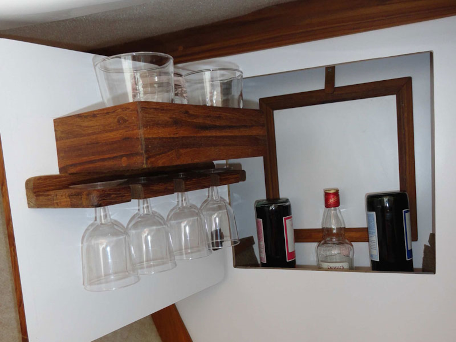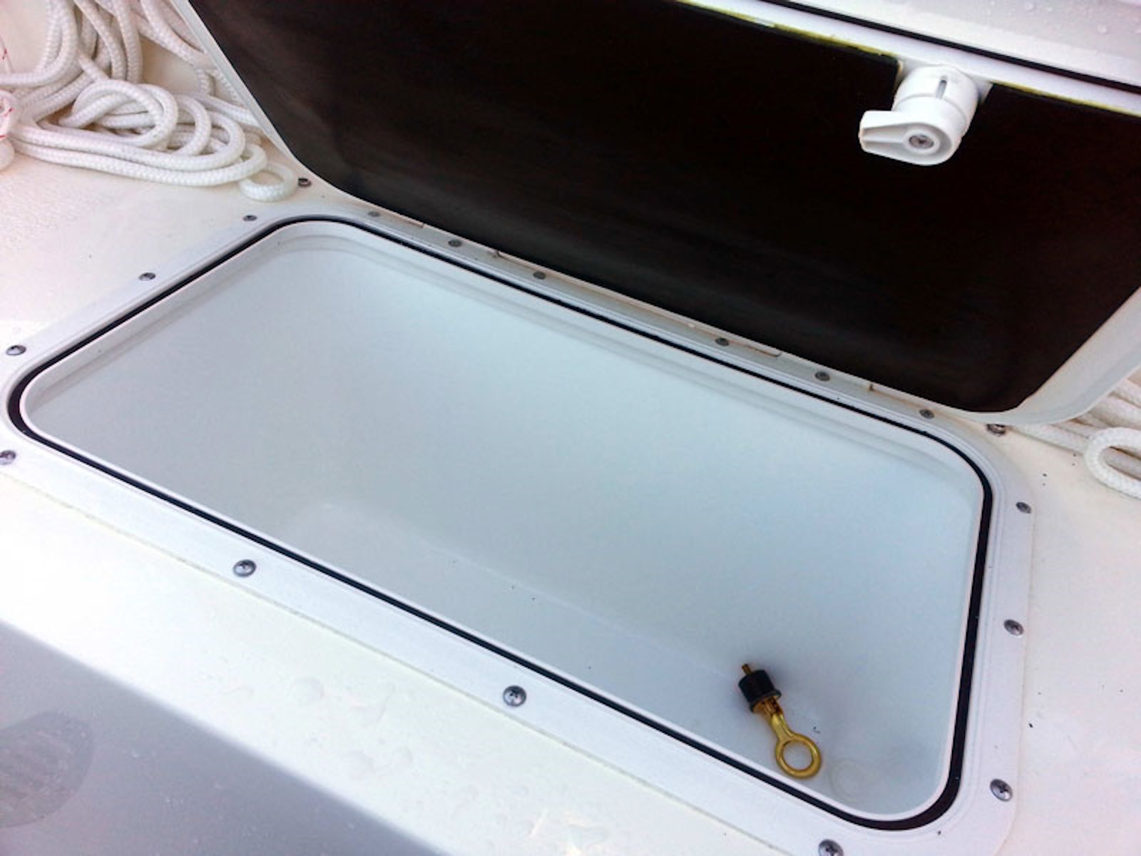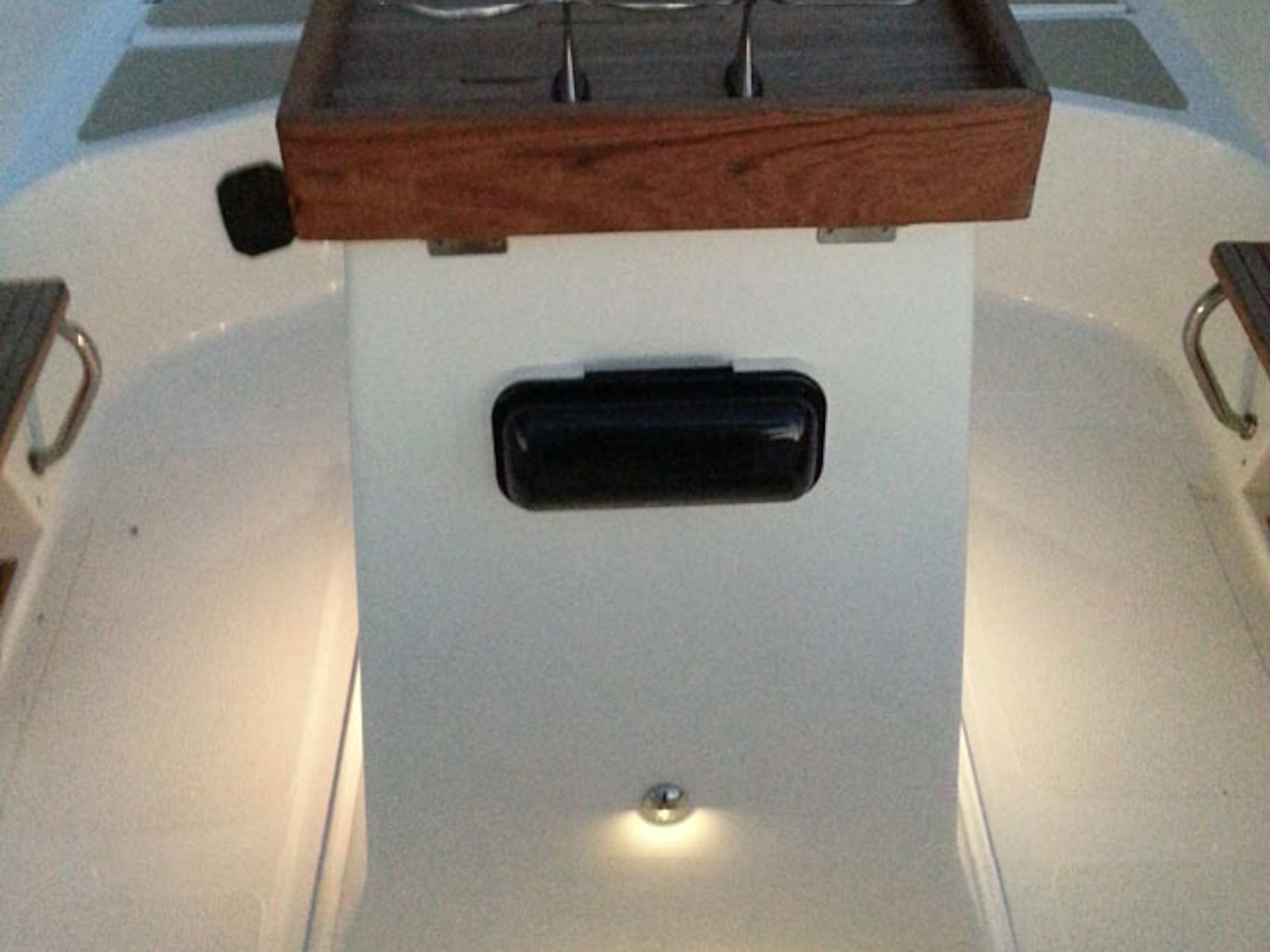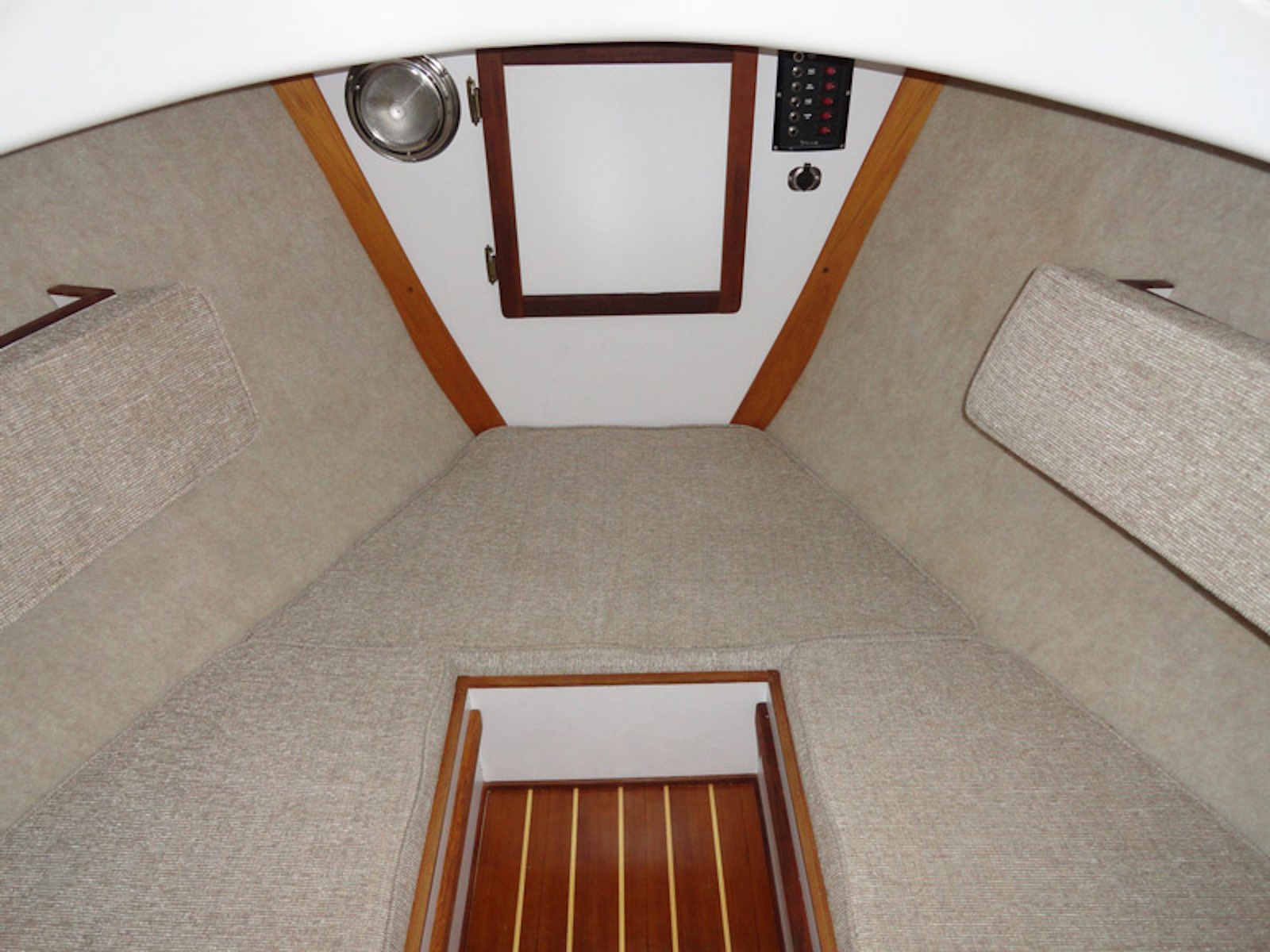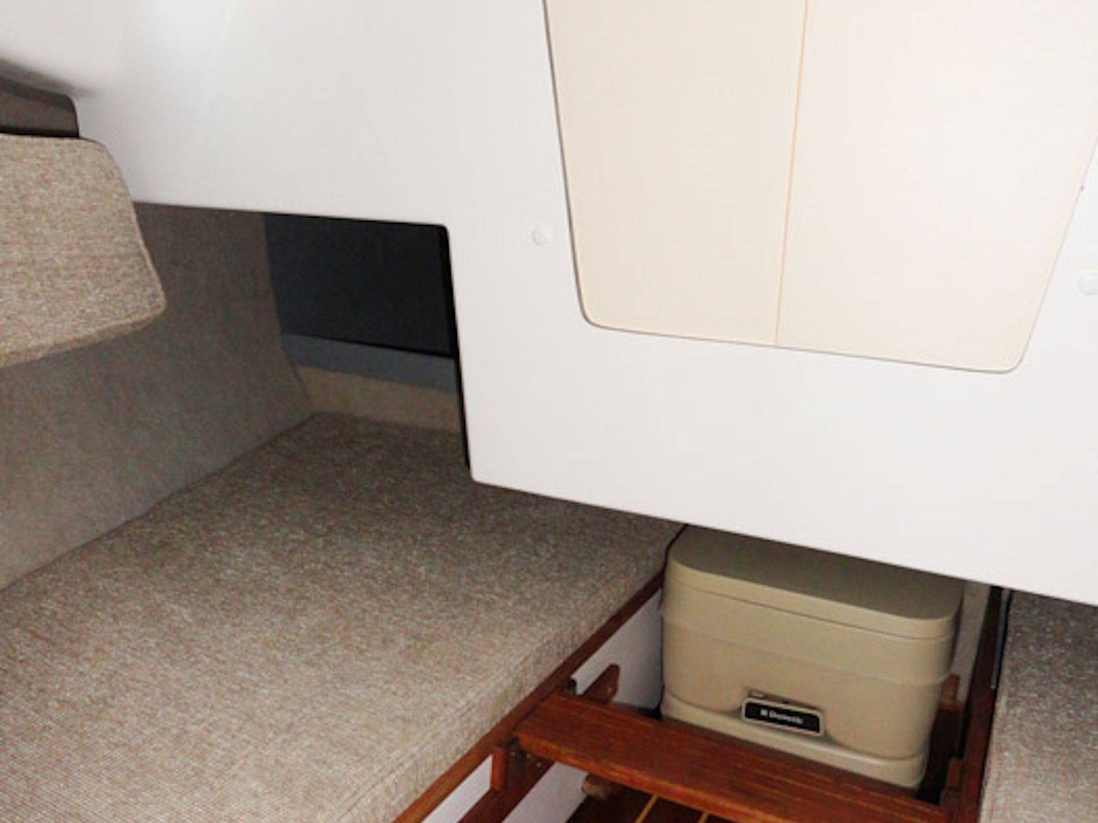On deck there is an insulated, built in ice box with a drain overboard. Below is comfortable seating for 3, with quarter berths that extend under the cockpit to provide 6'6" of sleeping space. The portable head stores under the cockpit floor and is pulled out for use.