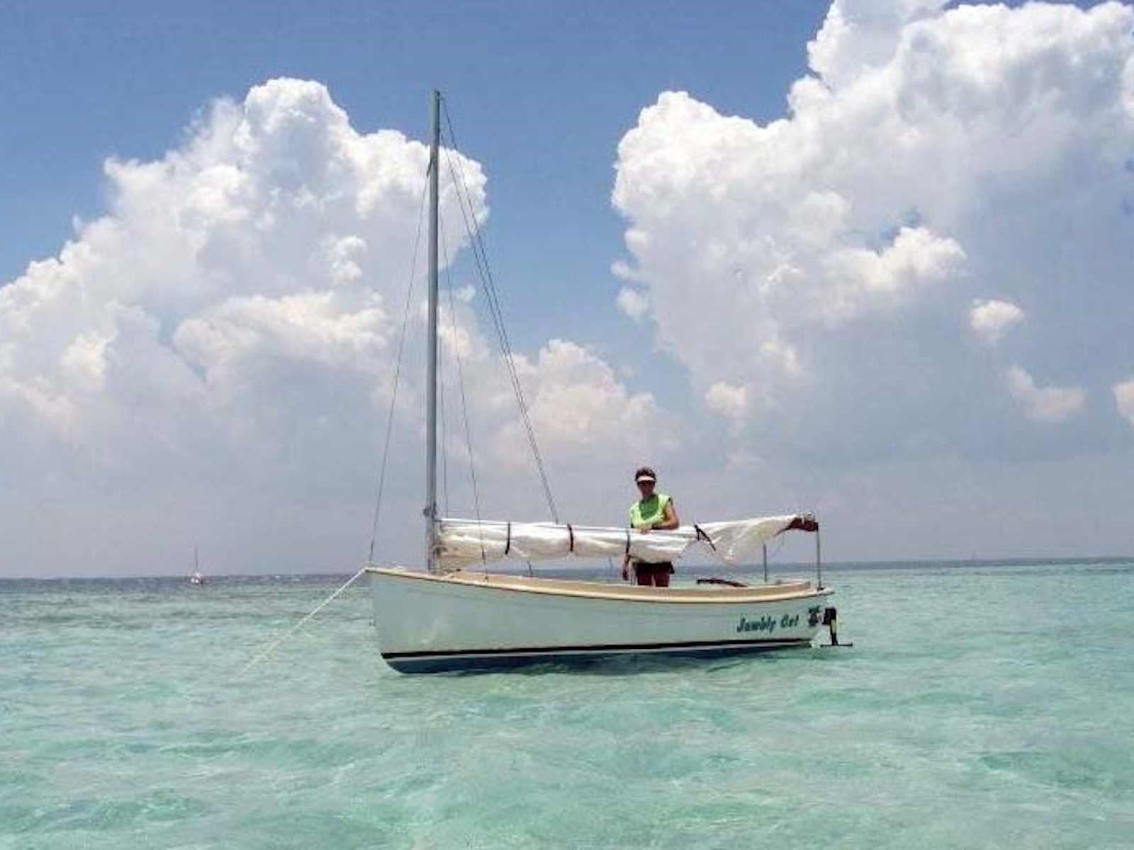 Her broad hull form and the low center-of-effort of her gaff-rigged sail make her very stable. And her huge self-bailing cockpit and ample stowage offer unsurpassed comfort in a small, easily handled package.