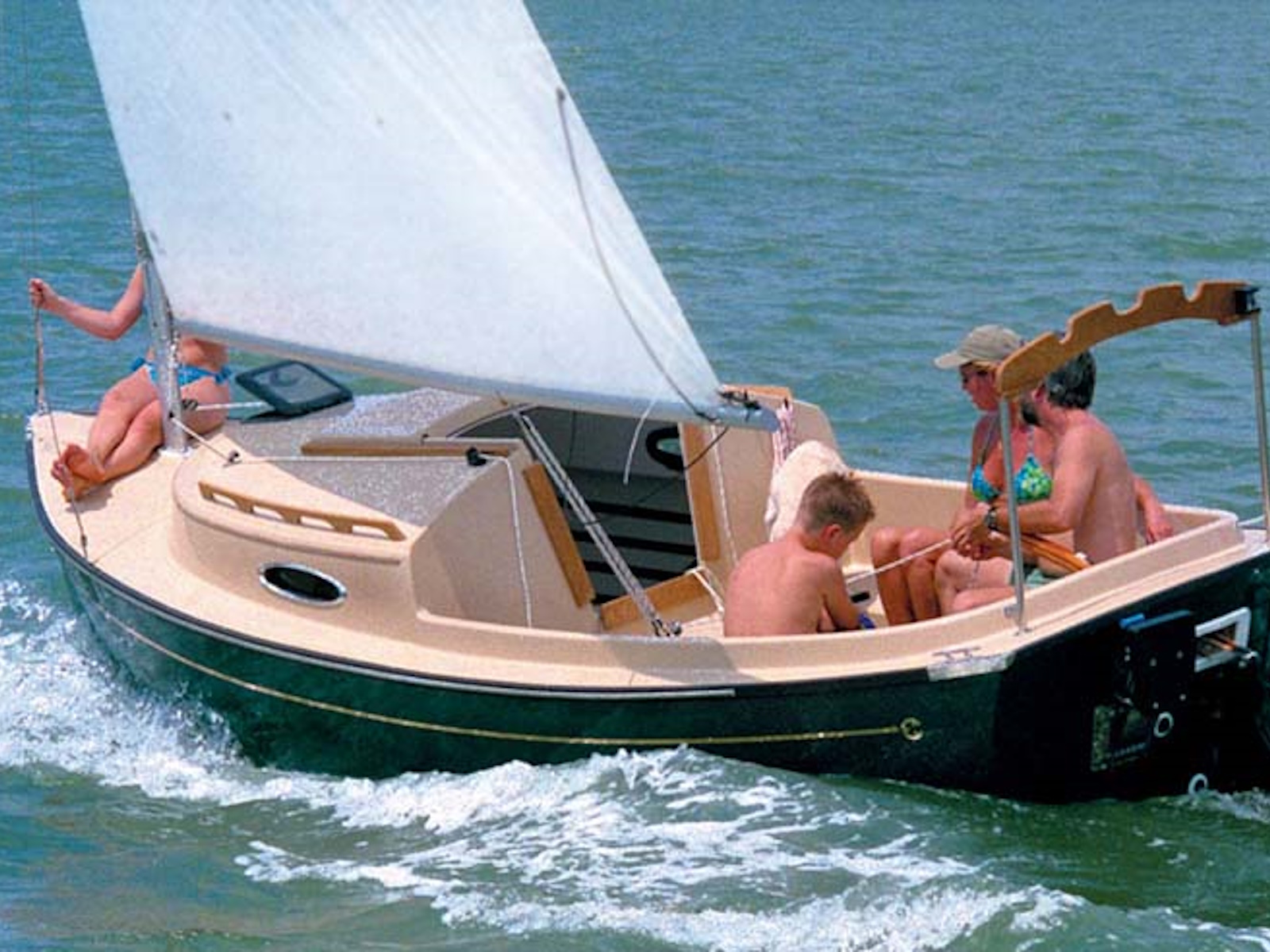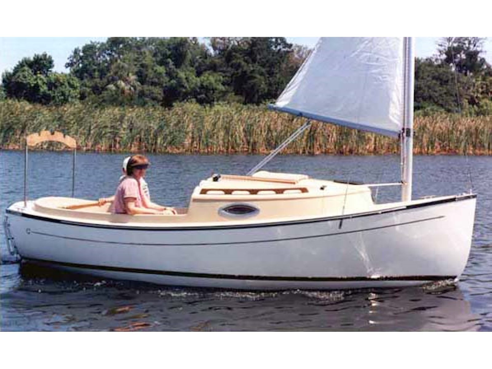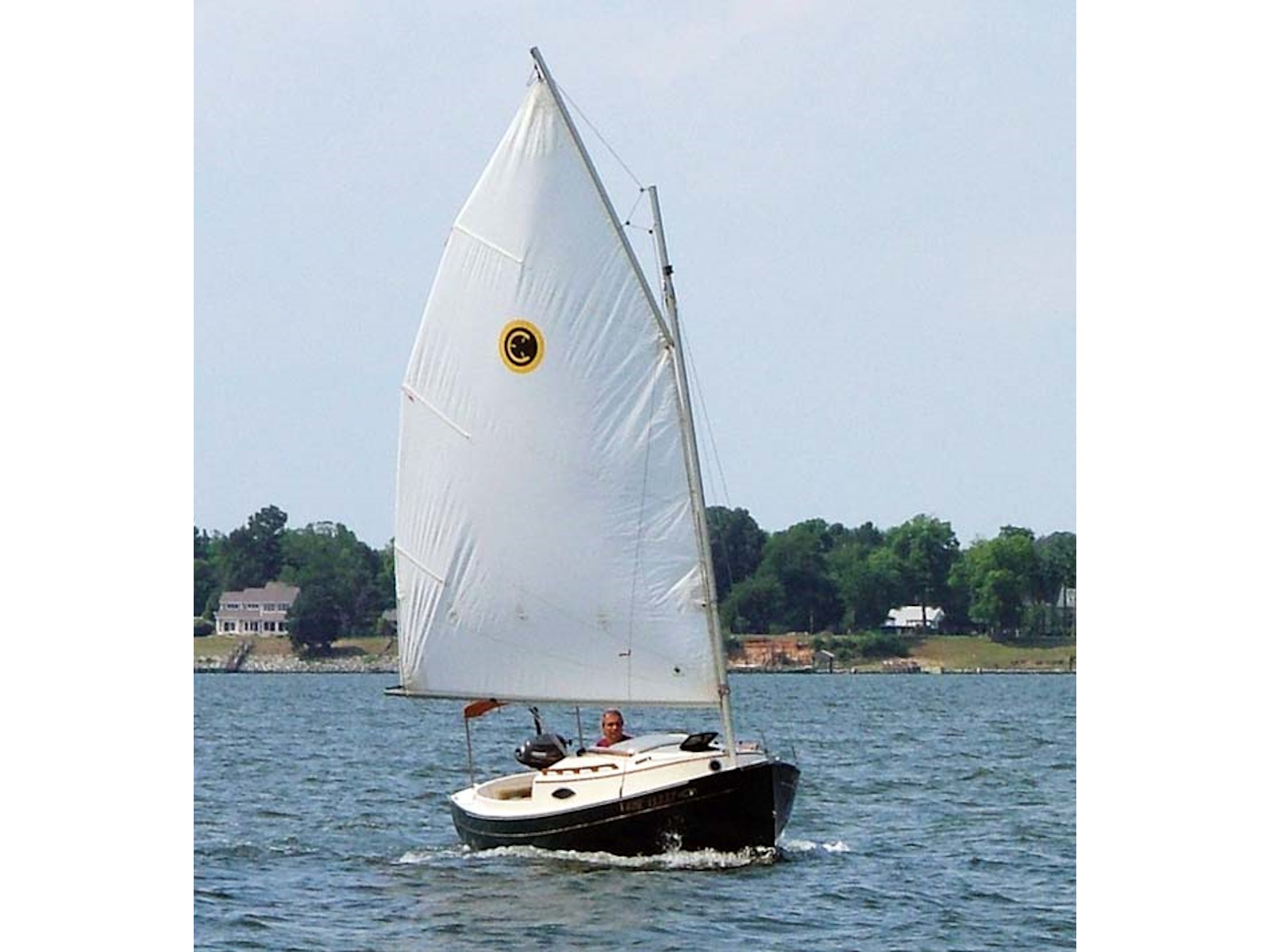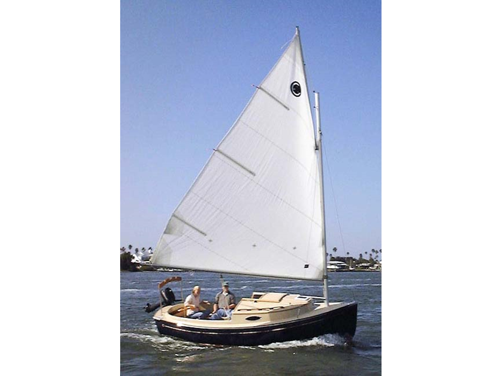 Clark Mills wanted to design a shoal daysailer that would rig and sail easily, quickly, and comfortably — as well as accommodate his family and friends. The Sun Cat was designed as an easily driven, roomy day boat and overnighter with a shoal draft to gunk hole along coasts and in harbors not accessible to more burdensome yachts.