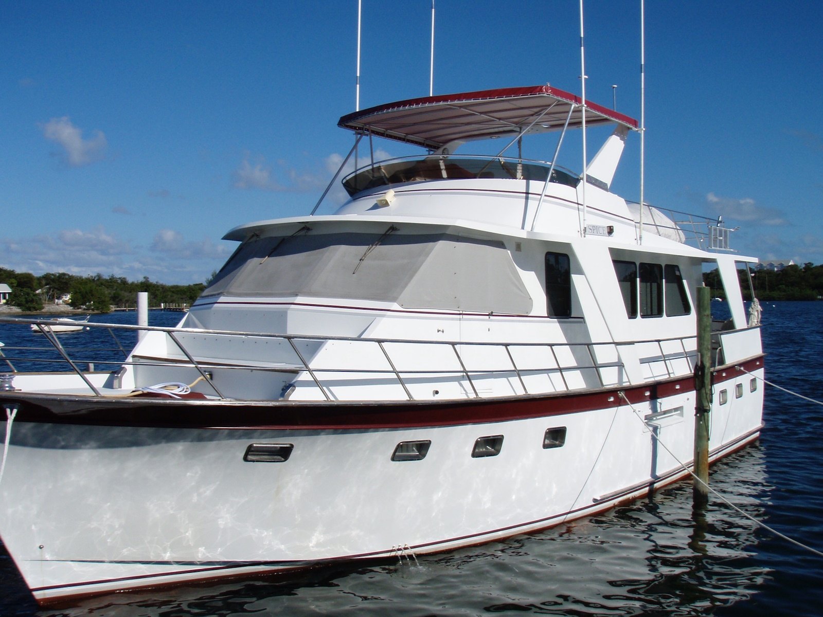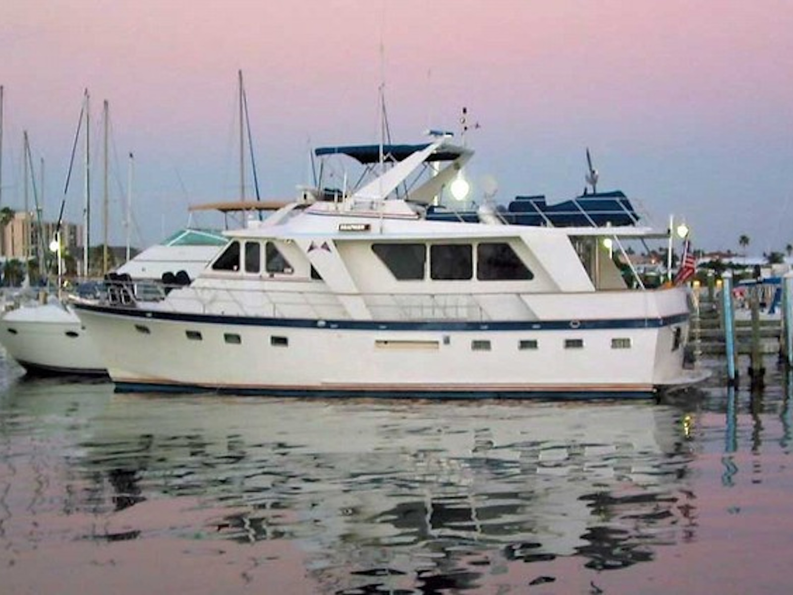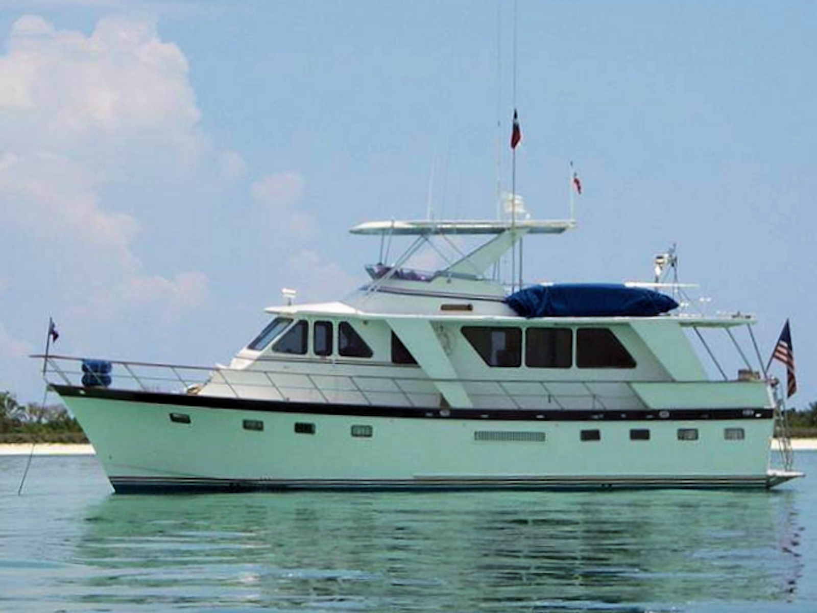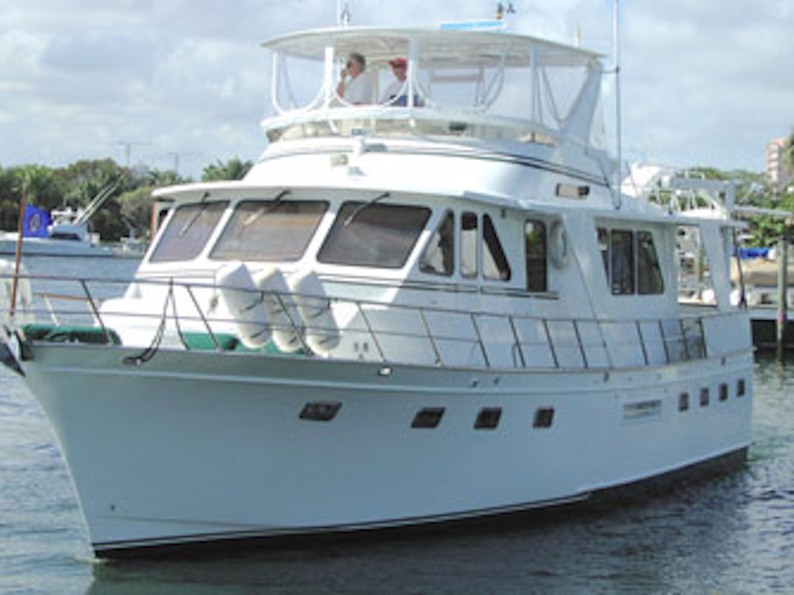 The Performance Offshore Cruiser has a layout like the 52 Offshore Cruiser but it was designed with, less fuel and water, less weight, a semi-displacement hull, and more horsepower. The goal was to give it a higher potential cruising speed than the full-displacement 52. As a practical matter, most of the 53s are cruised at a comfortable 9 knots. The flush-deck design produces spacious interiors and a standing-headroom engine room. It’s a good boat for a single couple or two couples. It has three staterooms to accommodate up to six. An extended version known as the 57 Yachtfisher was built with a cockpit. Production was from 1986 to 1989.