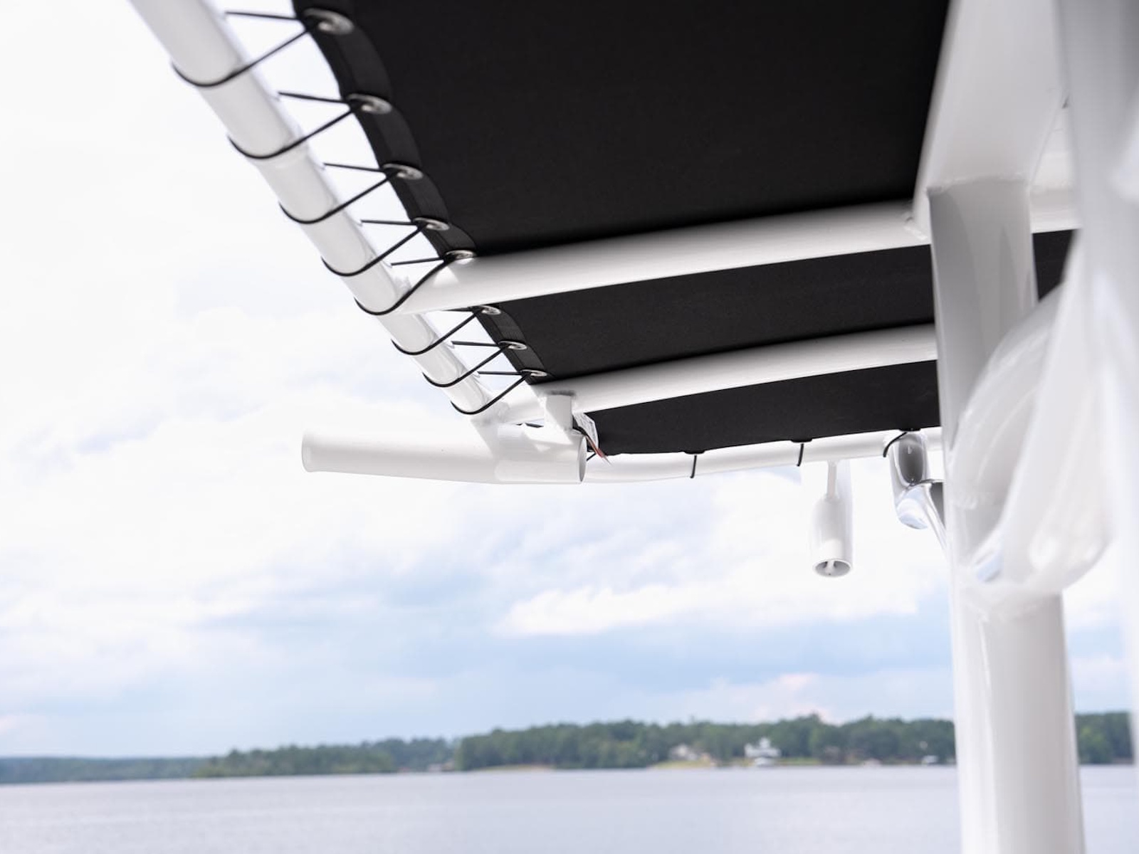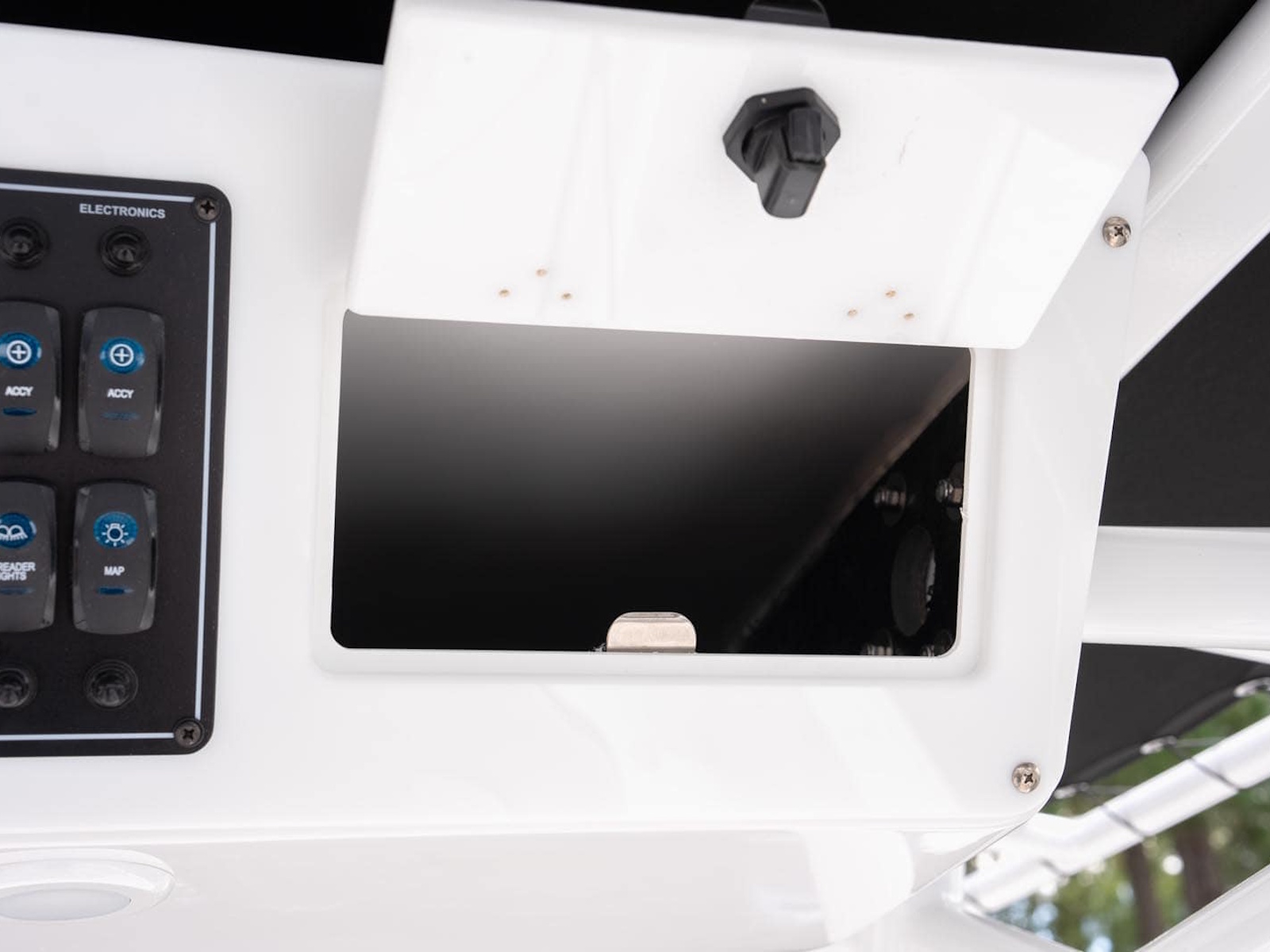 Whether fisherman or family, this boat offers a little something for everyone. Let's start with the anglers. The first thing you will notice is all the rod holders — twelve are standard, not including the molded-in rod storage in the gunnels. Add the optional canvas t-top and you get eight more. The bow cushions can be removed and the rear seats folded down to serve as bow and stern casting platforms. A bow fishing seat and pedestal is optional. At the helm is a leaning post, 74-quart Engel cooler, real tempered glass windshield, and a large flat space for GARMIN electronics. A 14-gallon stern live well is standard, and the front bow cooler can be upgraded to a second live well. A trolling motor mount and harness are also optional. The optional raw water wash-down, along with a self-bailing cockpit and optional seagrass flooring, makes cleanup a breeze at the end of the day.