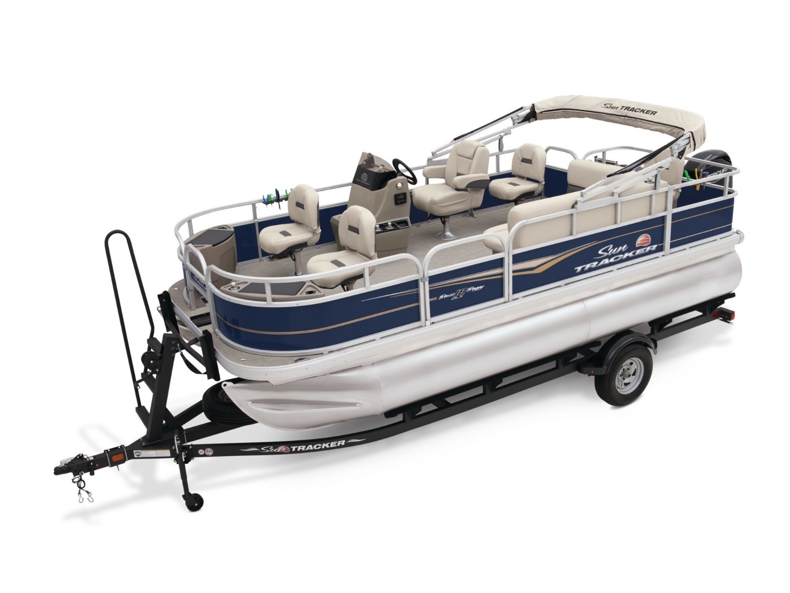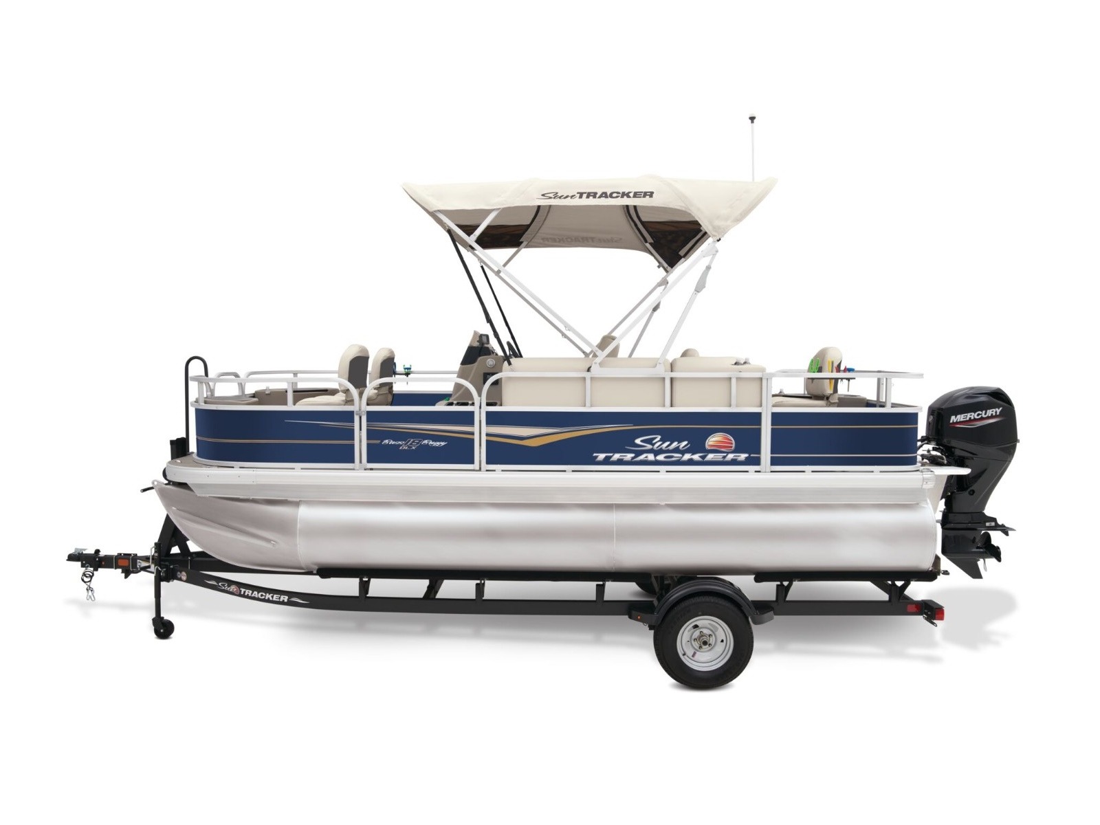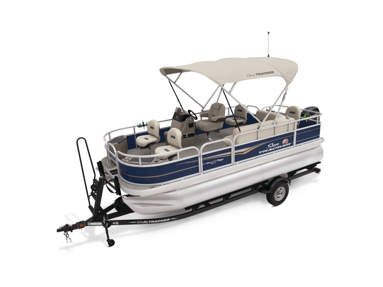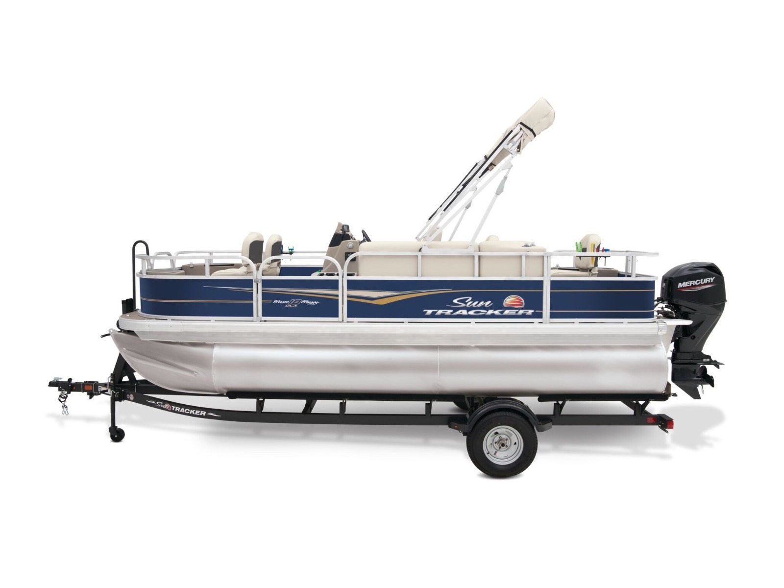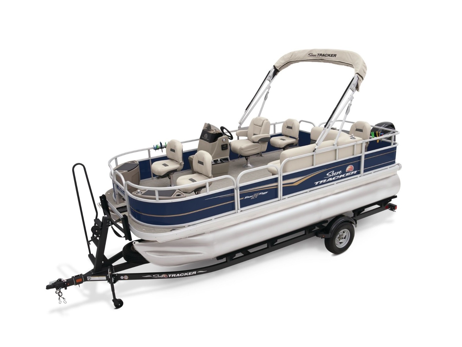 - 9' (2.74 m) SUN TRACKER® QuickLift™ Bimini top w/LED courtesy lights, storage pockets & protective boot (color-coordinated Sand w/Copper Red or Indigo Blue fencing)