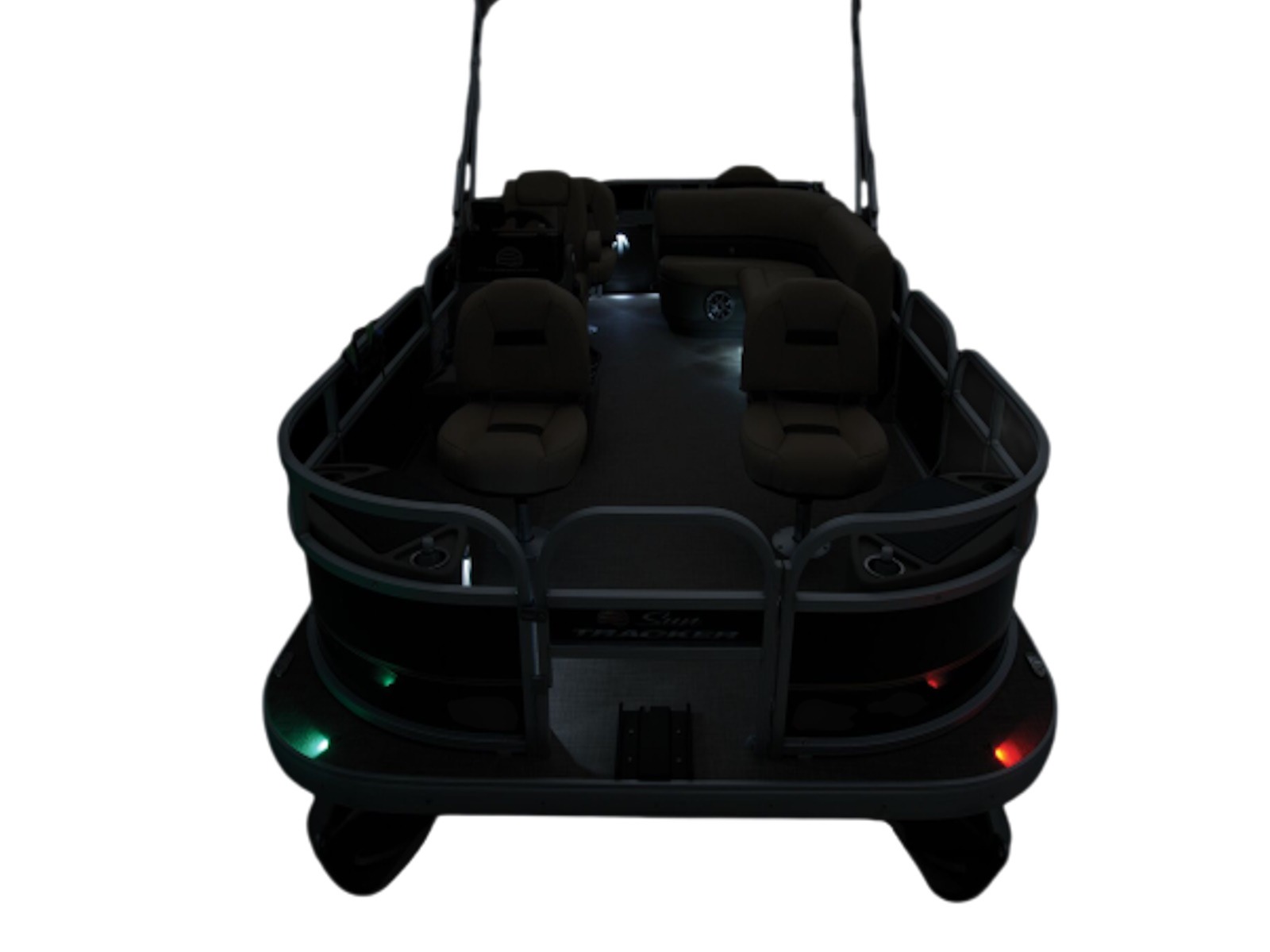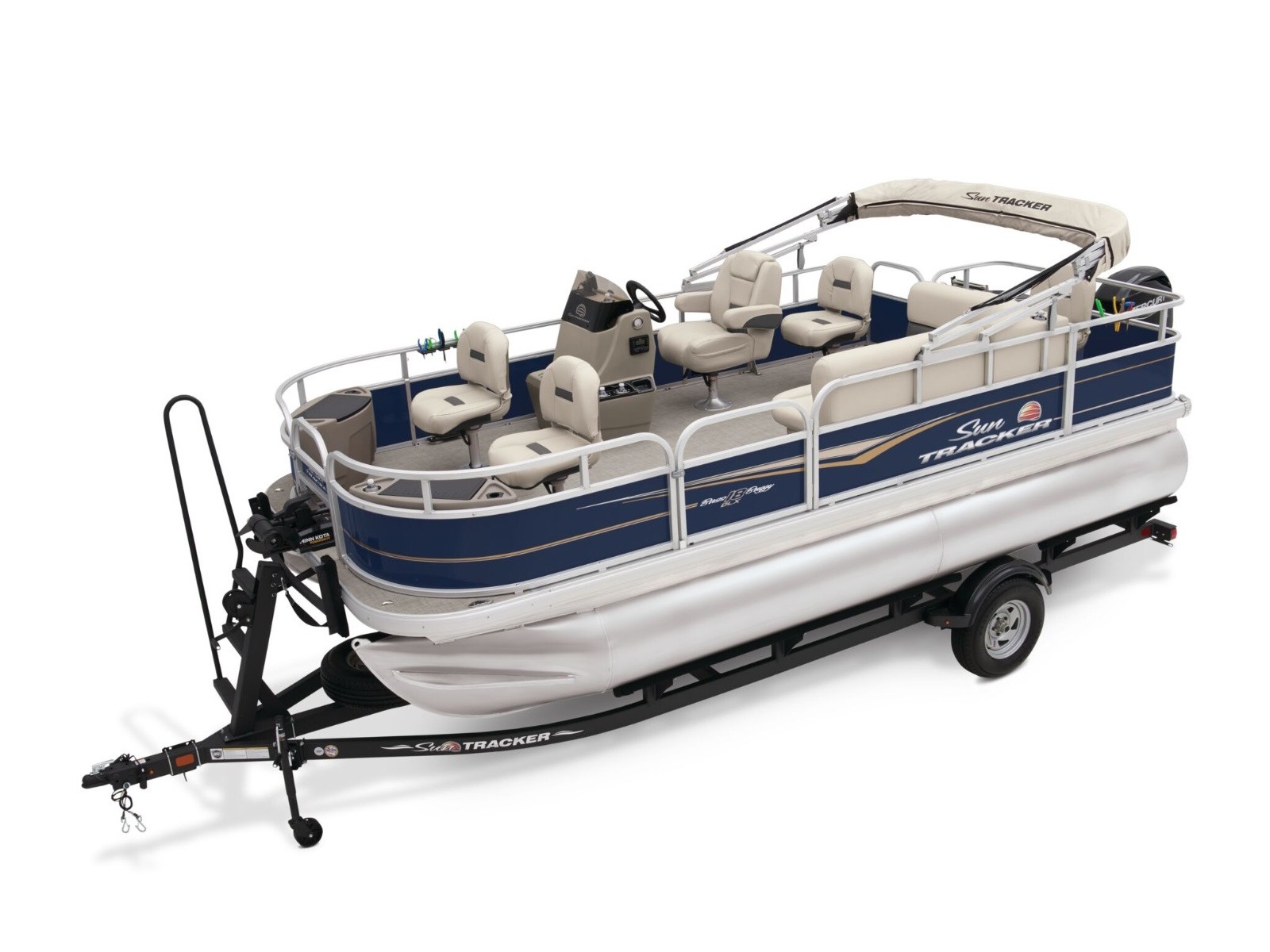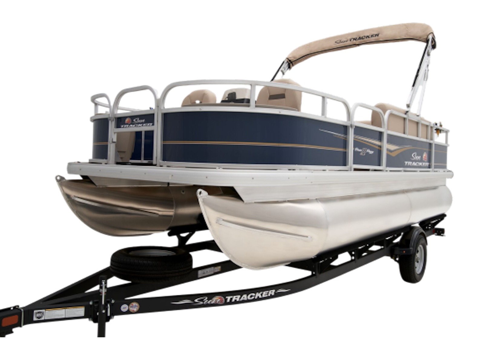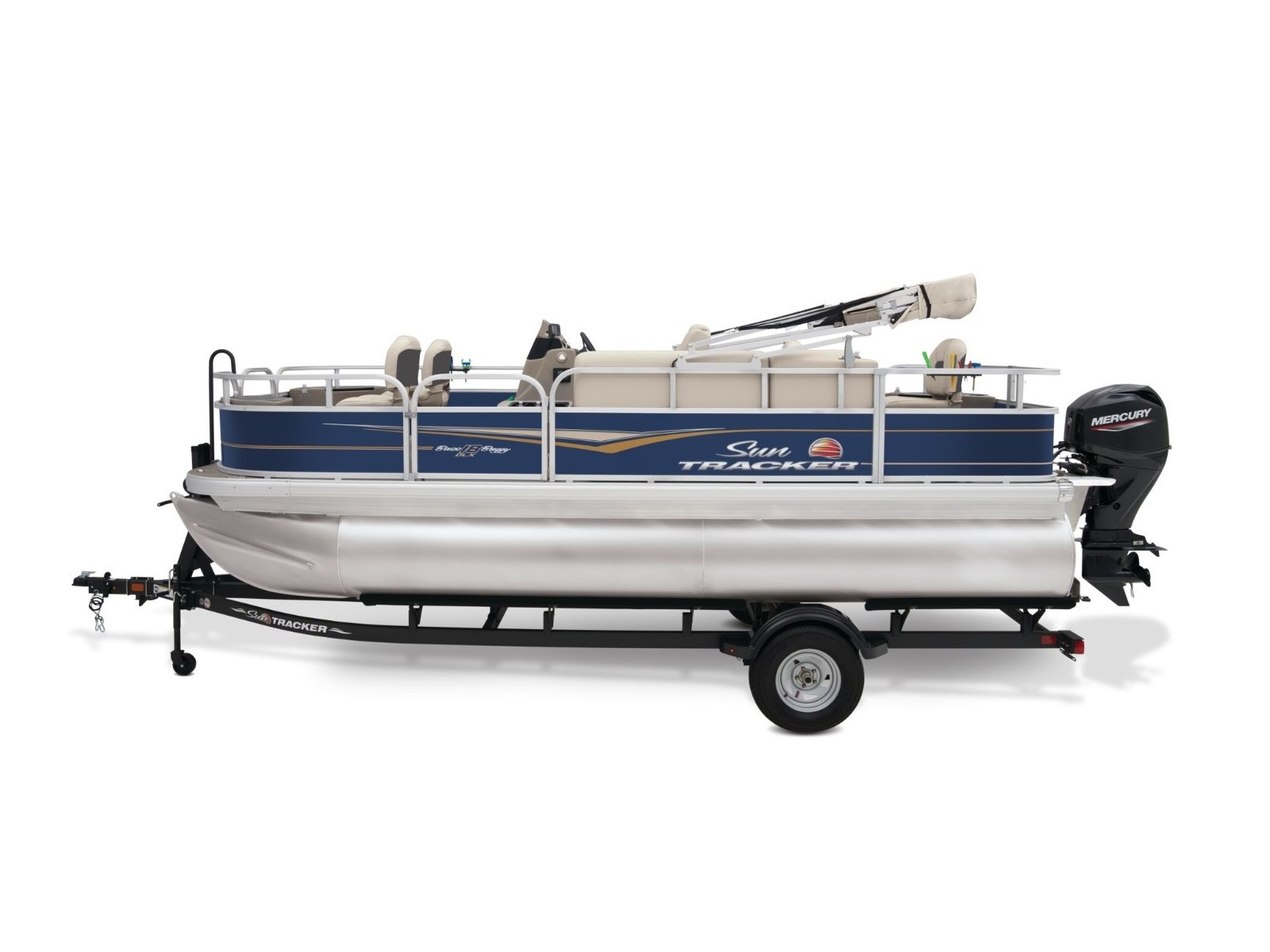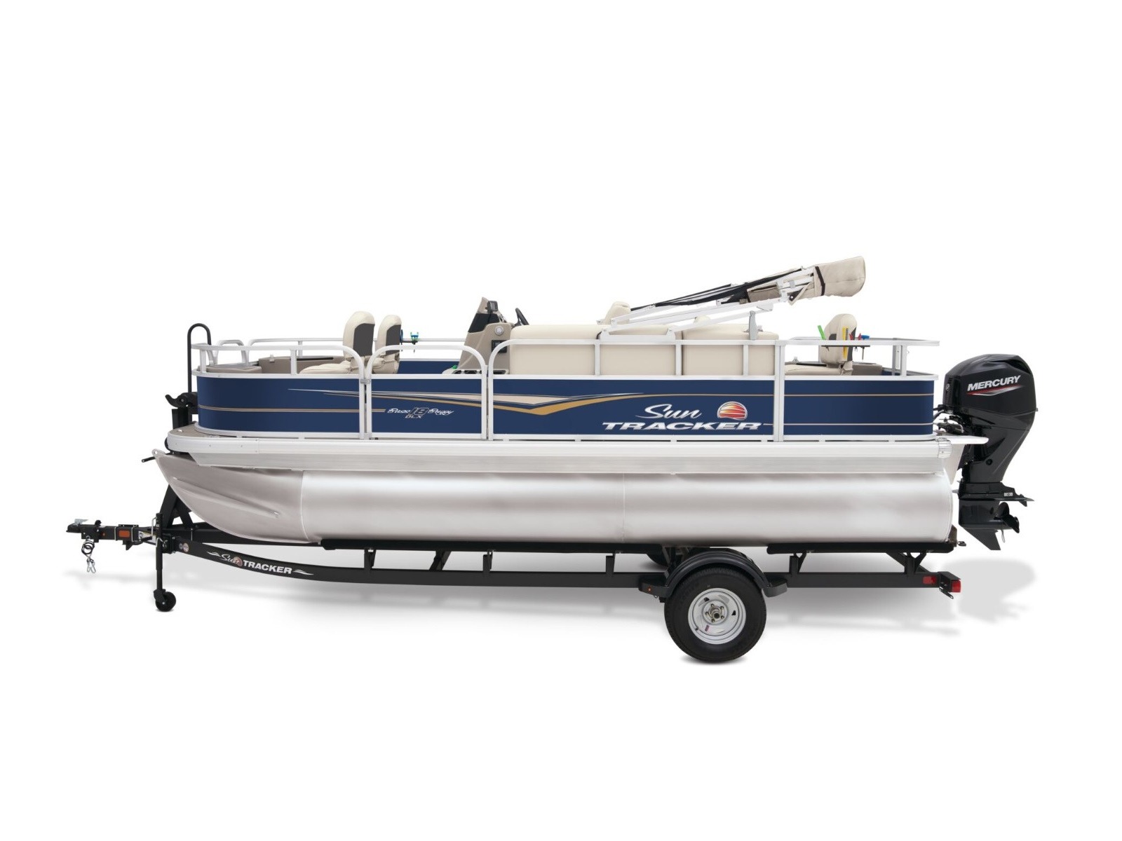 - 9' (2.74 m) SUN TRACKER® QuickLift™ Bimini top w/LED courtesy lights, storage pockets & protective boot (color-coordinated Sand w/Copper Red or Indigo Blue fencing)