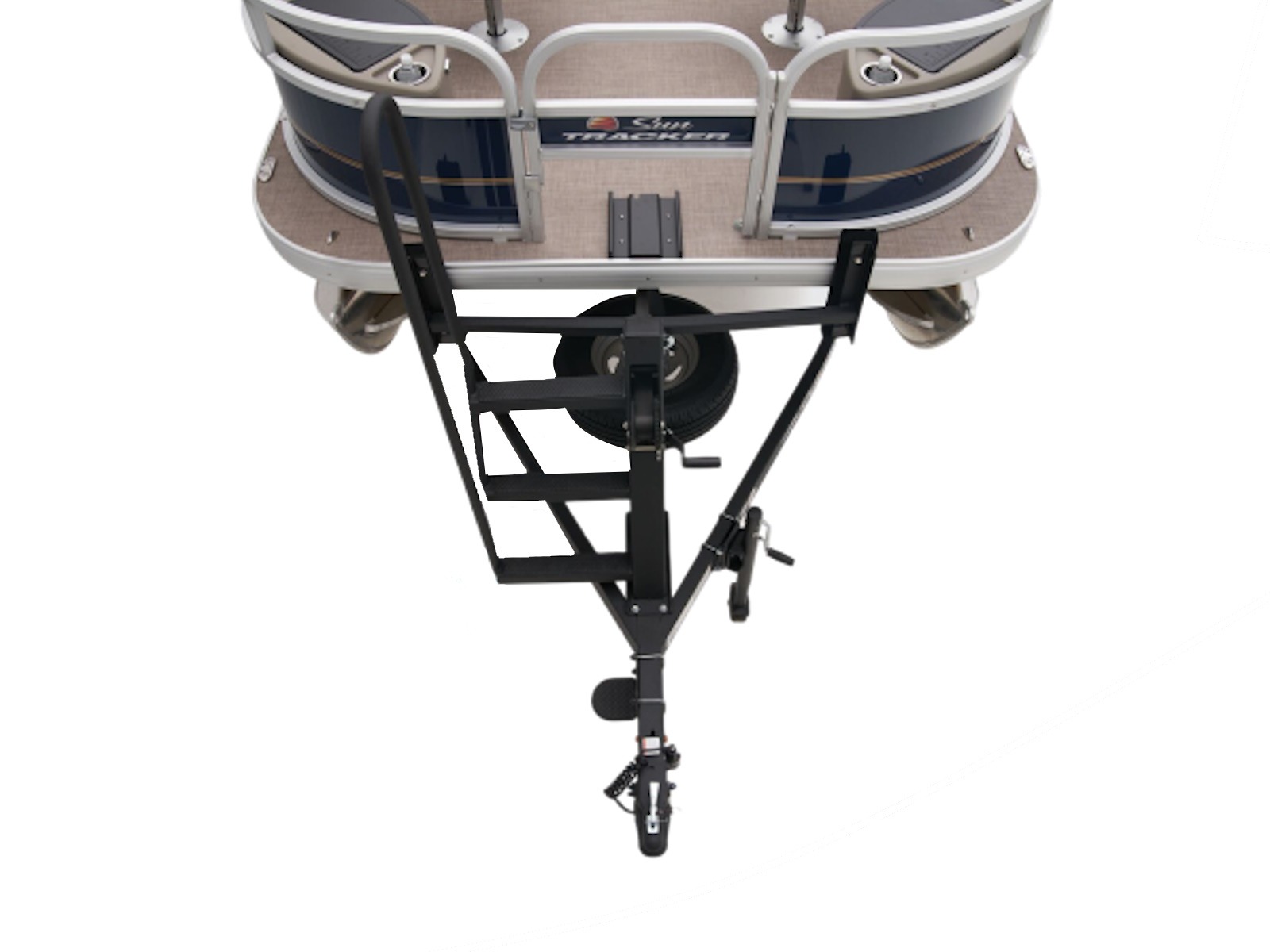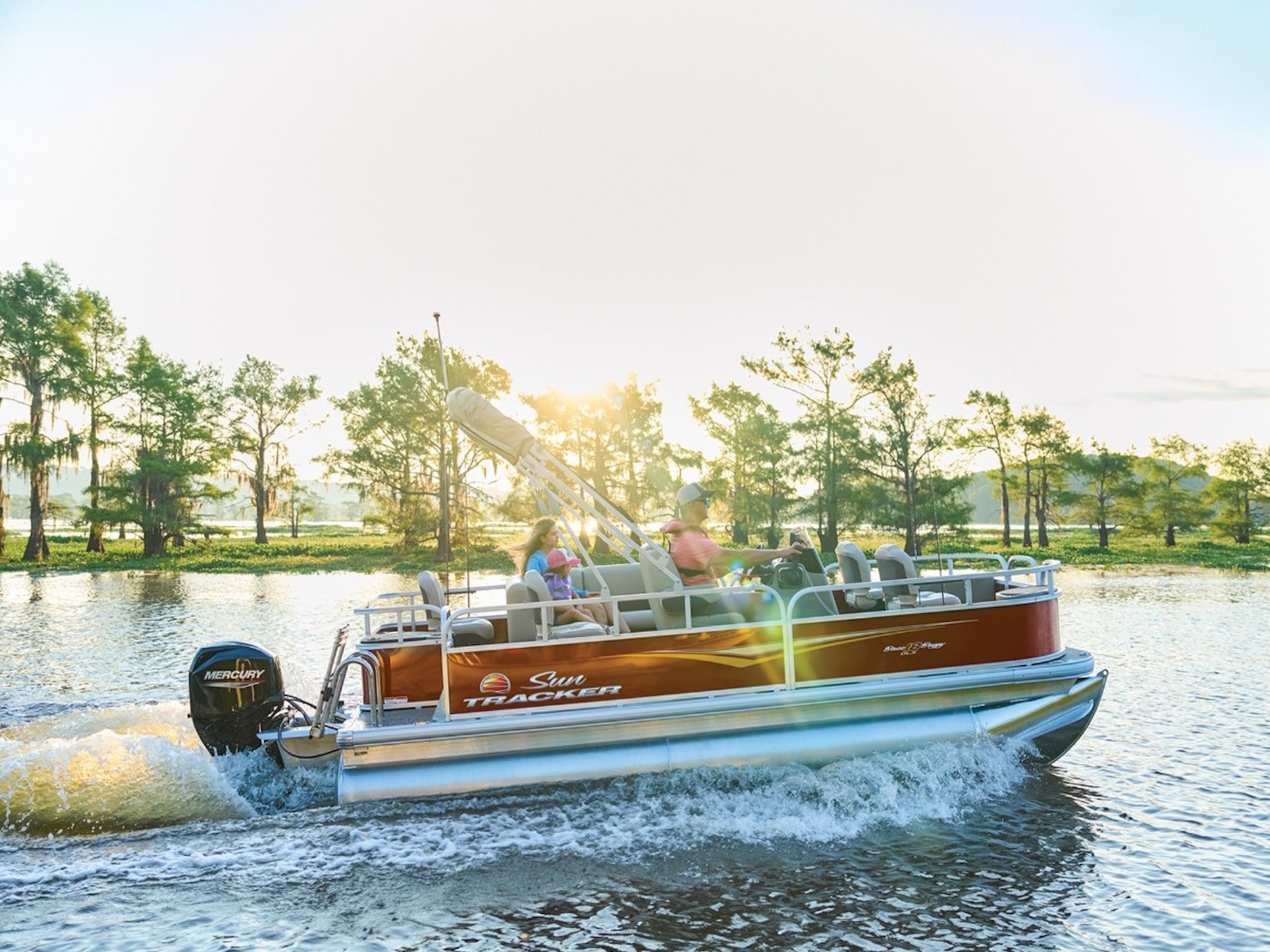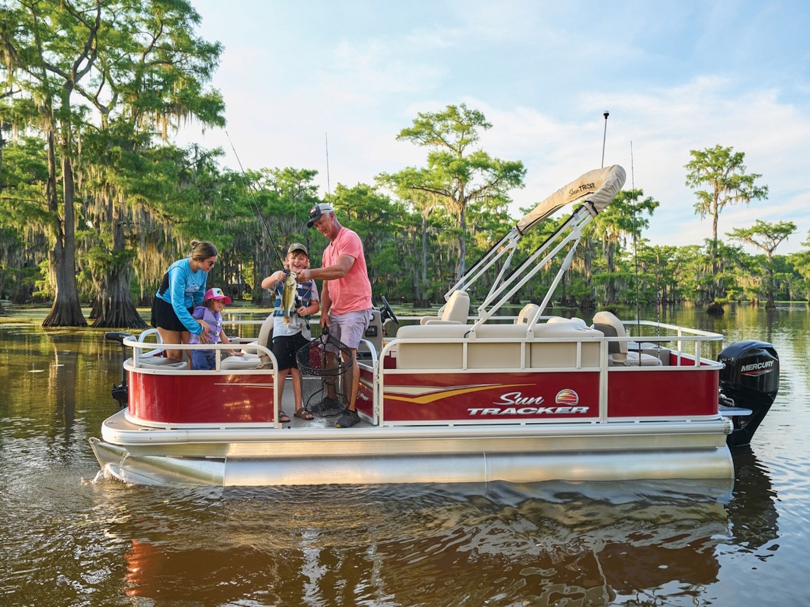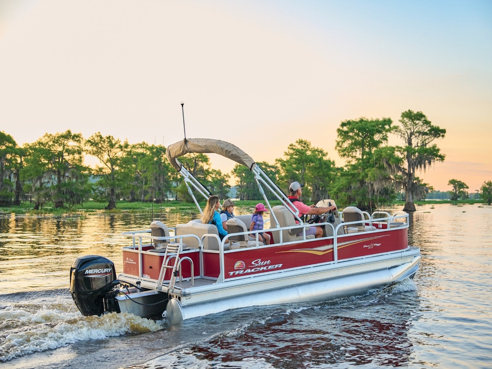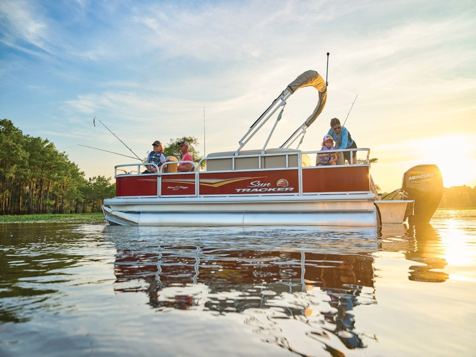 - 9' (2.74 m) SUN TRACKER® QuickLift™ Bimini top w/LED courtesy lights, storage pockets & protective boot (color-coordinated Sand w/Copper Red or Indigo Blue fencing)