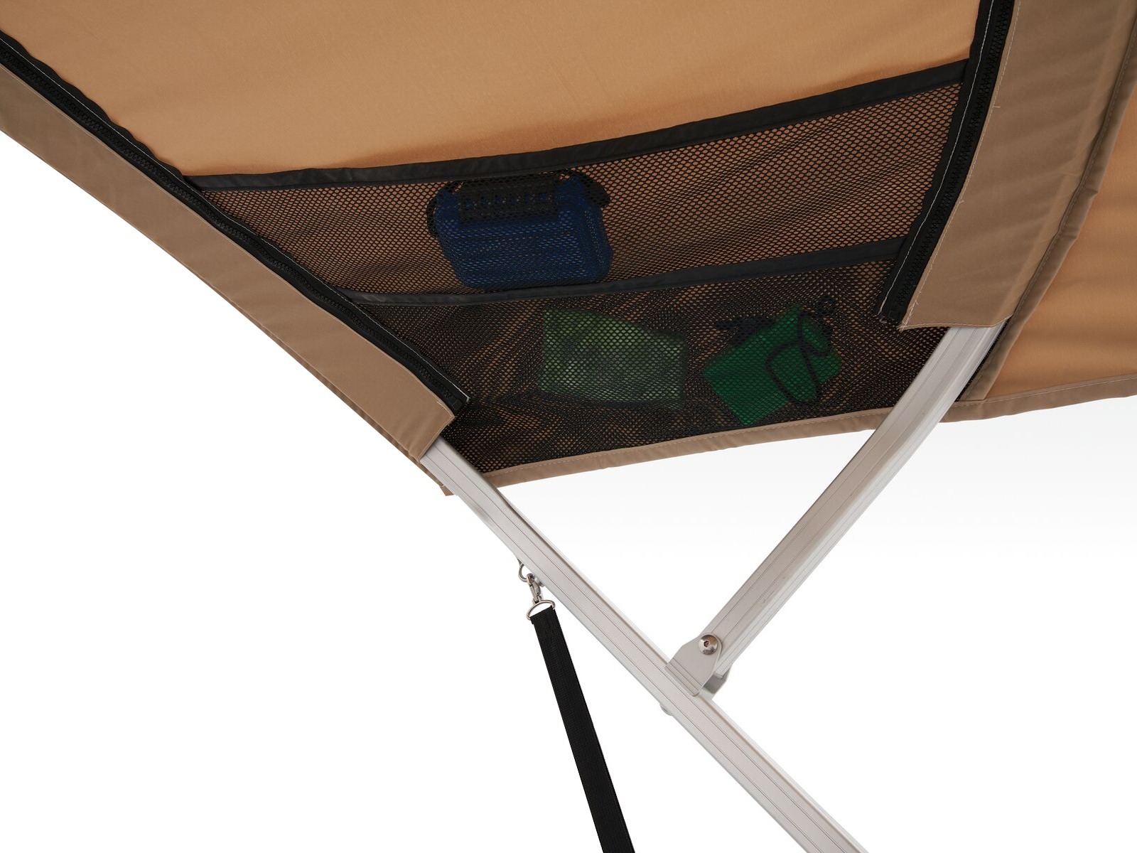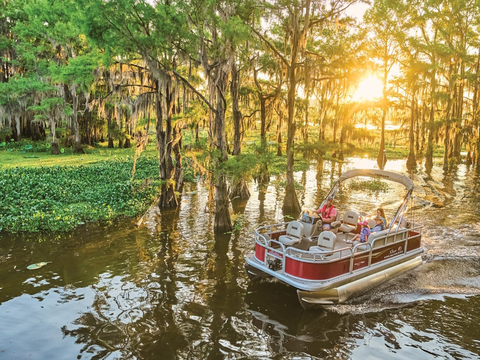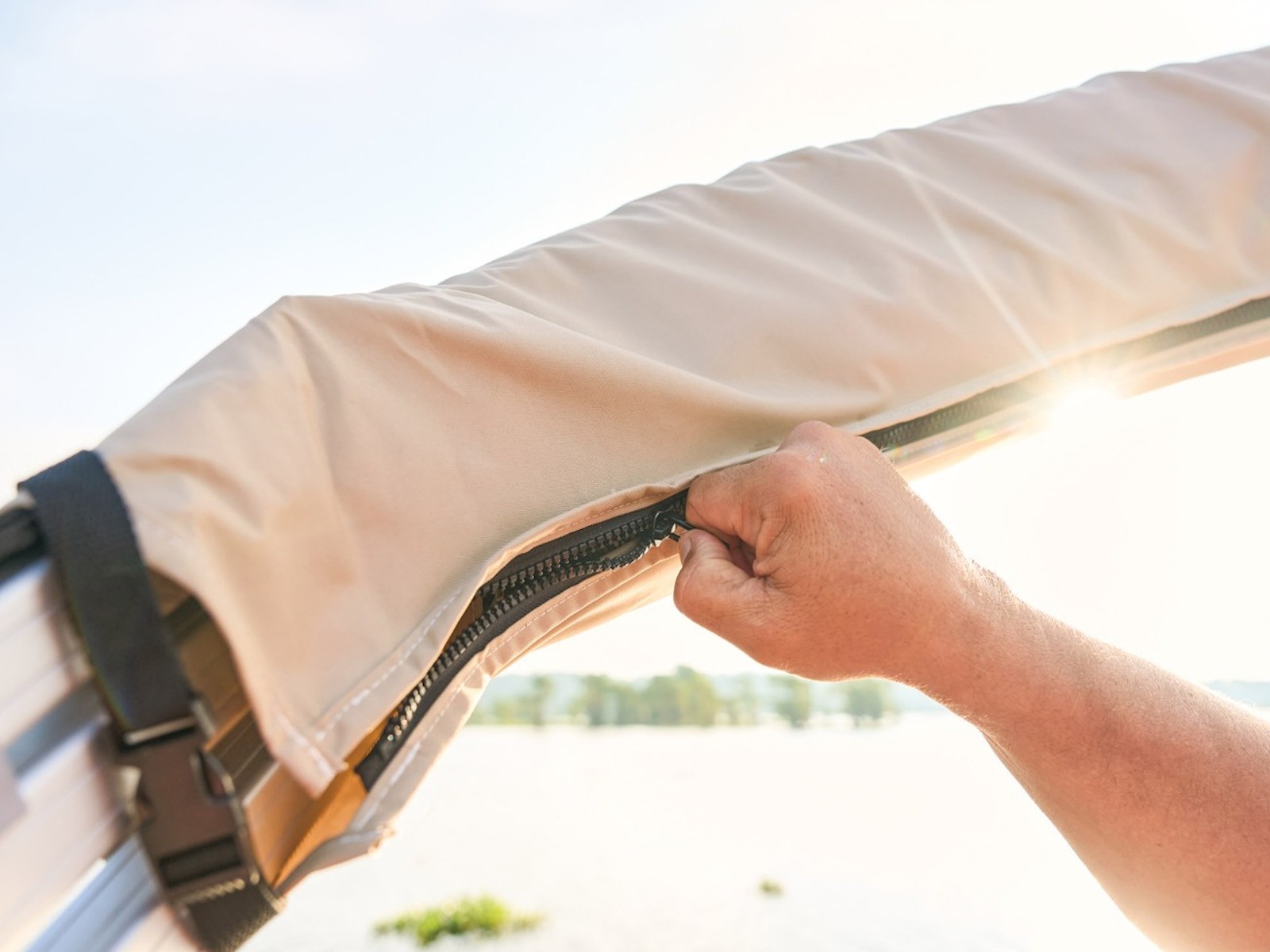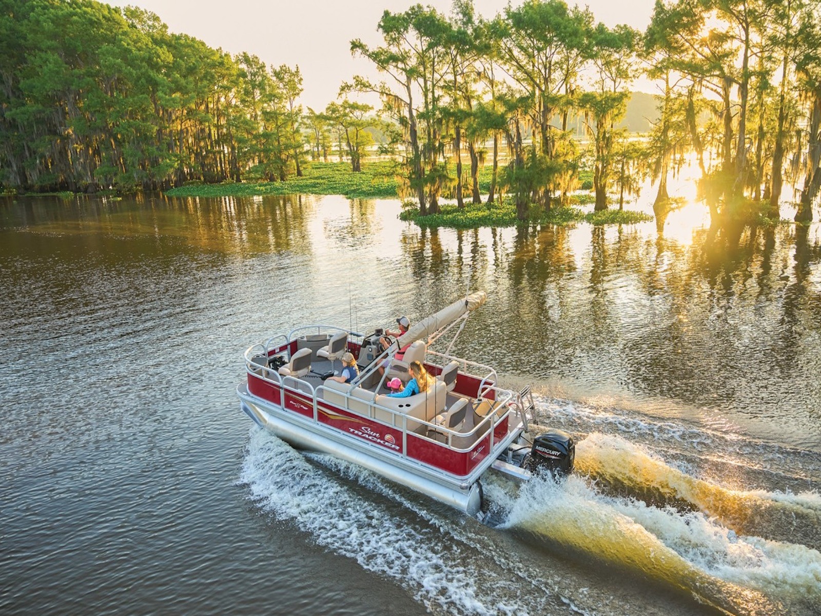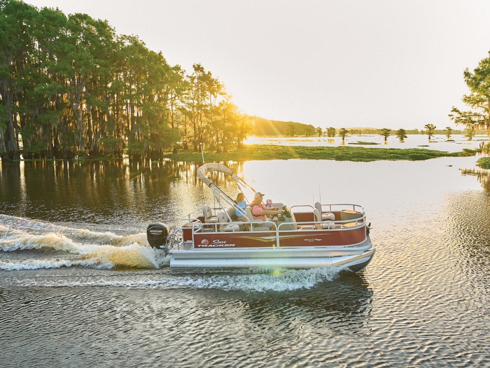 - 9' (2.74 m) SUN TRACKER® QuickLift™ Bimini top w/LED courtesy lights, storage pockets & protective boot (color-coordinated Sand w/Copper Red or Indigo Blue fencing)