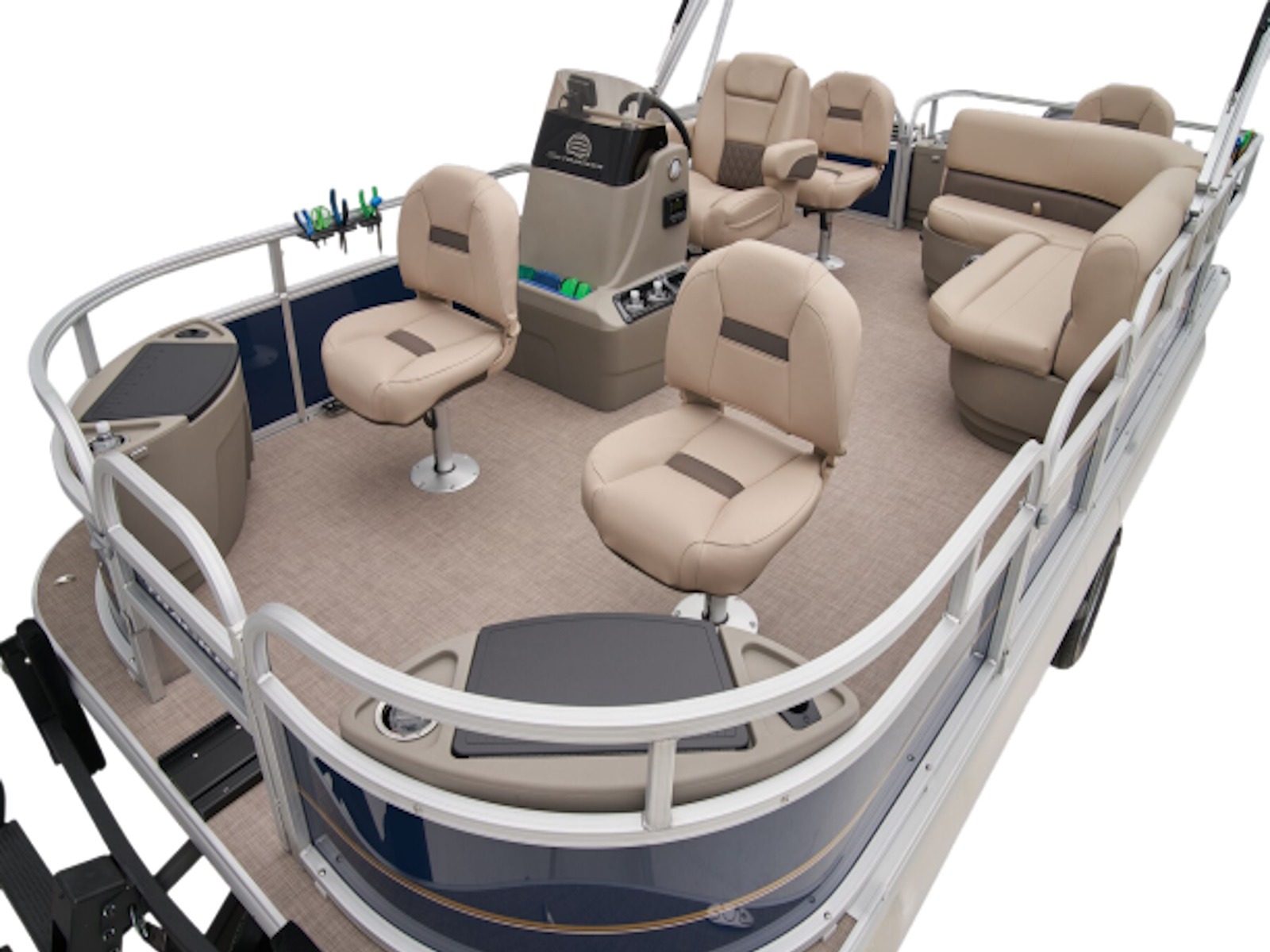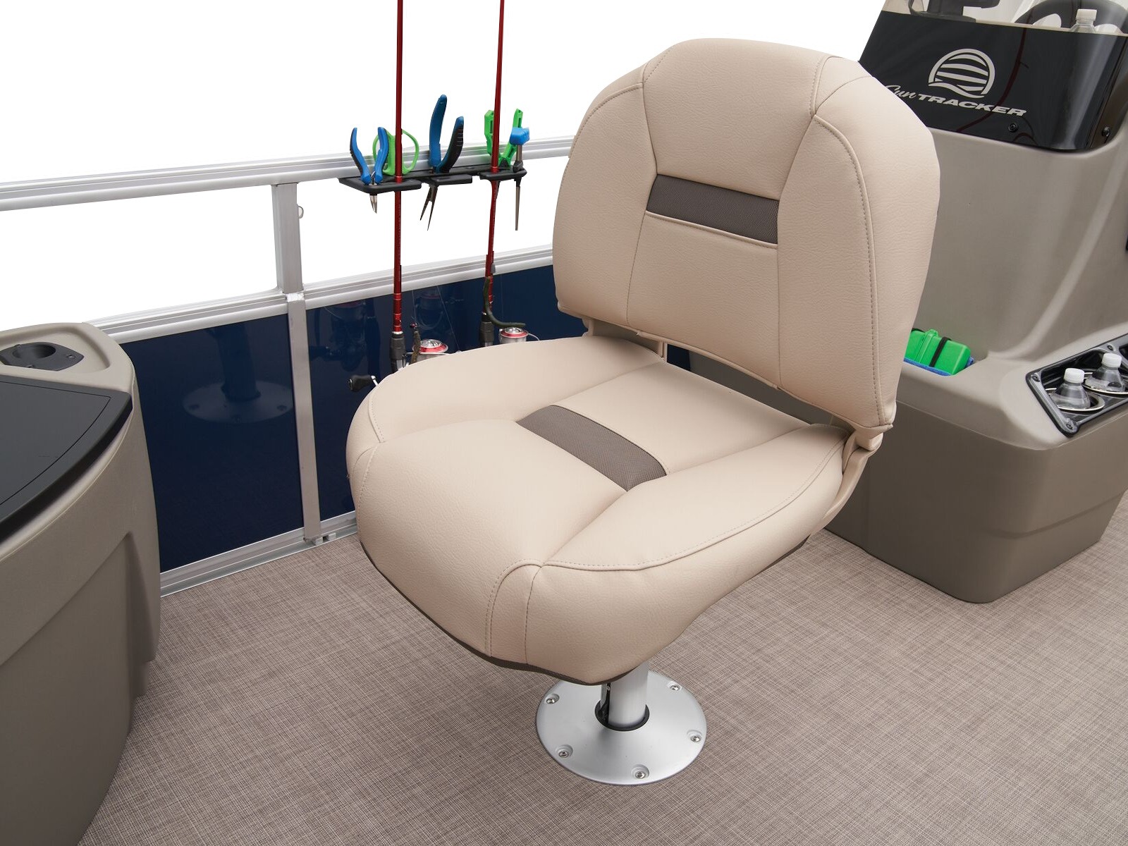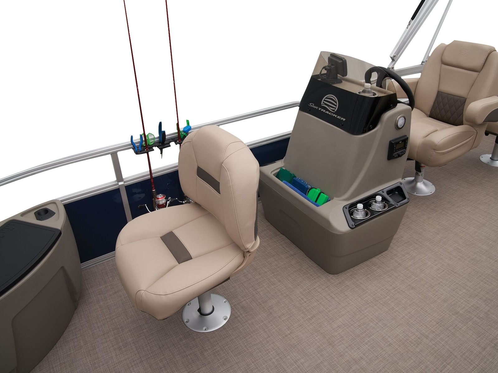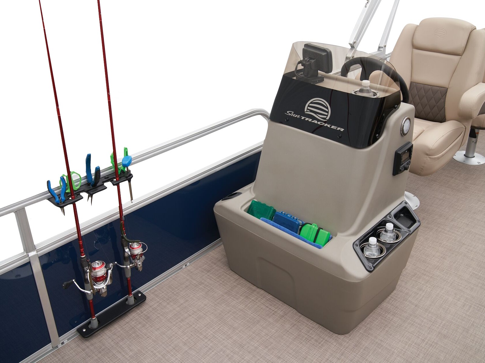 - Driver console w/vertical rod holder, integrated storage, drink holders & side-mounted controls
