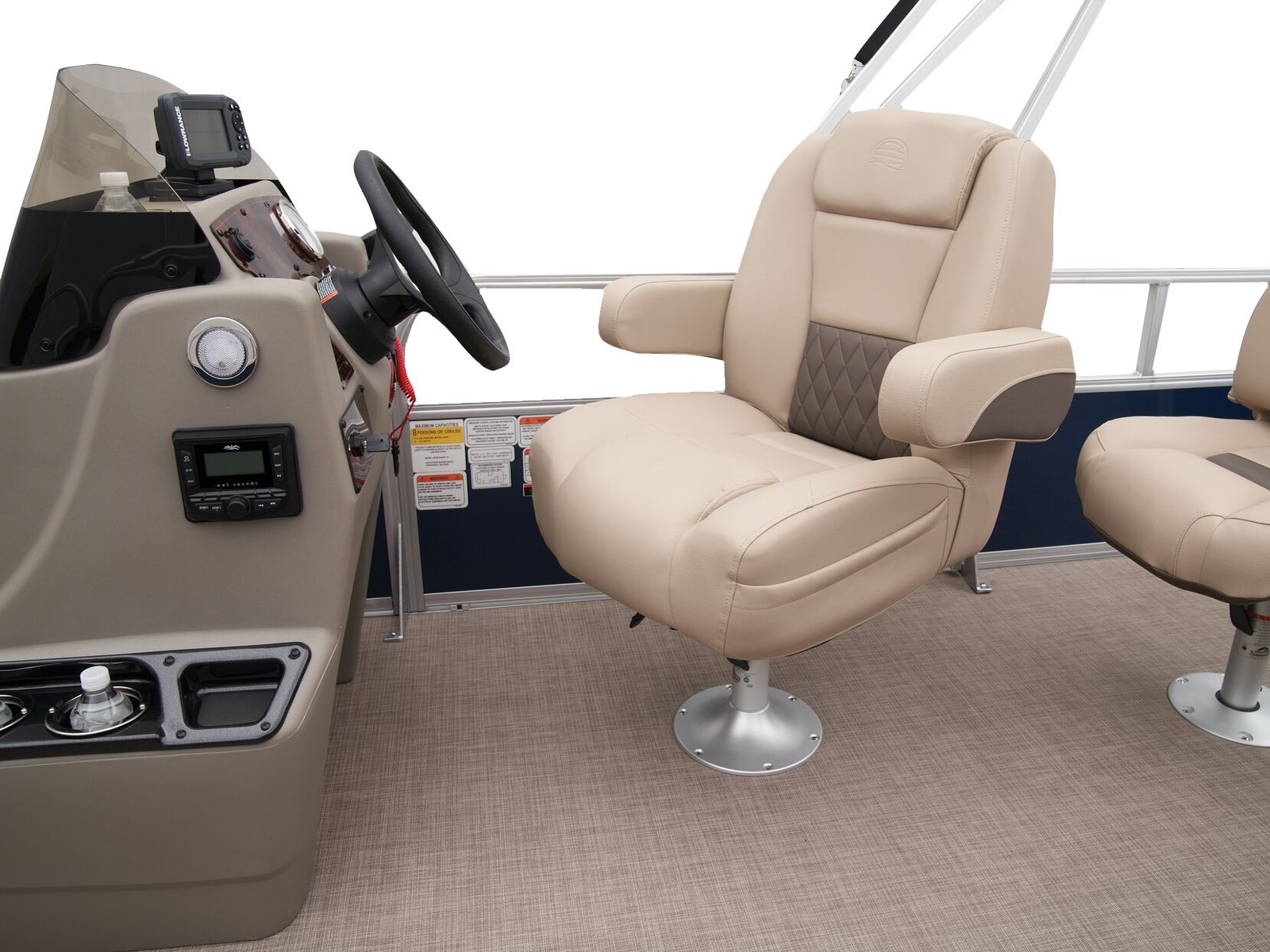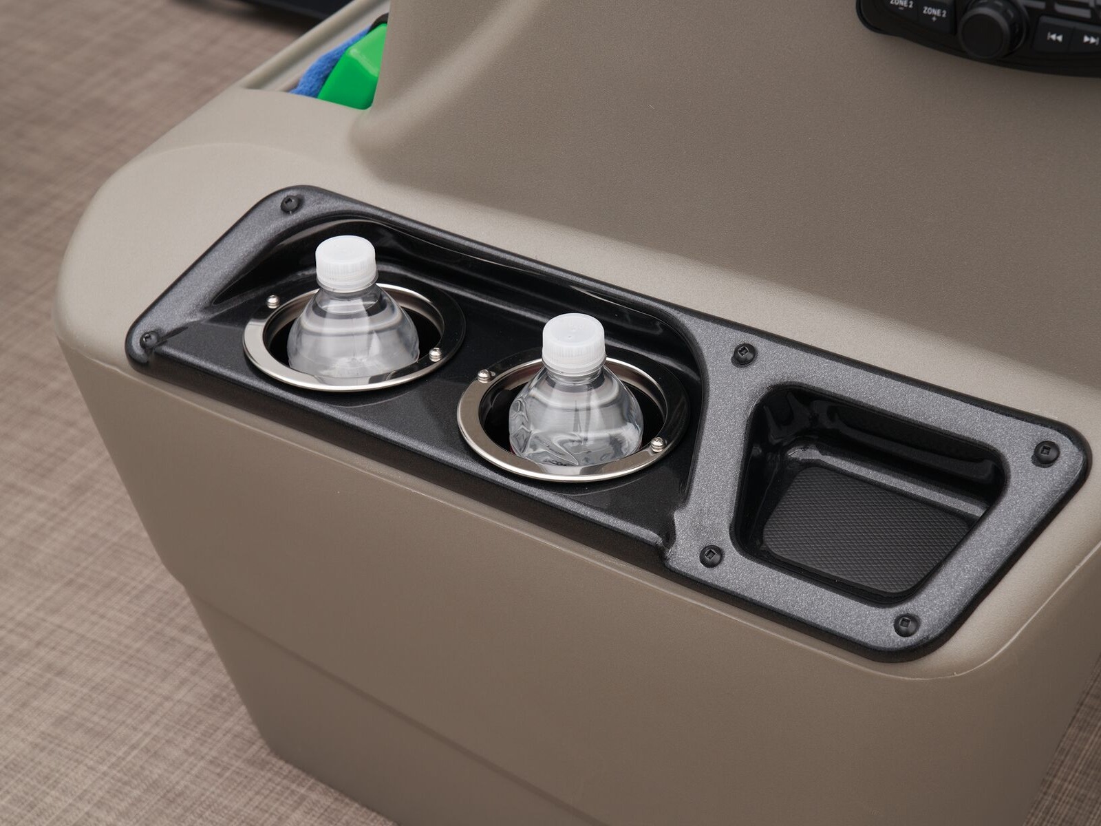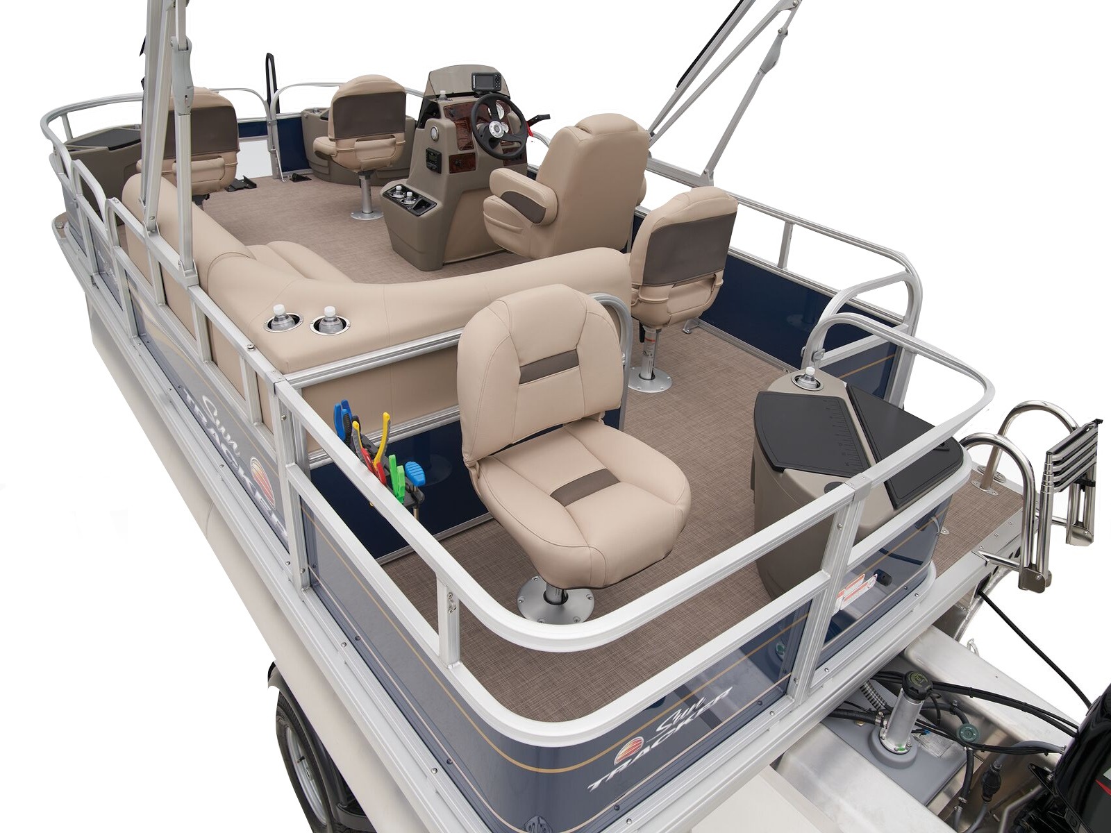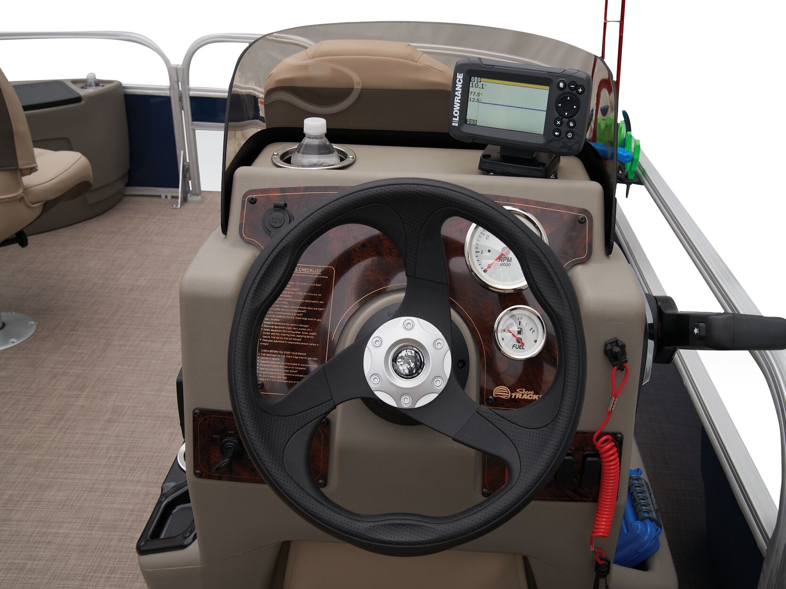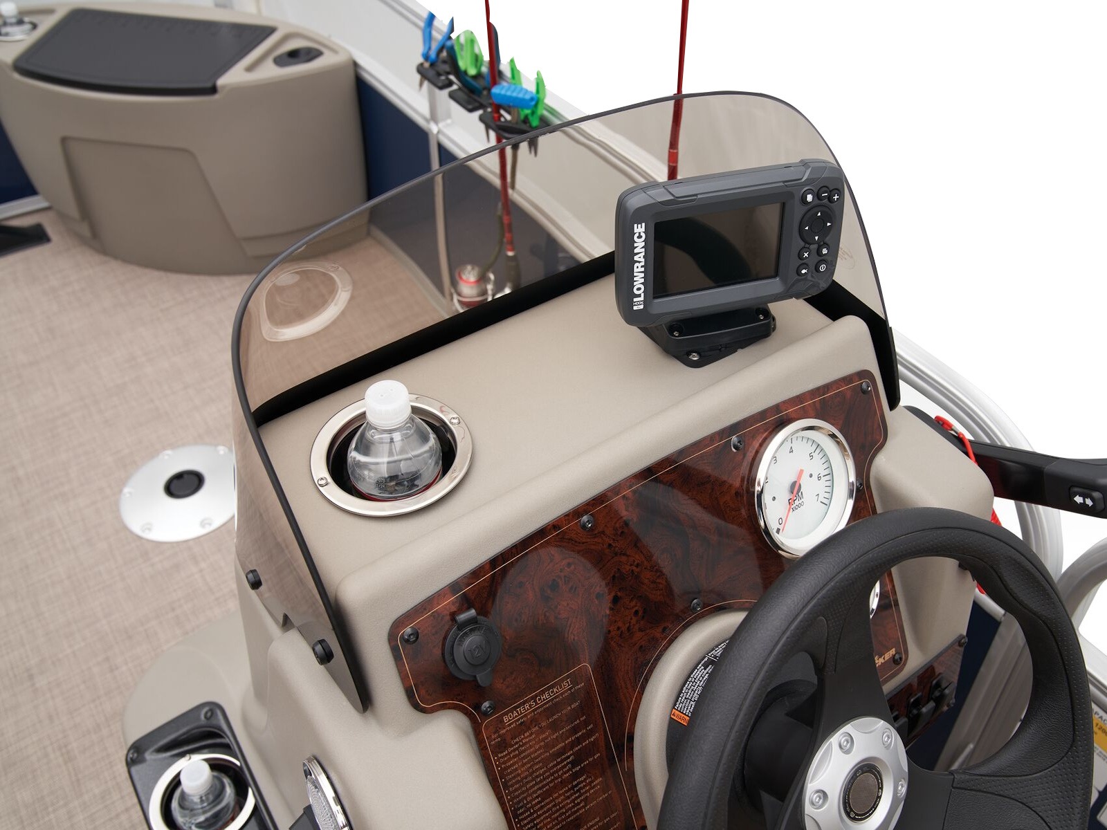 - Driver console w/vertical rod holder, integrated storage, drink holders & side-mounted controls