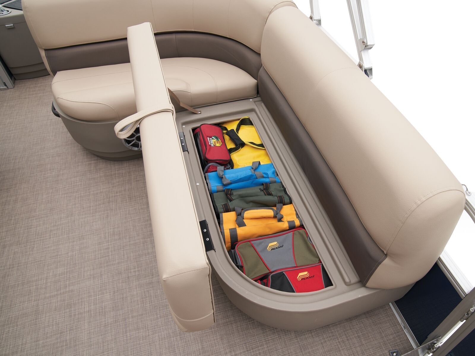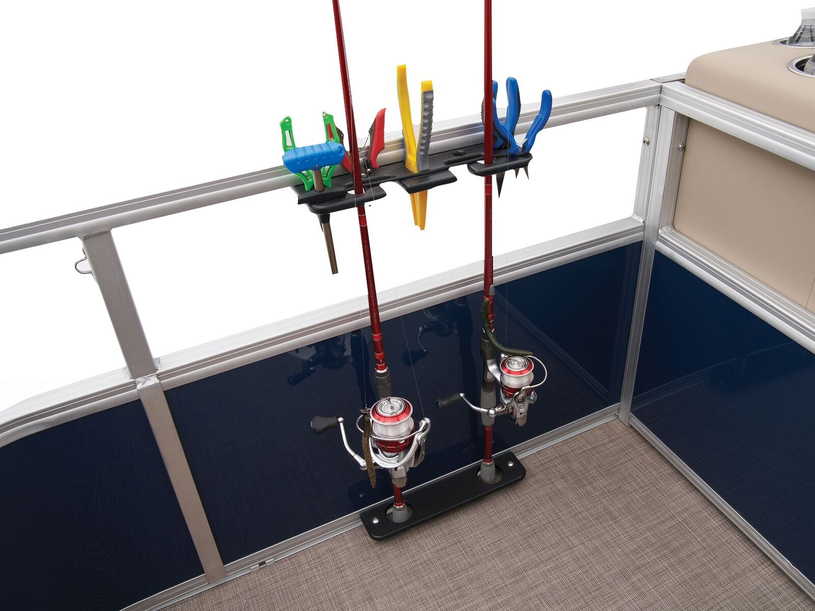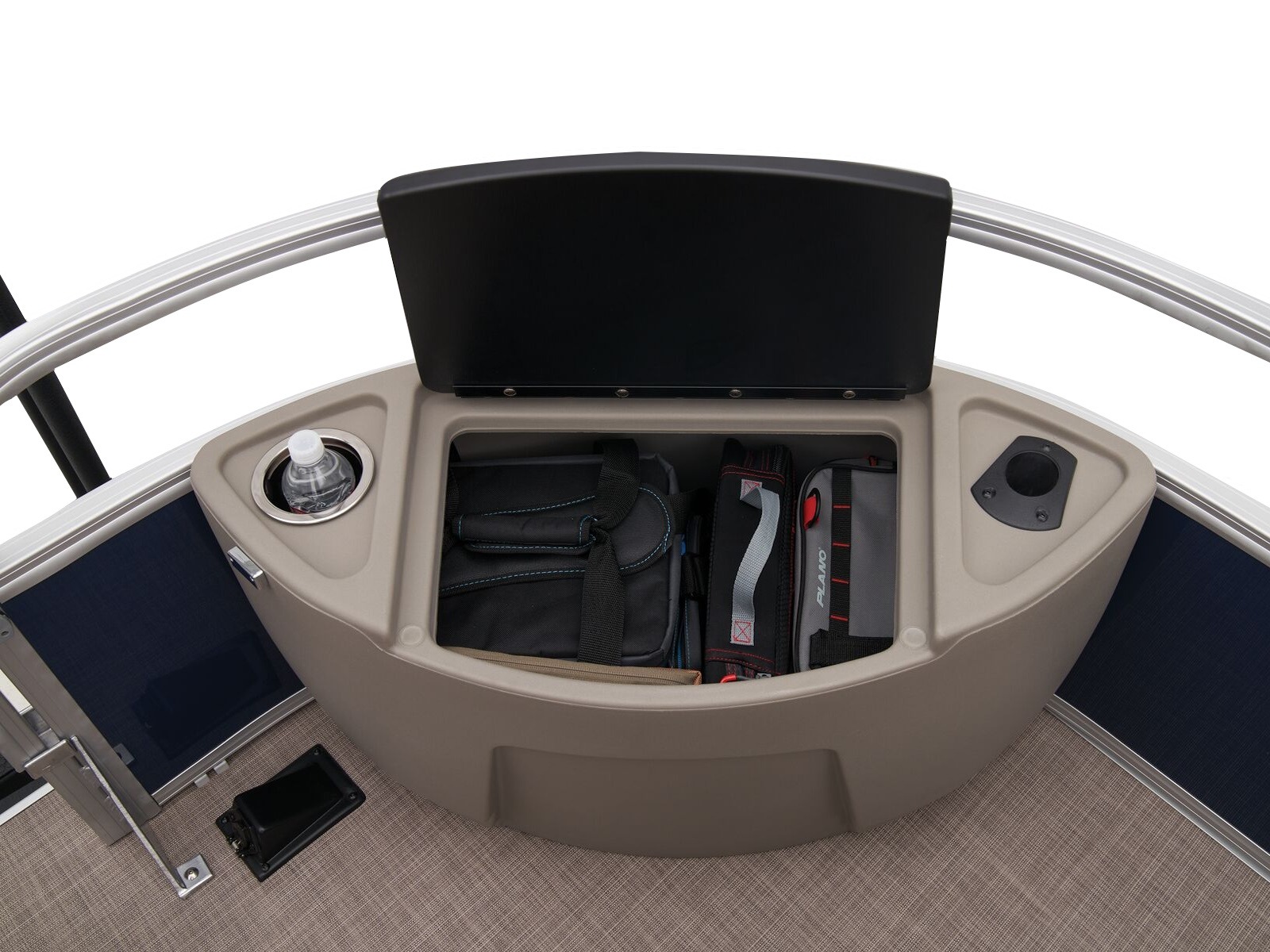 - Front fishing station w/2 pedestal seat bases; rail-mounted rod & tool holders; & bow starboard storage compartment w/rod & drink holders