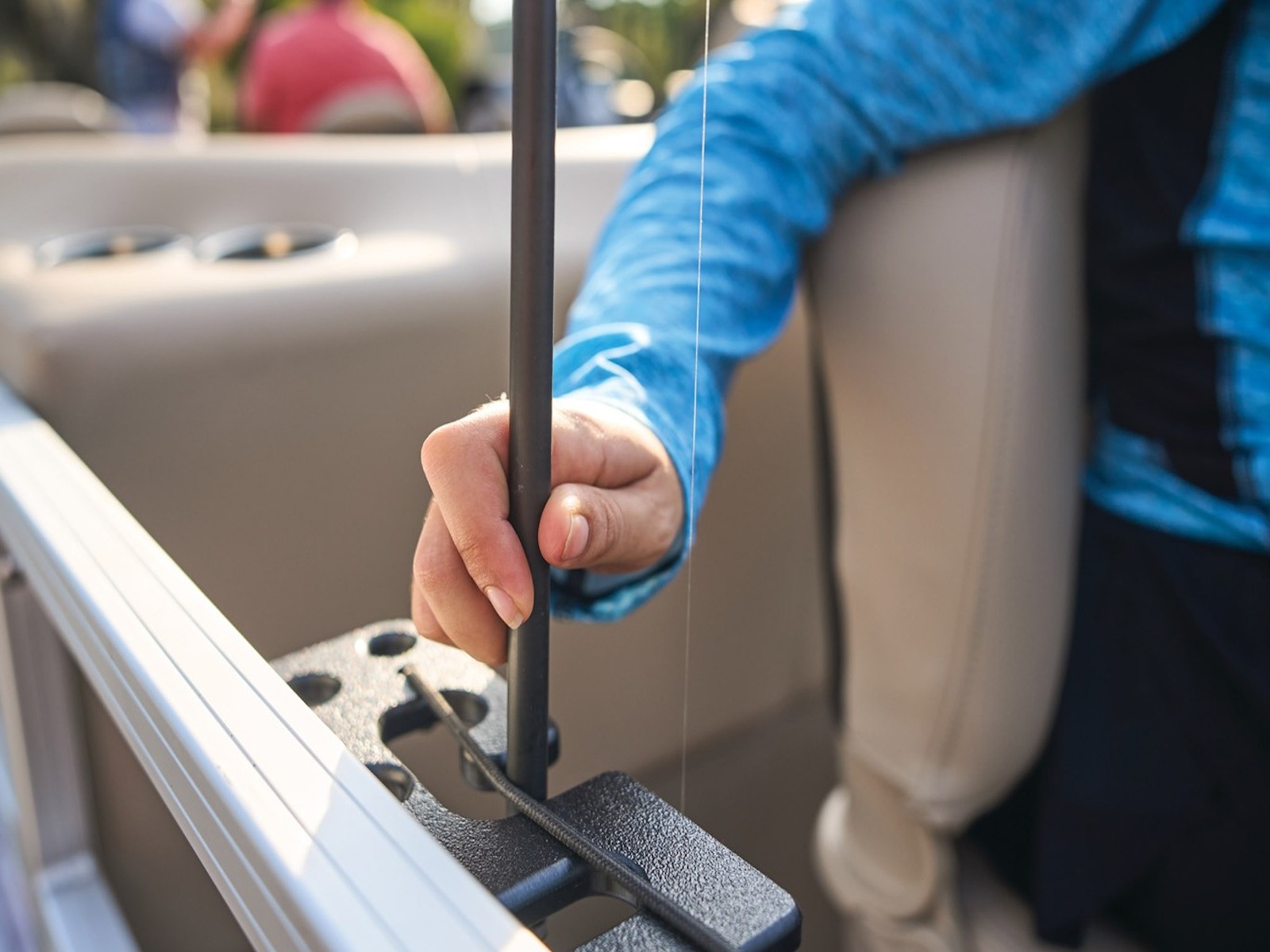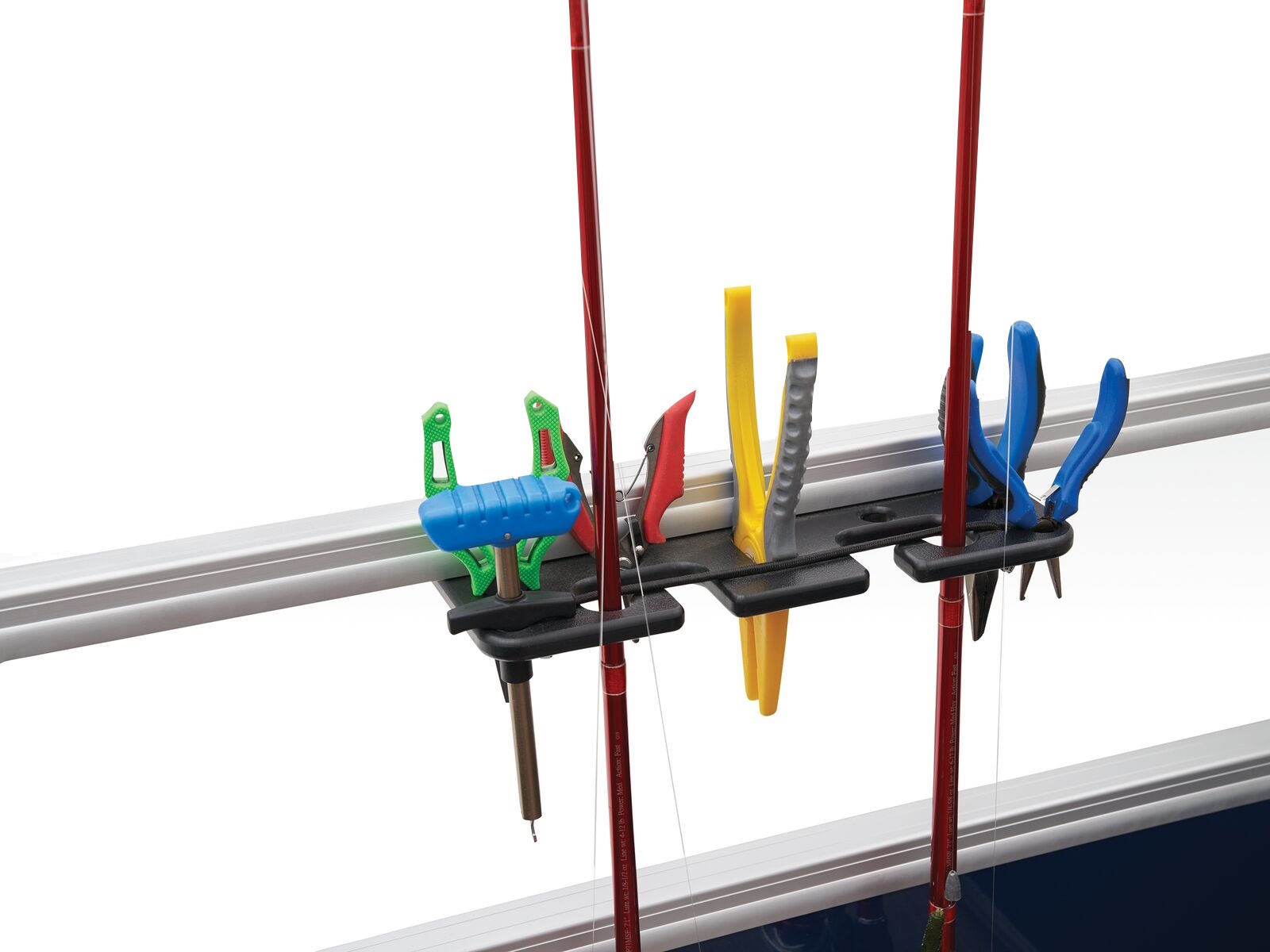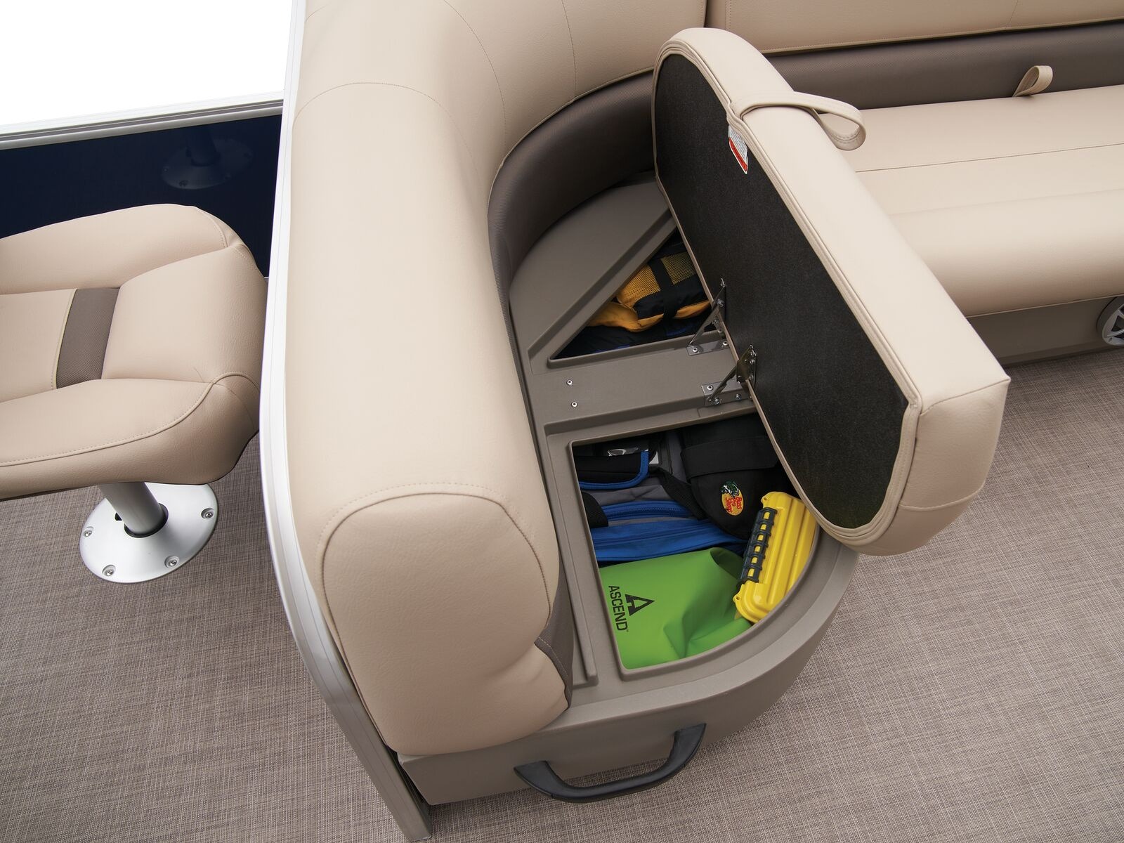- Front fishing station w/2 pedestal seat bases; rail-mounted rod & tool holders; & bow starboard storage compartment w/rod & drink holders