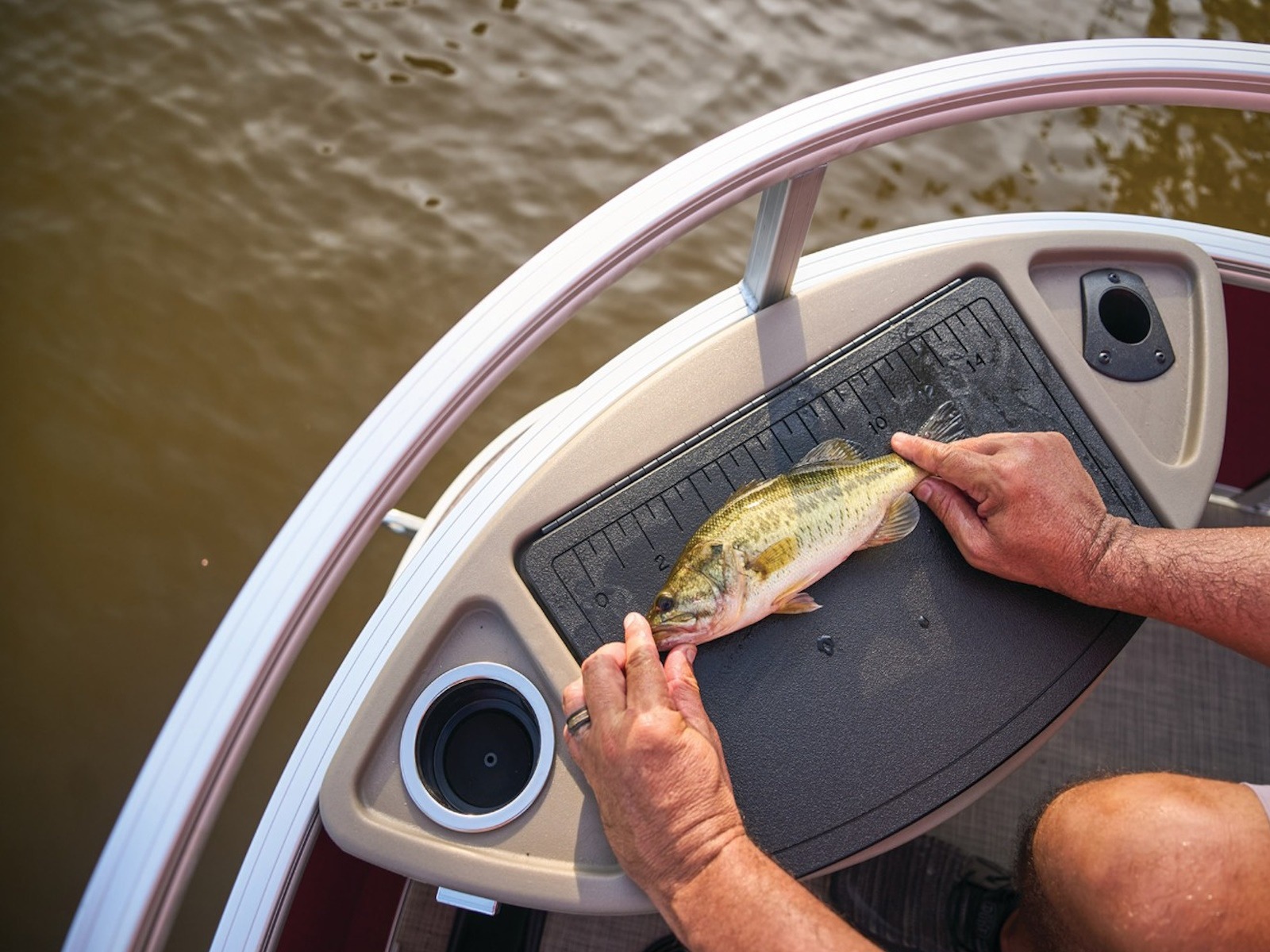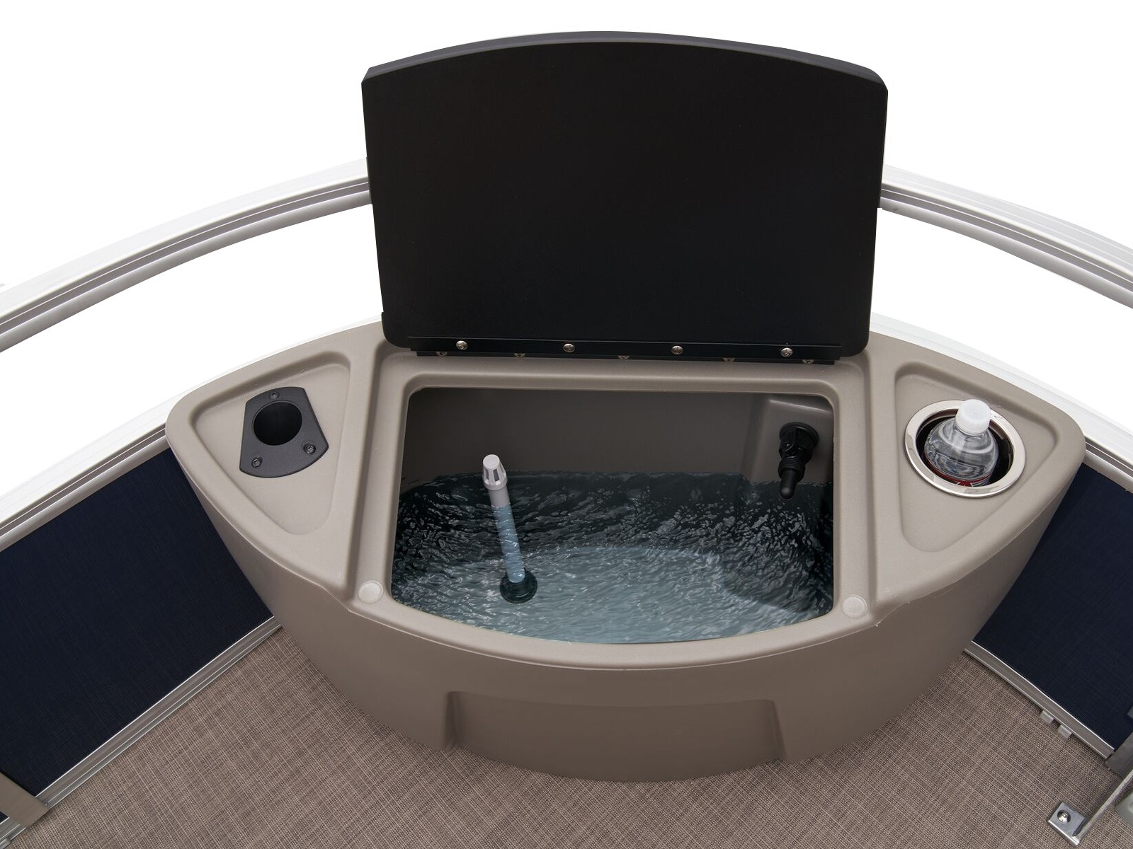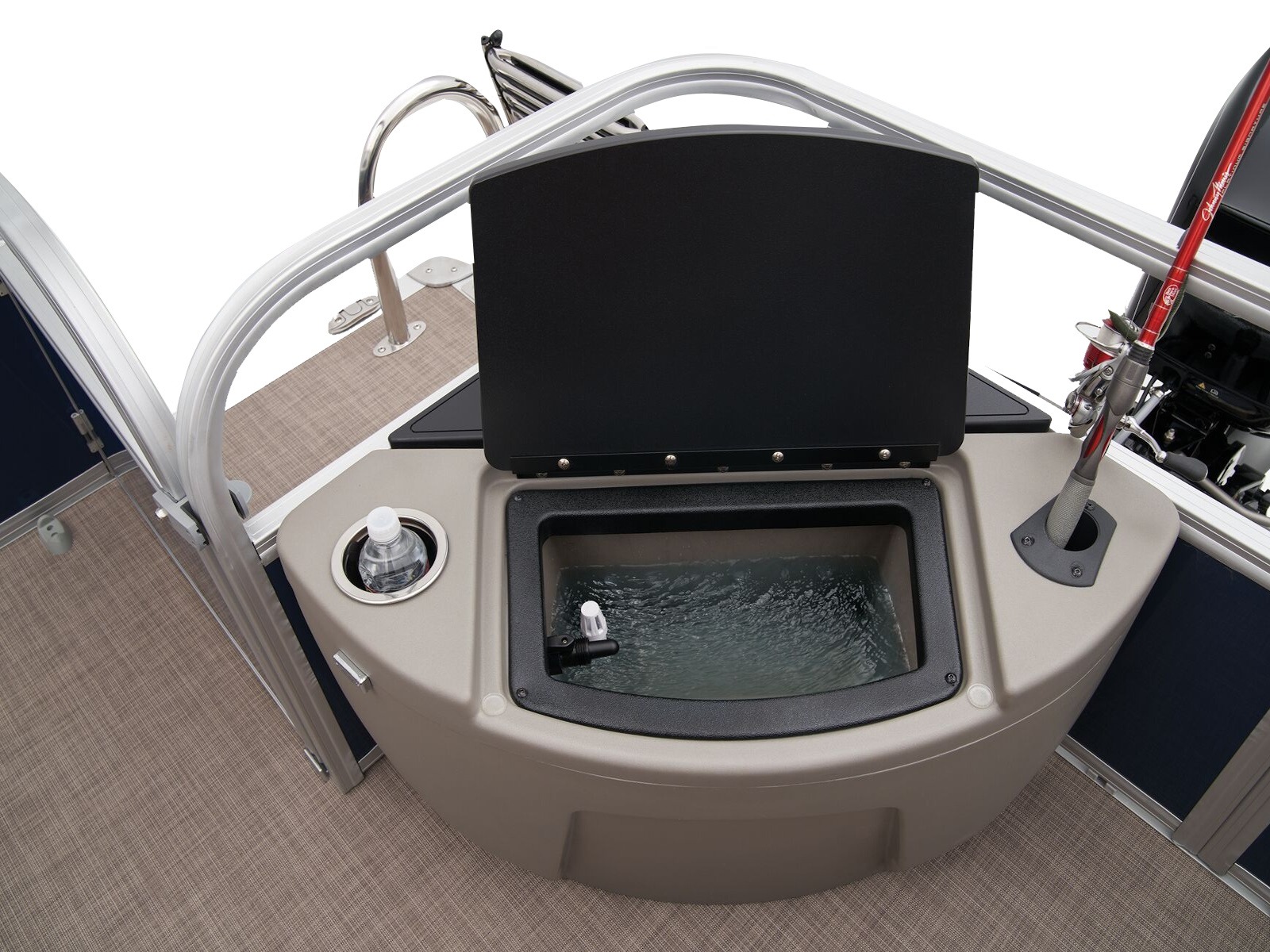 - Bow 10-gal. (37.85 L) aerated livewell w/shutoff valve, drink holder, rod holder & composite lid w/fish ruler