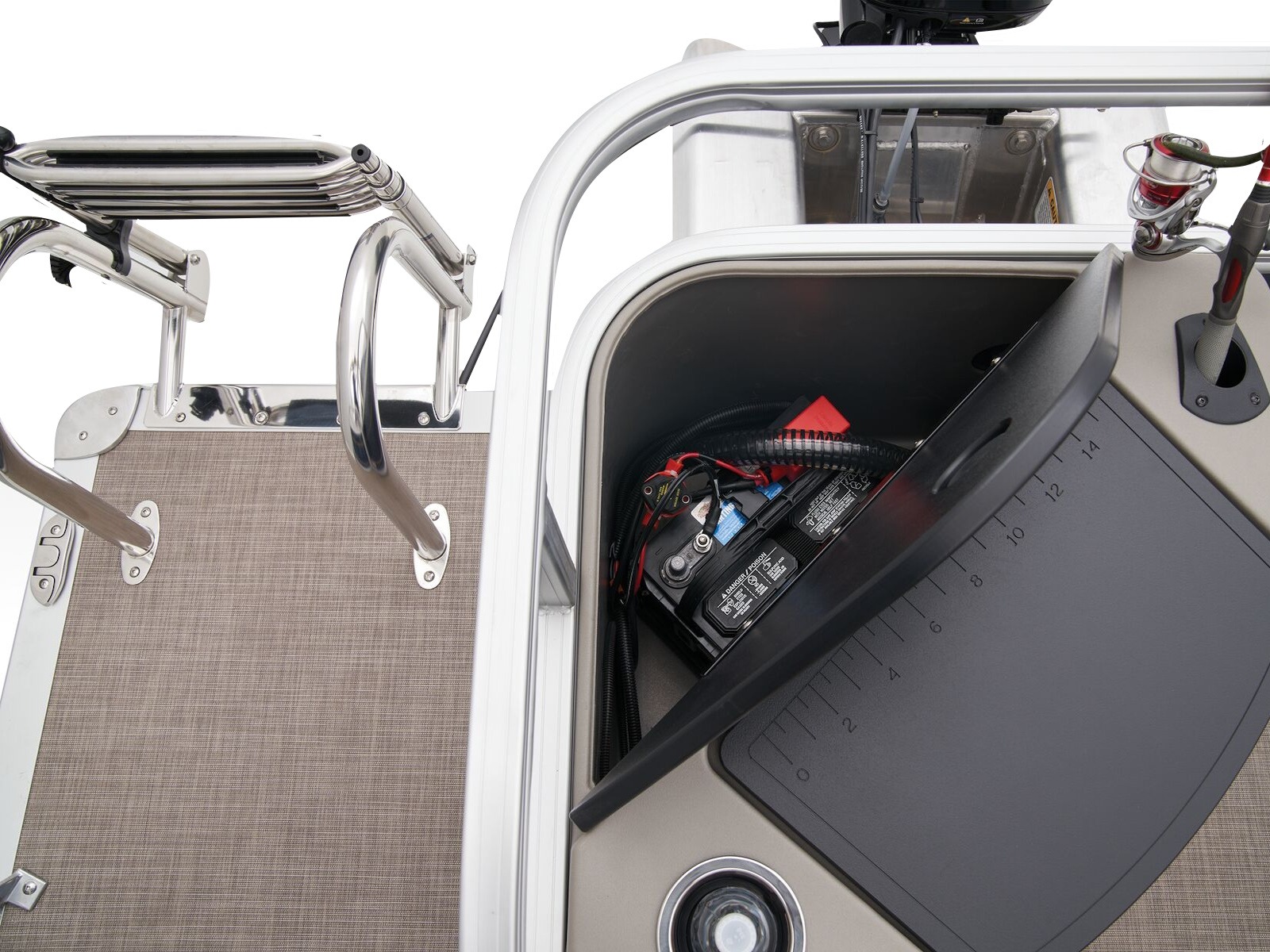 - Aft 8-gal. (30.28 L) aerated livewell/baitwell w/shutoff valve, drink holder, rod holder & composite lid w/fish ruler