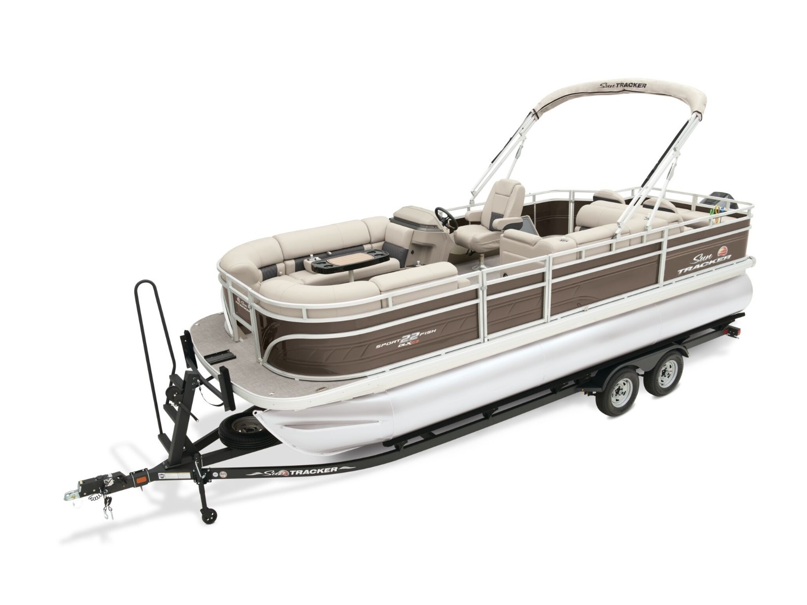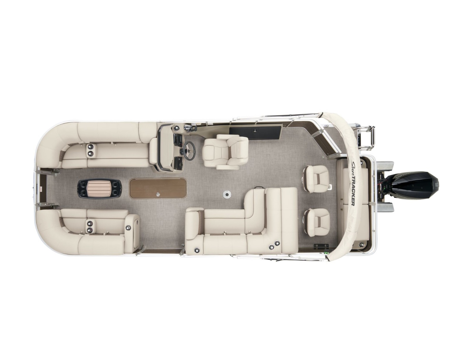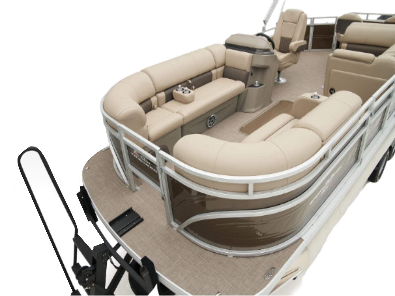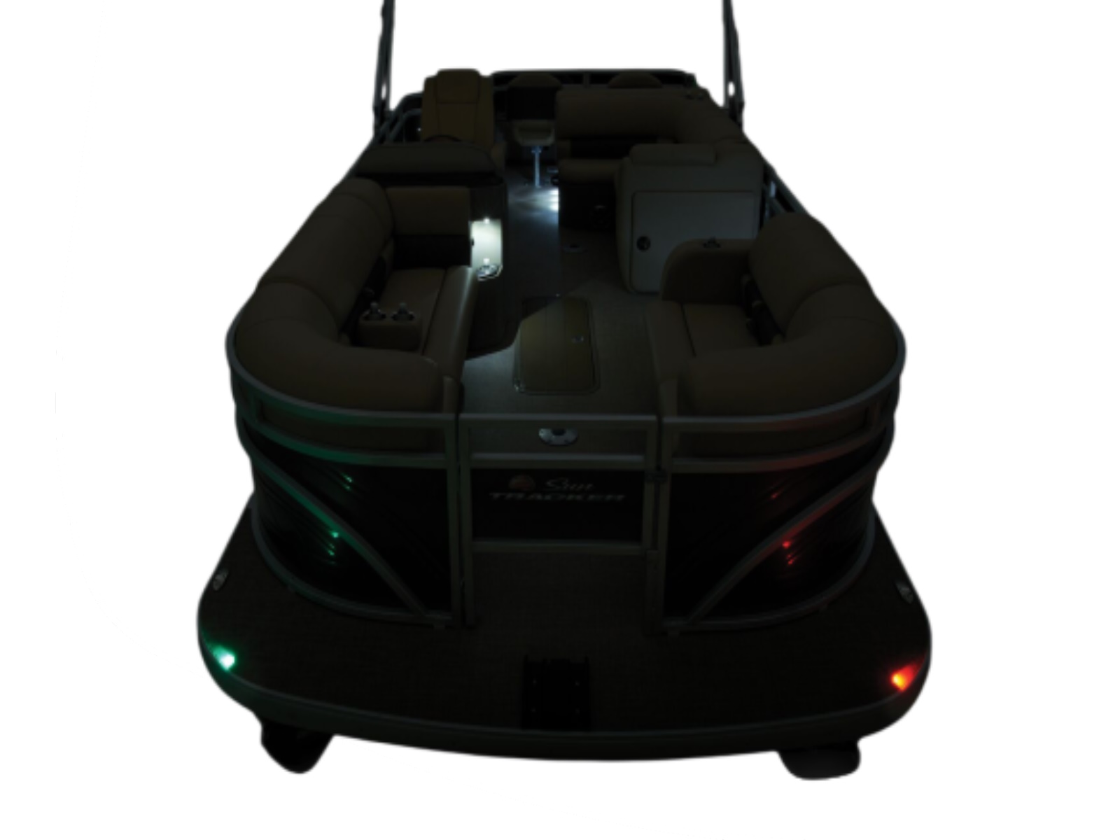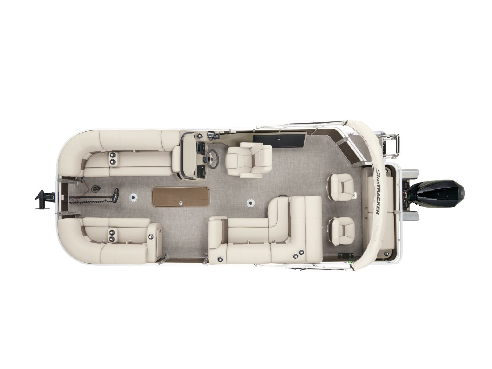 - 10' (3.05 m) SUN TRACKER® QuickLift™ Bimini top w/LED courtesy lights, storage pockets & protective boot (color-coordinated Black w/Black fencing or Sand w/Caribou fencing)