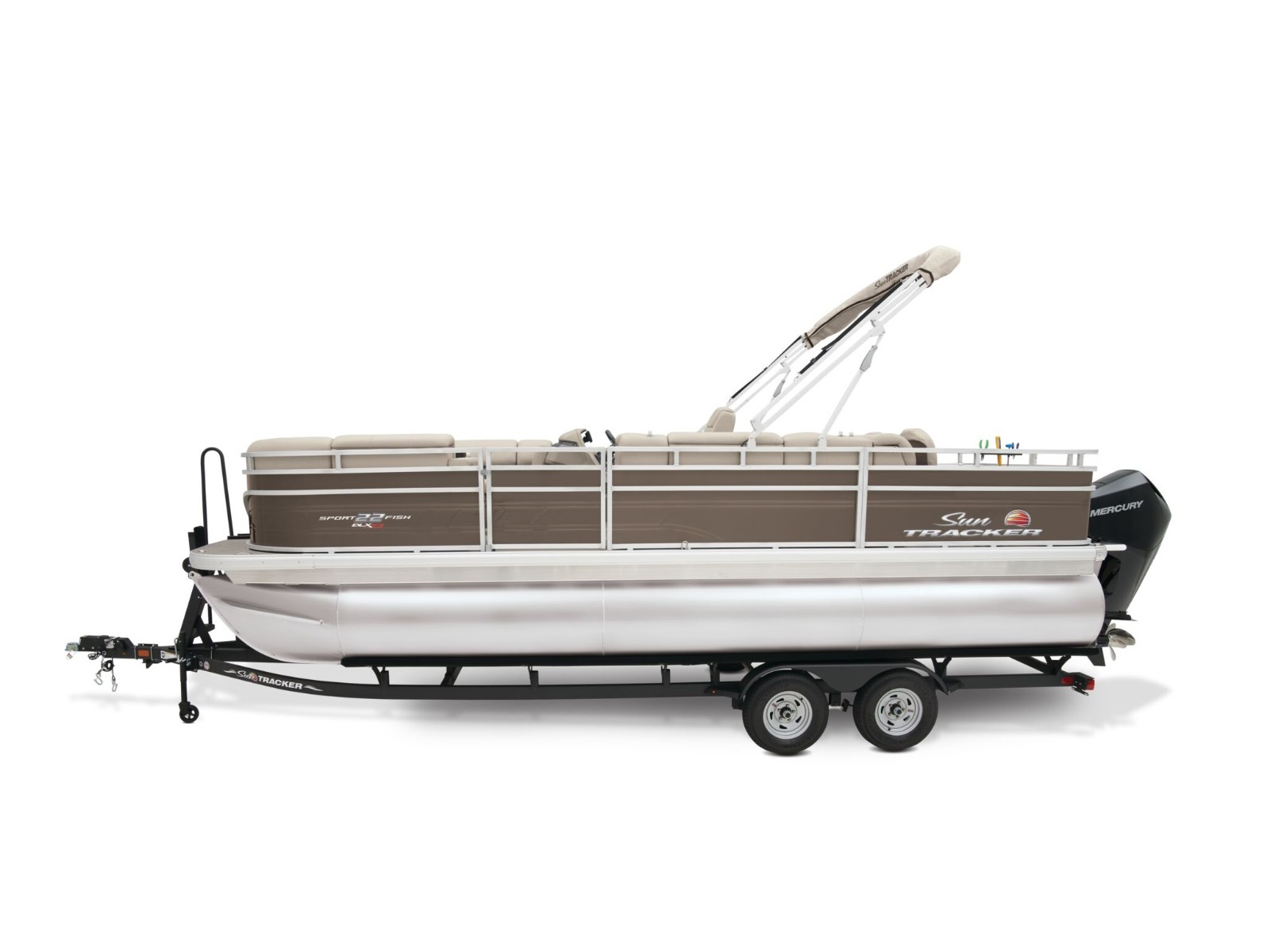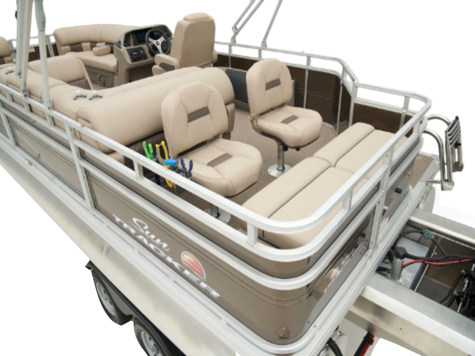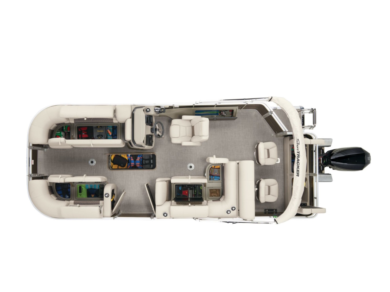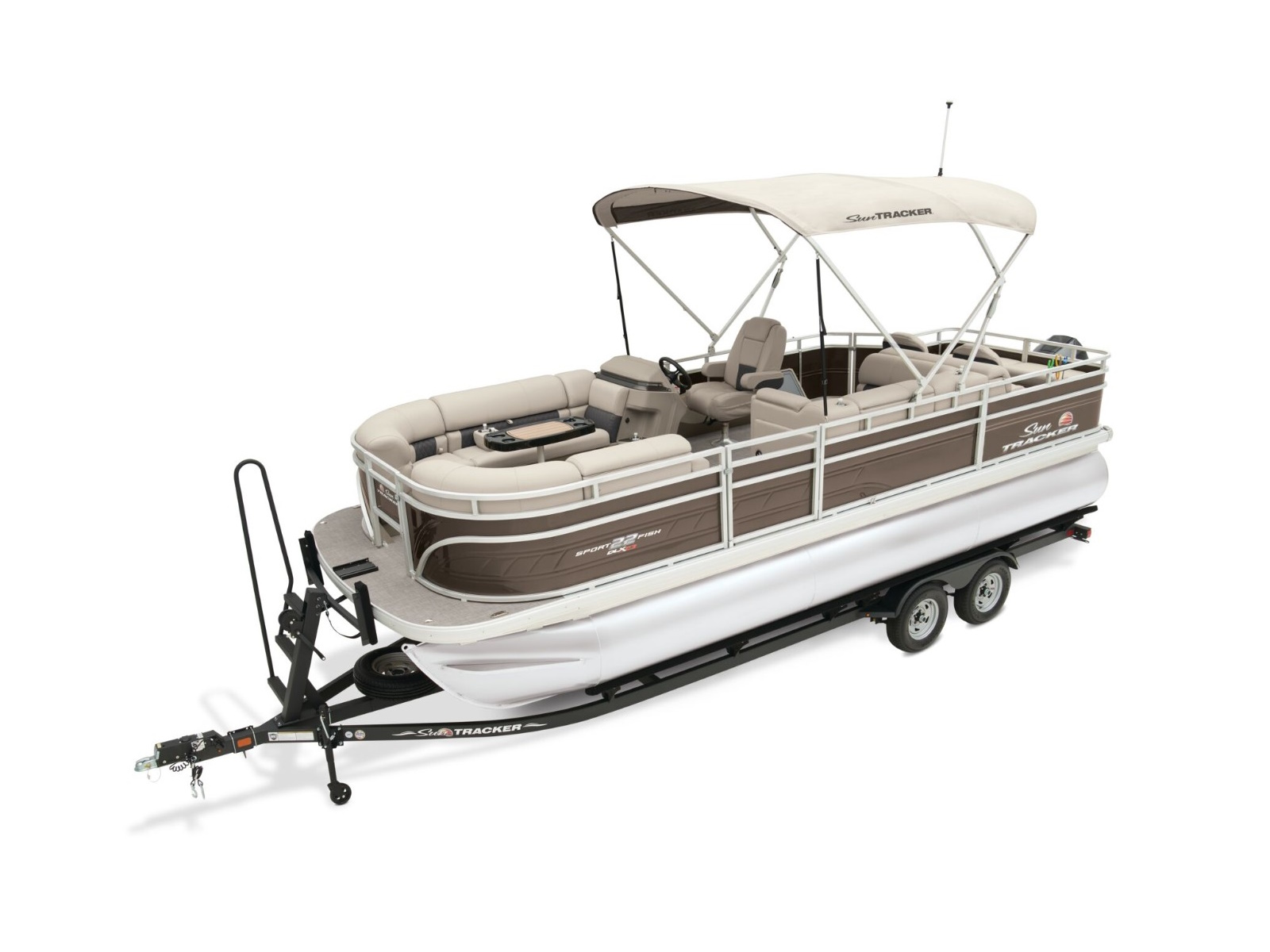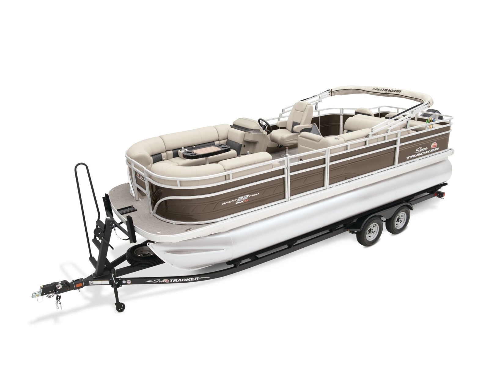 - 10' (3.05 m) SUN TRACKER® QuickLift™ Bimini top w/LED courtesy lights, storage pockets & protective boot (color-coordinated Black w/Black fencing or Sand w/Caribou fencing)