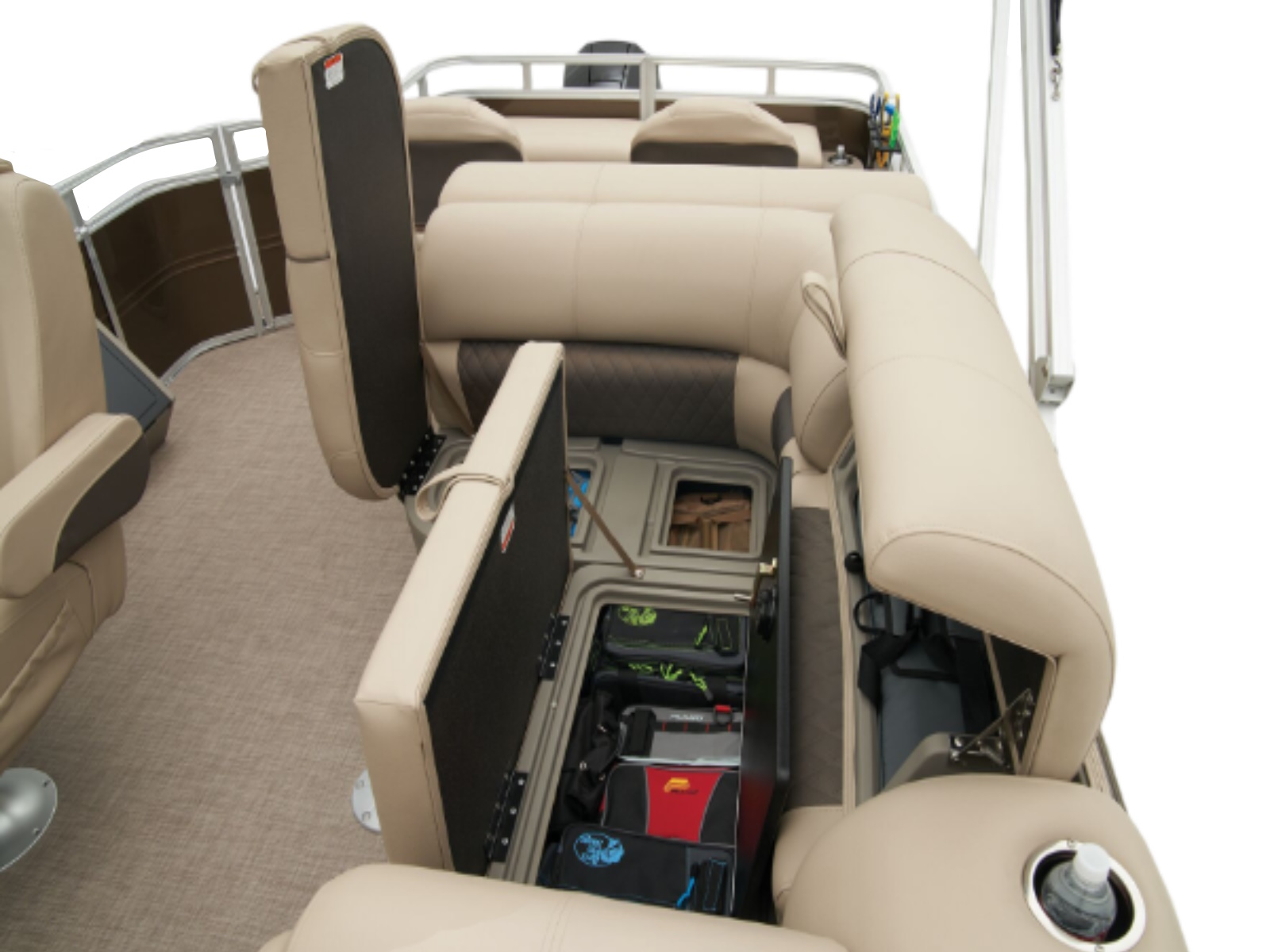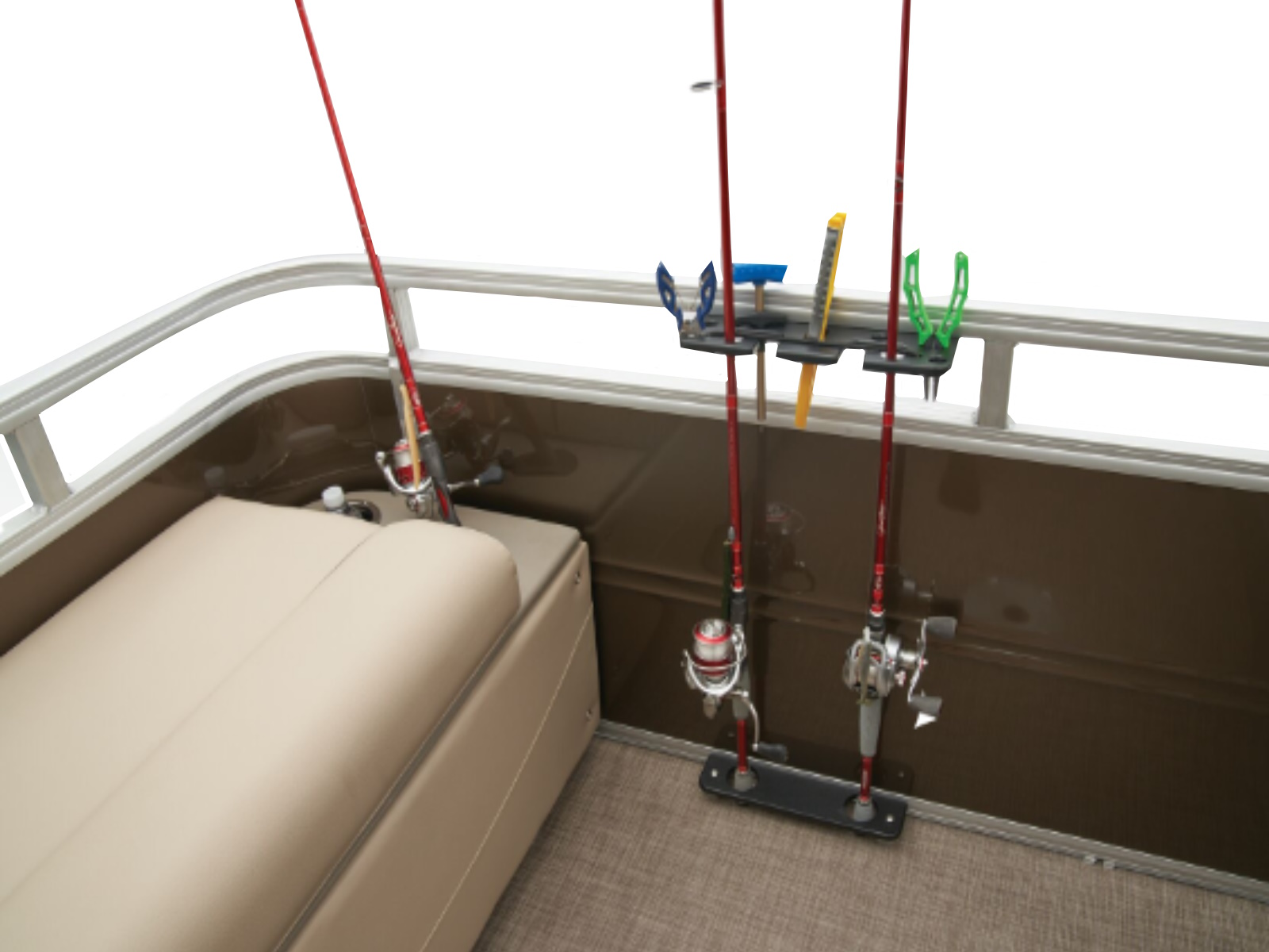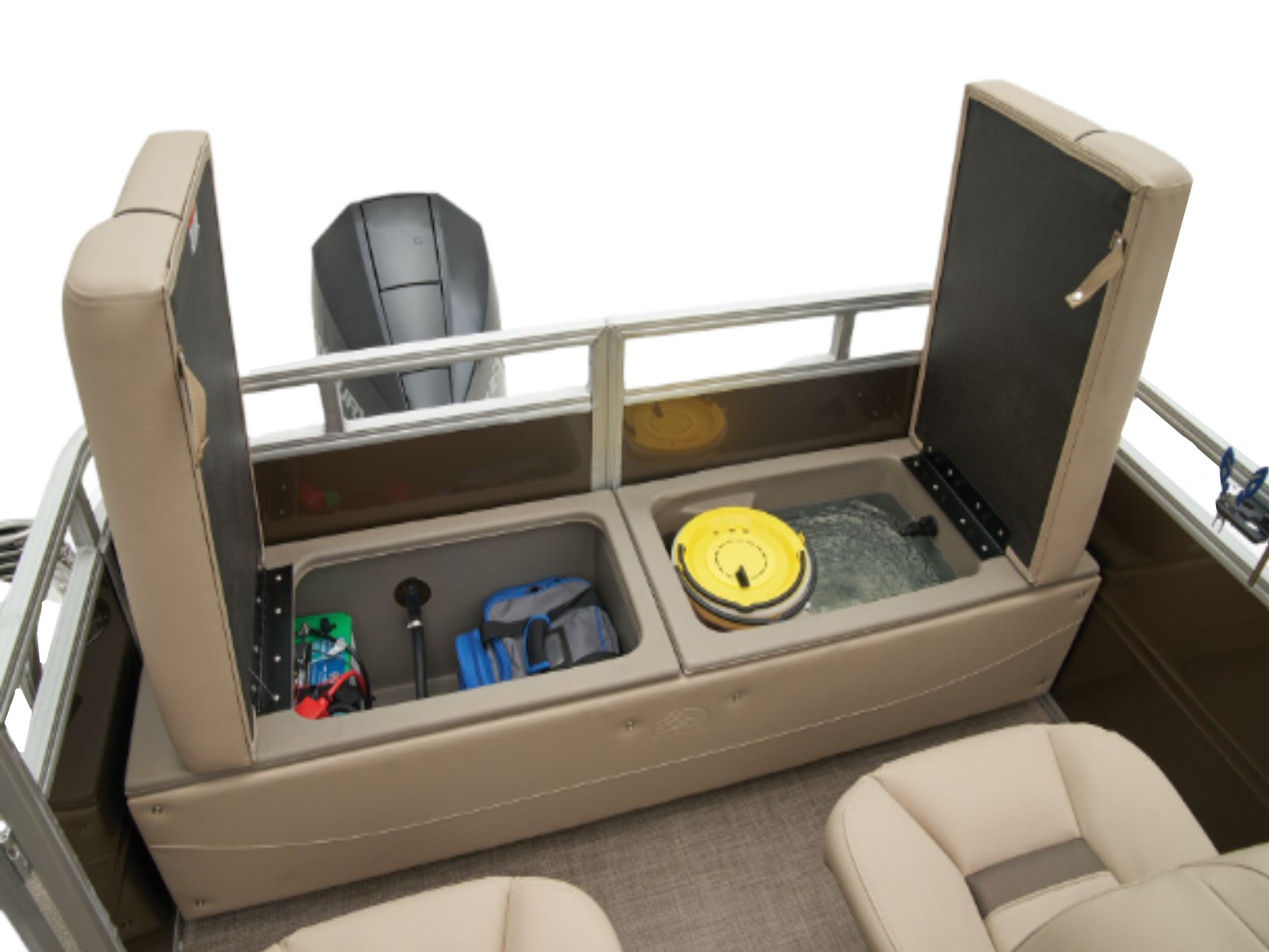 - Aft fishing station w/2 pedestal seat bases; rail-mounted rod & tool holders; STOW MORE™ tackle storage station; & rear-facing tackle storage