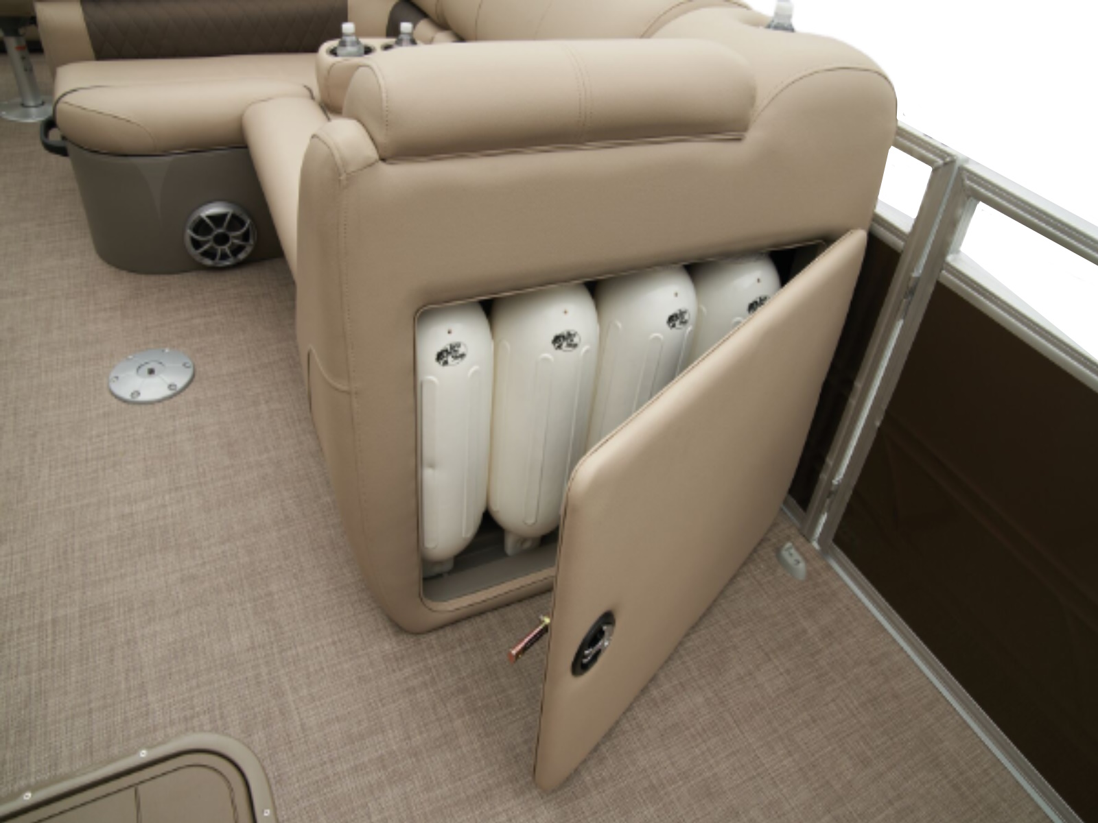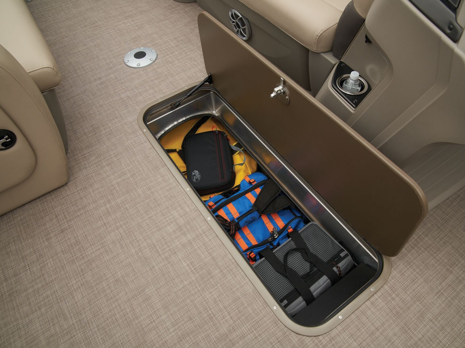 - In-floor lighted storage compartment — 88" (2.24 m) long, 23" (58.42 cm) deep — w/bilge pump in center log