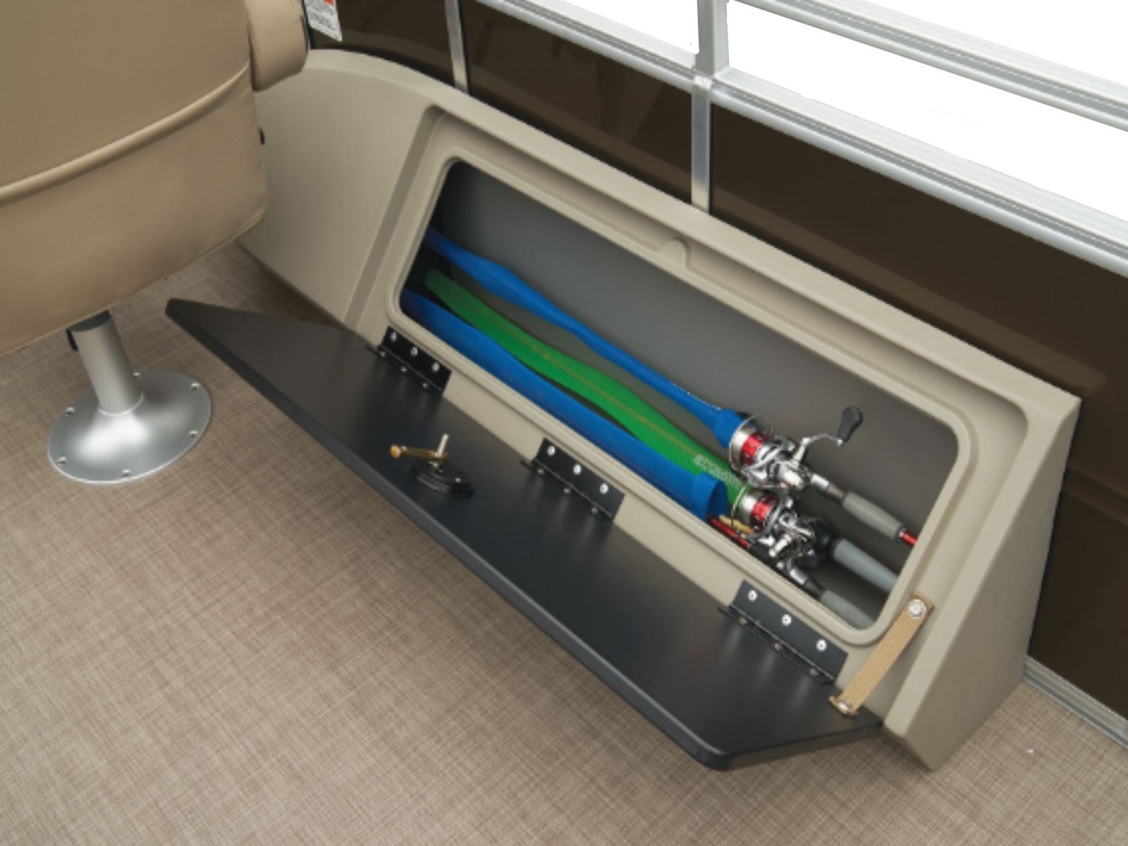 - Aft starboard lockable rod box for 6 rods to 7' 6" (2.29 m) w/lid, rod tube holders & organizer