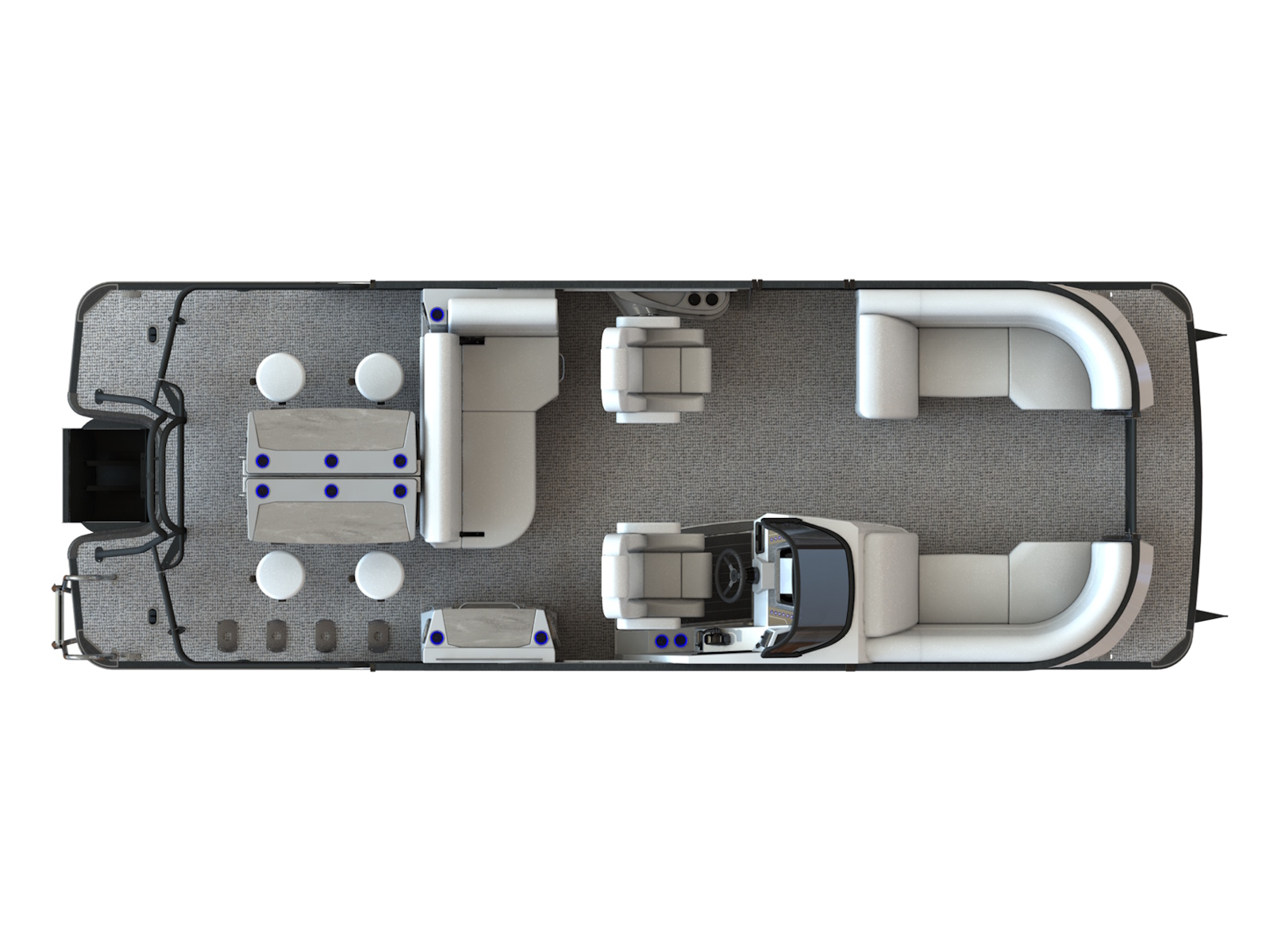 The Sylvan Pontoon G3 DLZ DH Bar offers a unique bar seating configuration combined with a dual-helm layout for both functionality and entertainment. Its spacious design includes plush seating, a built-in bar top, and premium features for a luxurious boating experience. Engineered for performance, it delivers smooth handling and a quiet, comfortable ride. With its sleek style and versatile layout, it's perfect for hosting gatherings or enjoying relaxing days on the water.
