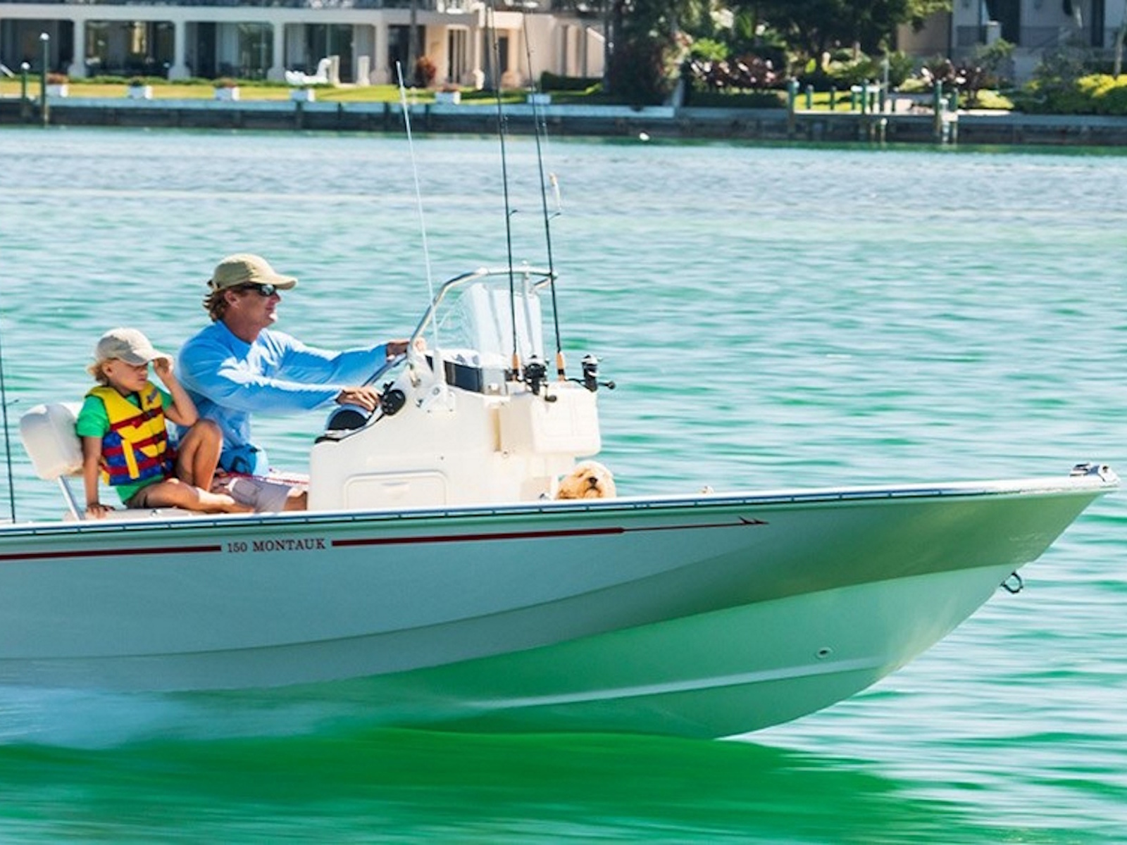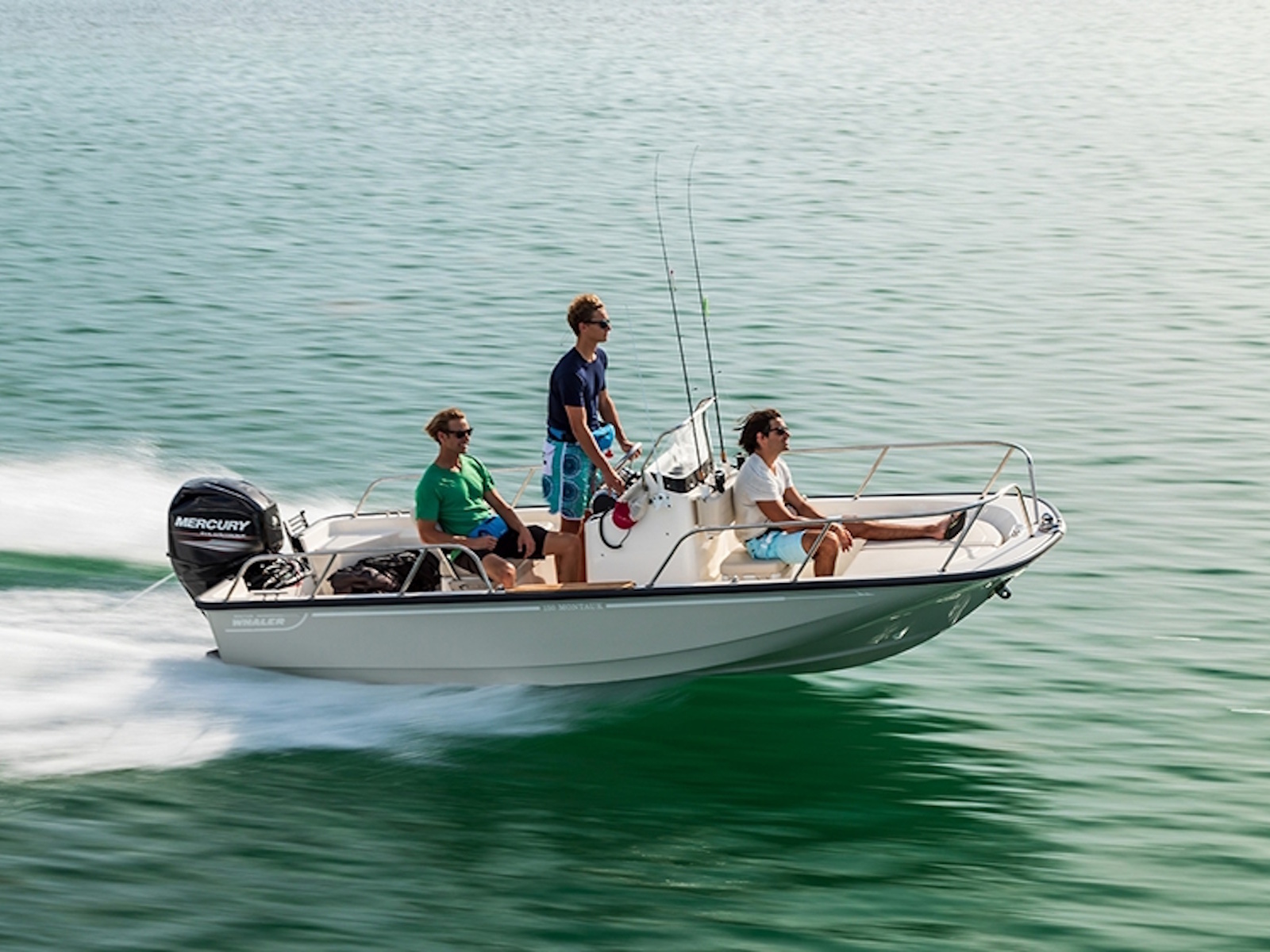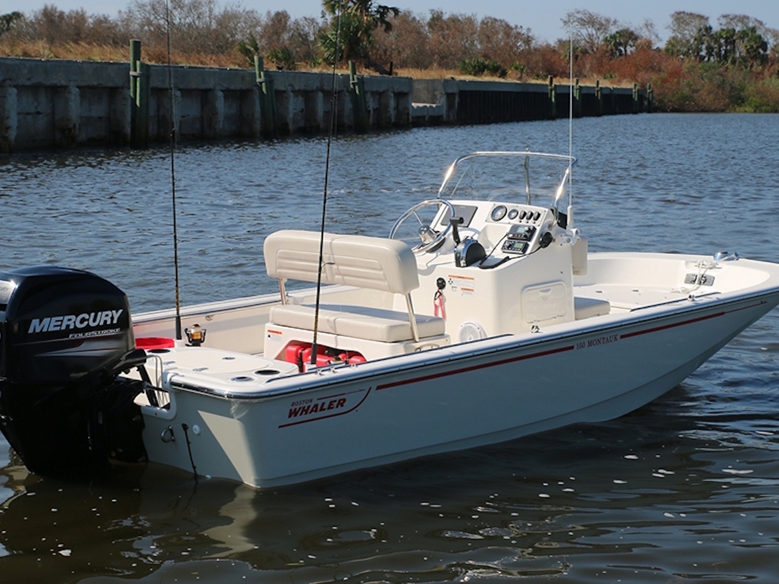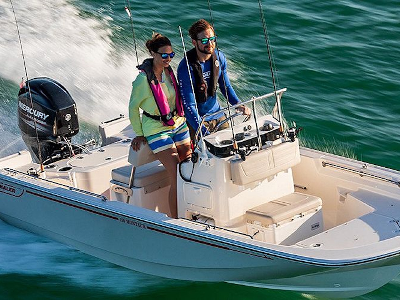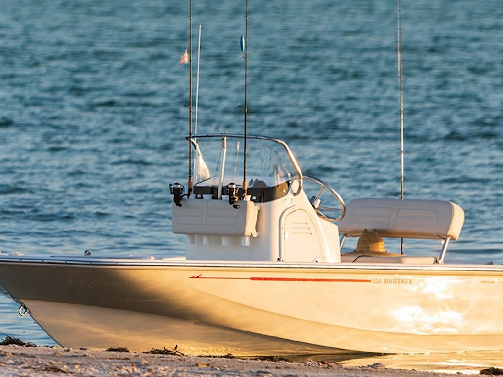 The most compact member of the proven Montauk family is a durable, stylish, and versatile 15-foot center console boat that can easily take you from the canal to the bay to the beach. Traditional lines and Boston Whaler’s legendary unsinkable hull combine for a smooth, soft ride with up to 60 horses moving it briskly through the water. The roomy layout features a fiberglass leaning post, and an optional fishing package makes it a capable inshore angler. The Montauk 150 is truly a small wonder—as easy to operate as it is to own.