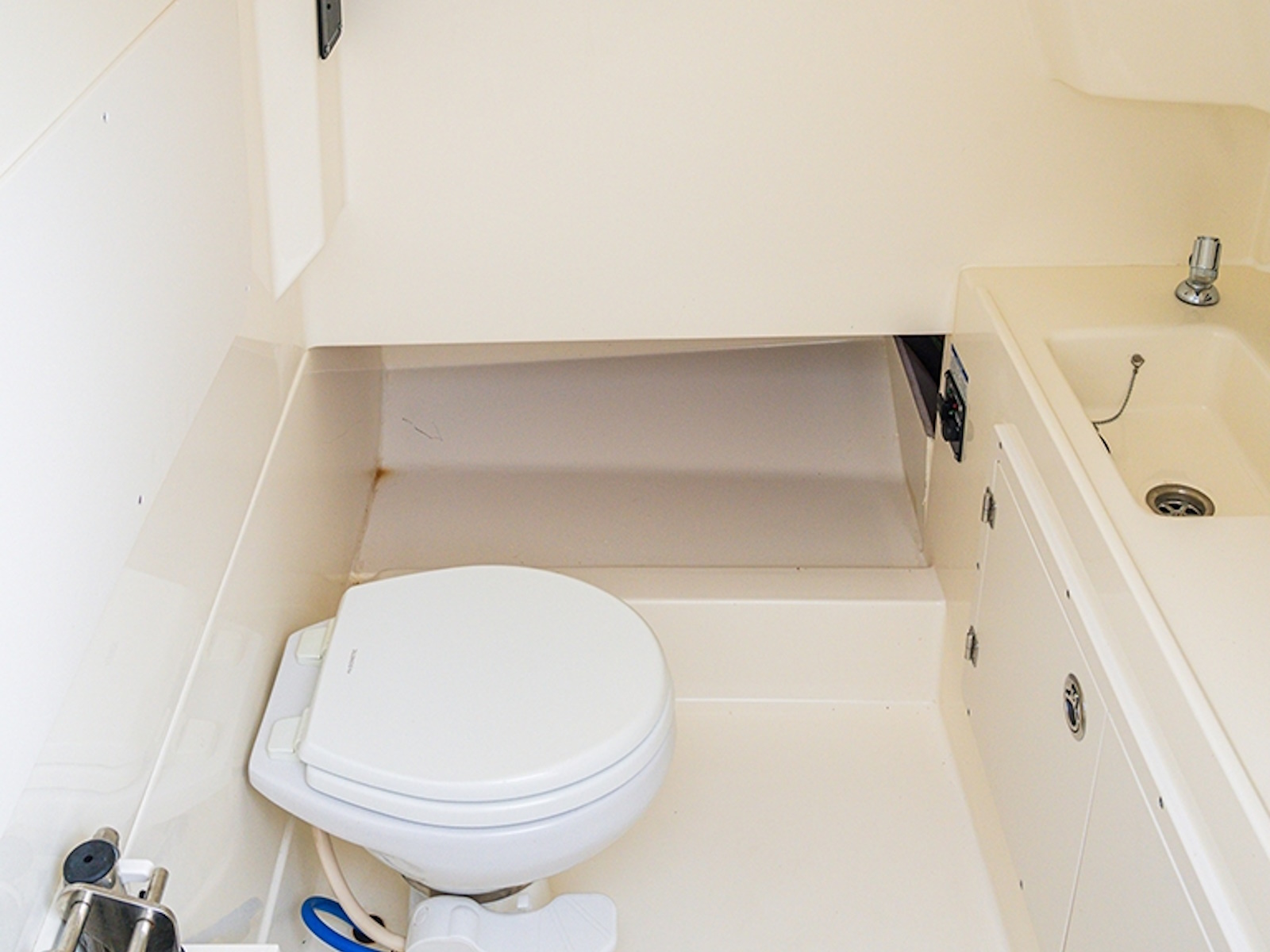 - Large private enclosed head compartment in the console features a VacuFlush toilet, porthole and storage space