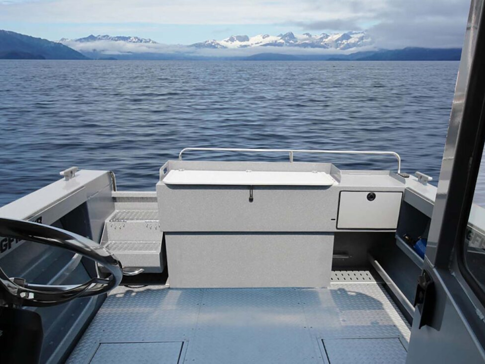 - Transom fish locker with cutting board and fish rail