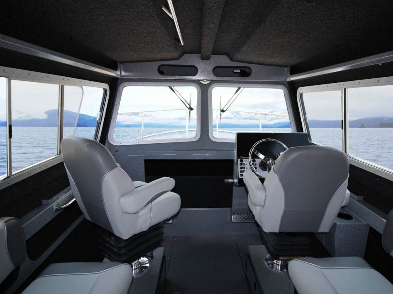 - Forward sloping windshield with aluminum framed tempered glass front windows, 2 aluminum framed sliding side windows with screens plus 2 fixed aft side windows