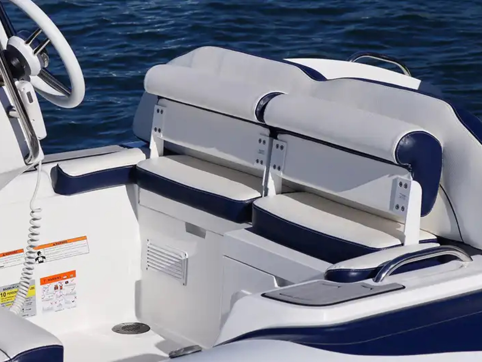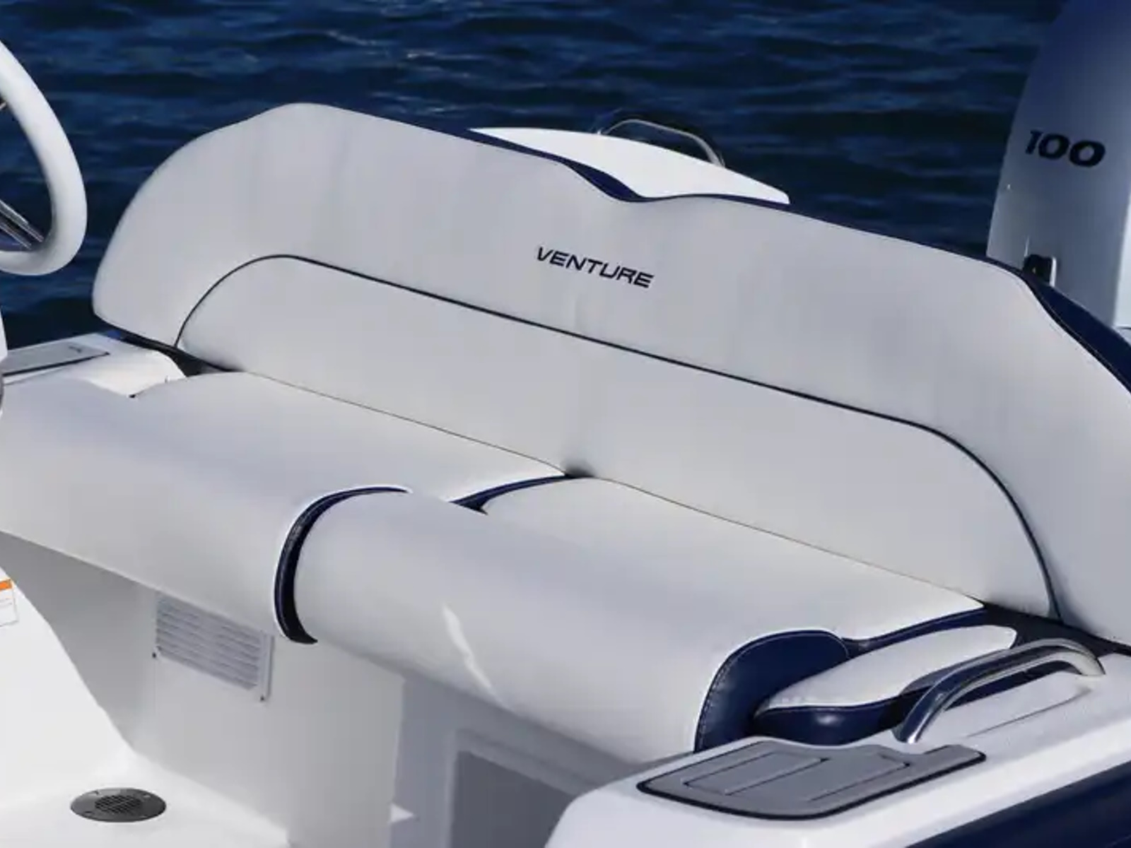 The rear seat in the Venture 16 is wider than any other boat in its class. The cushions are thick and the deep seats and extra legroom allow the driver and rear seat passenger to fully stretch their legs out. The flip up bolster on the passenger side gives the passenger different seating options and frees up deck space.